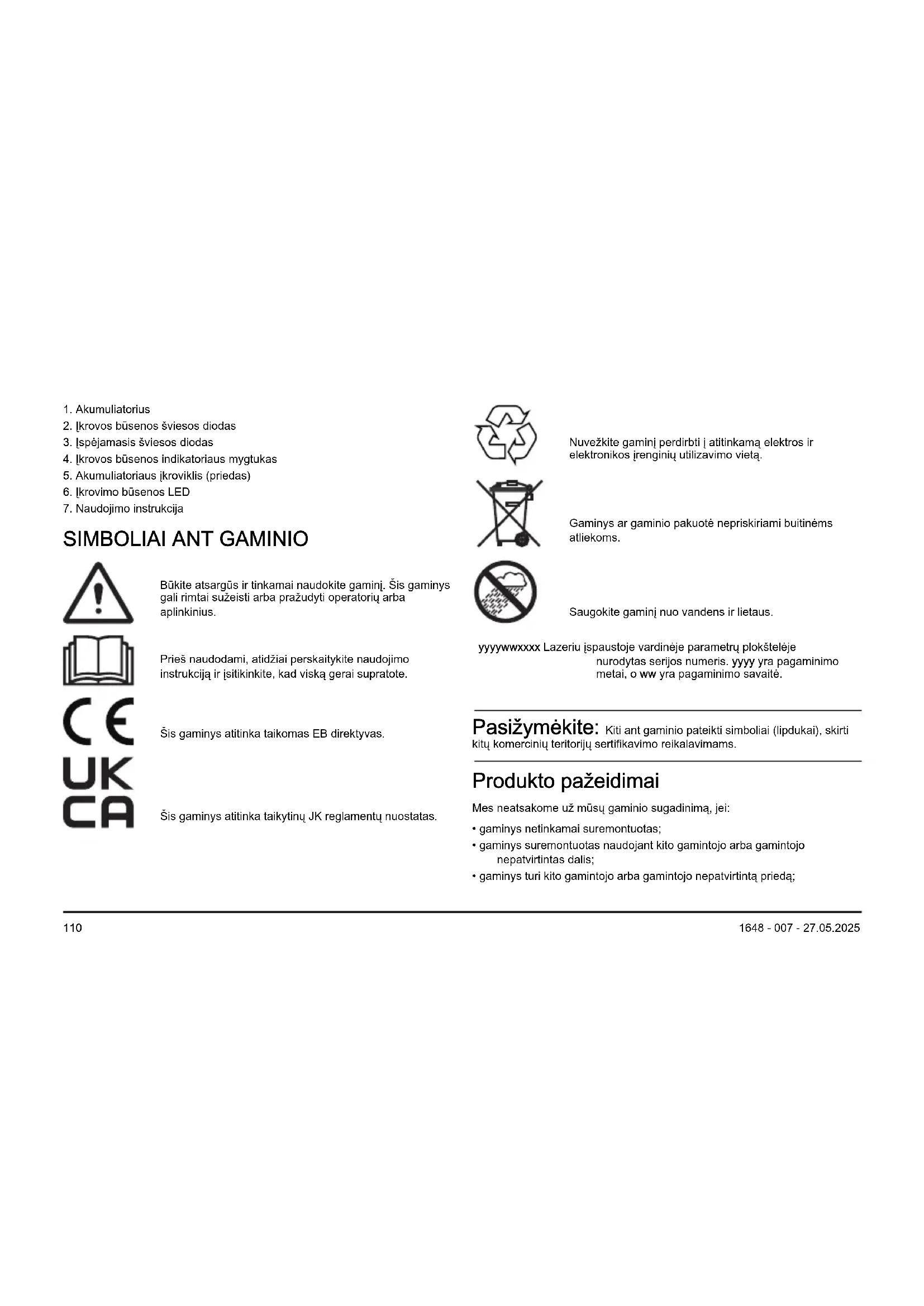 Būkite atsargūs ir tinkamai naudokite gaminį. Šis gaminys gali rimtai sužeisti arba pražudyti operatorių arba aplinkinius. Prieš naudodami, atidžiai perskaitykite naudojimo instrukciją ir įsitikinkite, kad viską gerai supratote. Šis gaminys atitinka taikomas EB direktyvas. Šis gaminys atitinka taikytinų JK reglamentų nuostatas. Nuvežkite gaminį perdirbti į atitinkamą elektros ir elektronikos įrenginių utilizavimo vietą. Gaminys ar gaminio pakuotė nepriskiriami buitinėms atliekoms. Saugokite gaminį nuo vandens ir lietaus. yyyywwxxxx Lazeriu įspaustoje vardinėje parametrų plokštelėje nurodytas serijos numeris. yyyy yra pagaminimo metai, o ww yra pagaminimo savaitė. Pasižymėkite: Kiti ant gaminio pateikti simboliai (lipdukai), skirti kitų komercinių teritorijų sertifikavimo reikalavimams. Produkto pažeidimai Mes neatsakome už mūsų gaminio sugadinimą, jei: