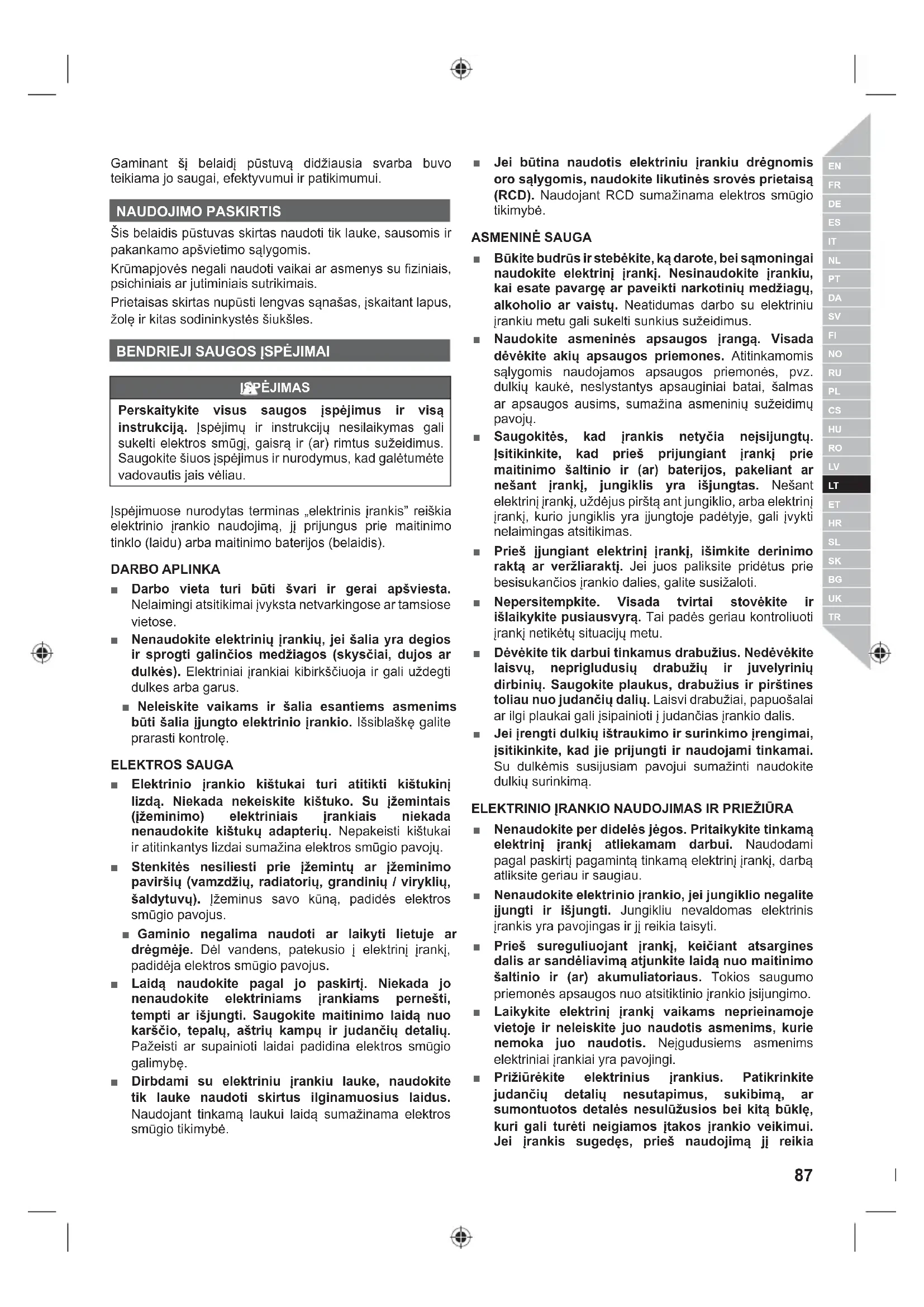 ĮSPĖJIMAS Perskaitykite visus saugos įspėjimus ir visą instrukciją. Įspėjimų ir instrukcijų nesilaikymas gali sukelti elektros smūgį, gaisrą ir (ar) rimtus sužeidimus. Saugokite šiuos įspėjimus ir nurodymus, kad galėtumėte vadovautis jais vėliau. Įspėjimuose nurodytas terminas „elektrinis įrankis” reiškia elektrinio įrankio naudojimą, jį prijungus prie maitinimo tinklo (laidu) arba maitinimo baterijos (belaidis). DARBO APLINKA ■ Darbo vieta turi būti švari ir gerai apšviesta. Nelaimingi atsitikimai įvyksta netvarkingose ar tamsiose vietose. ■ Nenaudokite elektrinių įrankių, jei šalia yra degios ir sprogti galinčios medžiagos (skysčiai, dujos ar dulkės). Elektriniai įrankiai kibirkščiuoja ir gali uždegti dulkes arba garus. ■ Neleiskite vaikams ir šalia esantiems asmenims būti šalia įjungto elektrinio įrankio. Išsiblaškę galite prarasti kontrolę. ELEKTROS SAUGA ■ Elektrinio įrankio kištukai turi atitikti kištukinį lizdą. Niekada nekeiskite kištuko. Su įžemintais (įžeminimo) elektriniais įrankiais niekada nenaudokite kištukų adapterių. Nepakeisti kištukai ir atitinkantys lizdai sumažina elektros smūgio pavojų. ■ Stenkitės nesiliesti prie įžemintų ar įžeminimo paviršių (vamzdžių, radiatorių, grandinių / viryklių, šaldytuvų). Įžeminus savo kūną, padidės elektros smūgio pavojus. ■ Gaminio negalima naudoti ar laikyti lietuje ar drėgmėje. Dėl vandens, patekusio į elektrinį įrankį, padidėja elektros smūgio pavojus. ■ Laidą naudokite pagal jo paskirtį. Niekada jo nenaudokite elektriniams įrankiams pernešti, tempti ar išjungti. Saugokite maitinimo laidą nuo karščio, tepalų, aštrių kampų ir judančių detalių. Pažeisti ar supainioti laidai padidina elektros smūgio galimybę. ■ Dirbdami su elektriniu įrankiu lauke, naudokite tik lauke naudoti skirtus ilginamuosius laidus. Naudojant tinkamą laukui laidą sumažinama elektros smūgio tikimybė. ■ Jei būtina naudotis elektriniu įrankiu drėgnomis oro sąlygomis, naudokite likutinės srovės prietaisą (RCD). Naudojant RCD sumažinama elektros smūgio tikimybė. ASMENINĖ SAUGA ■ Būkite budrūs ir stebėkite, ką darote, bei sąmoningai naudokite elektrinį įrankį. Nesinaudokite įrankiu, kai esate pavargę ar paveikti narkotinių medžiagų, alkoholio ar vaistų. Neatidumas darbo su elektriniu įrankiu metu gali sukelti sunkius sužeidimus. ■ Naudokite asmeninės apsaugos įrangą. Visada dėvėkite akių apsaugos priemones. Atitinkamomis sąlygomis naudojamos apsaugos priemonės, pvz. dulkių kaukė, neslystantys apsauginiai batai, šalmas ar apsaugos ausims, sumažina asmeninių sužeidimų pavojų. ■ Saugokitės, kad įrankis netyčia neįsijungtų. Įsitikinkite, kad prieš prijungiant įrankį prie maitinimo šaltinio ir (ar) baterijos, pakeliant ar nešant įrankį, jungiklis yra išjungtas. Nešant elektrinį įrankį, uždėjus pirštą ant jungiklio, arba elektrinį įrankį, kurio jungiklis yra įjungtoje padėtyje, gali įvykti nelaimingas atsitikimas. ■ Prieš įjungiant elektrinį įrankį, išimkite derinimo raktą ar veržliaraktį. Jei juos paliksite pridėtus prie besisukančios įrankio dalies, galite susižaloti. ■ Nepersitempkite. Visada tvirtai stovėkite ir išlaikykite pusiausvyrą. Tai padės geriau kontroliuoti įrankį netikėtų situacijų metu. ■ Dėvėkite tik darbui tinkamus drabužius. Nedėvėkite laisvų, neprigludusių drabužių ir juvelyrinių dirbinių. Saugokite plaukus, drabužius ir pirštines toliau nuo judančių dalių. Laisvi drabužiai, papuošalai ar ilgi plaukai gali įsipainioti į judančias įrankio dalis. ■ Jei įrengti dulkių ištraukimo ir surinkimo įrengimai, įsitikinkite, kad jie prijungti ir naudojami tinkamai. Su dulkėmis susijusiam pavojui sumažinti naudokite dulkių surinkimą. ELEKTRINIO ĮRANKIO NAUDOJIMAS IR PRIEŽIŪRA ■ Nenaudokite per didelės jėgos. Pritaikykite tinkamą elektrinį įrankį atliekamam darbui. Naudodami pagal paskirtį pagamintą tinkamą elektrinį įrankį, darbą atliksite geriau ir saugiau. ■ Nenaudokite elektrinio įrankio, jei jungiklio negalite įjungti ir išjungti. Jungikliu nevaldomas elektrinis įrankis yra pavojingas ir jį reikia taisyti. ■ Prieš sureguliuojant įrankį, keičiant atsargines dalis ar sandėliavimą atjunkite laidą nuo maitinimo šaltinio ir (ar) akumuliatoriaus. Tokios saugumo priemonės apsaugos nuo atsitiktinio įrankio įsijungimo. ■ Laikykite elektrinį įrankį vaikams neprieinamoje vietoje ir neleiskite juo naudotis asmenims, kurie nemoka juo naudotis. Neįgudusiems asmenims elektriniai įrankiai yra pavojingi. ■ Prižiūrėkite elektrinius įrankius. Patikrinkite judančių detalių nesutapimus, sukibimą, ar sumontuotos detalės nesulūžusios bei kitą būklę, kuri gali turėti neigiamos įtakos įrankio veikimui. Jei įrankis sugedęs, prieš naudojimą jį reikia88 | Lietuviškai suremontuoti. Nemažai nelaimingų atsitikimų įvyksta dėl netinkamai prižiūrimų elektrinių įrankių. ■ Pjovimo įrankius reikia pastoviai galąsti ir valyti. Tinkamai prižiūrėti aštriais ašmenimis pjovimo įrankiai mažiau stringa ir juos lengviau valdyti. ■ Naudokite elektrinius įrankius, atsargines detales, grąžtus ir t. t., pagal šias instrukcijas ir atsižvelgdami į darbo sąlygas bei turimą atlikti darbą. Naudokite elektrinį įrankį tik pagal tiesioginę paskirtį, kitaip sukelsite pavojingą situaciją.