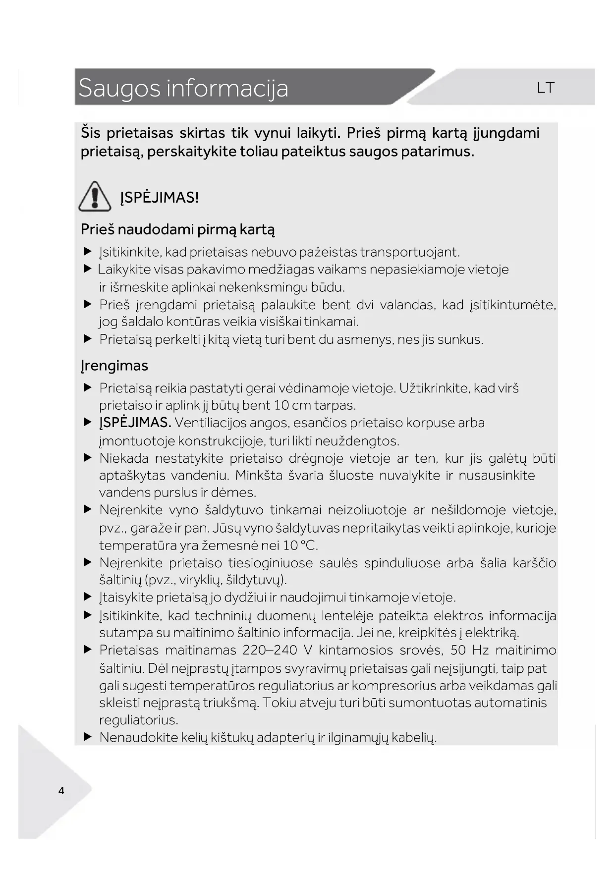 - JSPÉJIMAS. Neděkite elektrós jrenginių šj prietaisą, nebent jie atitinka gamintojo rekomendaciję. Siekiant iśvengti rizikos, paźiste są maitinimo laidą turi pakeisti klienu aptarnavimo skyrius (žr. garantné kortele).