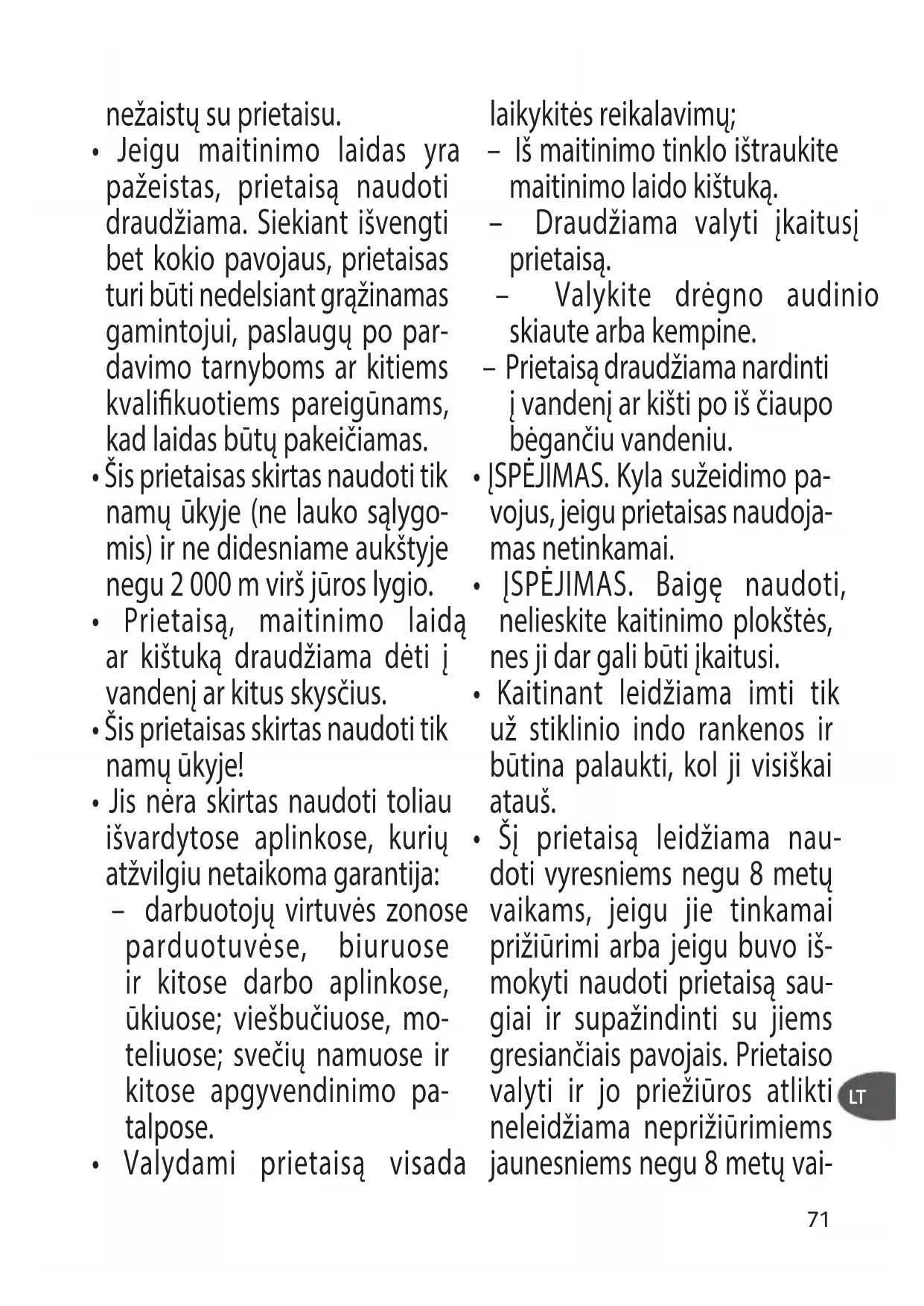 - Šį prietaisą leidžiama nau- doti vyresniems negu 8 metų vaikams, jeigu jie tinkamai prižiūrimi arba jeigu buvo iš- mokyti naudoti prietaisą sau- giai ir supažindinti su jiems gresiančiais pavojais. Prietaiso valyti ir jo priežiūros atlikti neleidžiama neprižiūrimiems jaunesniems negu 8 metų vai-72 kams.