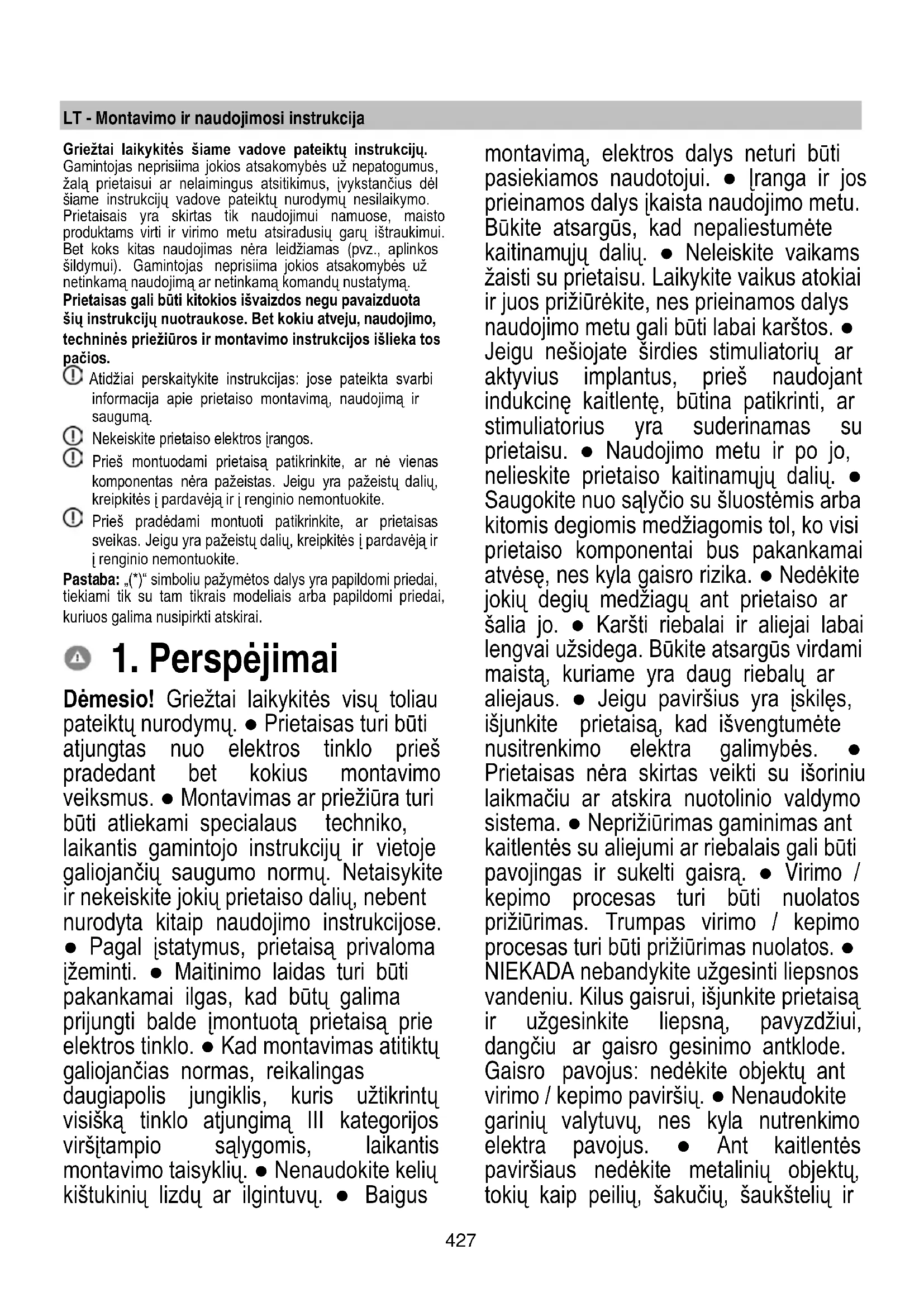Dėmesio! Griežtai laikykitės visų toliau pateiktų nurodymų. ● Prietaisas turi būti atjungtas nuo elektros tinklo prieš pradedant bet kokius montavimo veiksmus. ● Montavimas ar priežiūra turi būti atliekami specialaus techniko, laikantis gamintojo instrukcijų ir vietoje galiojančių saugumo normų. Netaisykite ir nekeiskite jokių prietaiso dalių, nebent nurodyta kitaip naudojimo instrukcijose. ● Pagal įstatymus, prietaisą privaloma įžeminti. ● Maitinimo laidas turi būti pakankamai ilgas, kad būtų galima prijungti balde įmontuotą prietaisą prie elektros tinklo. ● Kad montavimas atitiktų galiojančias normas, reikalingas daugiapolis jungiklis, kuris užtikrintų visišką tinklo atjungimą III kategorijos viršįtampio sąlygomis, laikantis montavimo taisyklių. ● Nenaudokite kelių kištukinių lizdų ar ilgintuvų. ● Baigus montavimą, elektros dalys neturi būti pasiekiamos naudotojui. ● Įranga ir jos prieinamos dalys įkaista naudojimo metu. Būkite atsargūs, kad nepaliestumėte kaitinamųjų dalių. ● Neleiskite vaikams žaisti su prietaisu. Laikykite vaikus atokiai ir juos prižiūrėkite, nes prieinamos dalys naudojimo metu gali būti labai karštos. ● Jeigu nešiojate širdies stimuliatorių ar aktyvius implantus, prieš naudojant indukcinę kaitlentę, būtina patikrinti, ar stimuliatorius yra suderinamas su prietaisu. ● Naudojimo metu ir po jo, nelieskite prietaiso kaitinamųjų dalių. ● Saugokite nuo sąlyčio su šluostėmis arba kitomis degiomis medžiagomis tol, ko visi prietaiso komponentai bus pakankamai atvėsę, nes kyla gaisro rizika. ● Nedėkite jokių degių medžiagų ant prietaiso ar šalia jo. ● Karšti riebalai ir aliejai labai lengvai užsidega. Būkite atsargūs virdami maistą, kuriame yra daug riebalų ar aliejaus. ● Jeigu paviršius yra įskilęs, išjunkite prietaisą, kad išvengtumėte nusitrenkimo elektra galimybės. ● Prietaisas nėra skirtas veikti su išoriniu laikmačiu ar atskira nuotolinio valdymo sistema. ● Neprižiūrimas gaminimas ant kaitlentės su aliejumi ar riebalais gali būti pavojingas ir sukelti gaisrą. ● Virimo / kepimo procesas turi būti nuolatos prižiūrimas. Trumpas virimo / kepimo procesas turi būti prižiūrimas nuolatos. ● NIEKADA nebandykite užgesinti liepsnos vandeniu. Kilus gaisrui, išjunkite prietaisą ir užgesinkite liepsną, pavyzdžiui, dangčiu ar gaisro gesinimo antklode. Gaisro pavojus: nedėkite objektų ant virimo / kepimo paviršių. ● Nenaudokite garinių valytuvų, nes kyla nutrenkimo elektra pavojus. ● Ant kaitlentės paviršiaus nedėkite metalinių objektų, tokių kaip peilių, šakučių, šaukštelių ir428 dangčių, nes ji gali perkaisti. ● Prieš prijungdami prietaisą prie elektros energijos tinklo: patikrinkite duomenų lentelę (apatinėje prietaiso dalyje), kad įsitikintumėte, jog įtampa ir galia atitinka tinklo įtampą bei galią ir prijungimo lizdas yra tinkamas. Kilus dvejonėms, kreipkitės į kvalifikuotą elektriką. Svarbu. ● Baigę naudotis, išjunkite kaitlentę valdymo įtaisu, o ne remkitės puodų detektoriumi. ● Stenkitės, kad skysčiai neišbėgtų, todėl virdami ar šildydami skysčius sumažinkite karštį. ● Kaitinančiųjų dalių nepalikite įjungtų puodams ar keptuvėms esant tuščioms ir jeigu ant kaitlentės nėra ko šildyti. ● Baigę gaminti valgį, išjunkite naudotą kaitinimo zoną. ● Maistui gaminti niekada nenaudokite aliuminio folijos ir niekada tiesiai nedėkite aliuminiu supakuotų gaminių. Aliuminis prilips ir nepataisomai sugadins jūsų prietaisą. ● Niekada nešildykite skardinių su maistu prieš tai jų neatidarę: jos gali sprogti! Šis perspėjimas taikomas ir visų kitų rūšių kaitlentėms. ● Padidintos galios naudojimas, pavyzdžiui, „Booster“ funkcija, nėra pritaikyta kai kurių skysčių, tokių kaip kepimo aliejus, šildymui. Per didelis karštis gali būti pavojingas. Tokiais atvejais, patariame naudoti mažesnę galią. ● Indai turi būti uždėti tiesiogiai kaitlentės centre. Jokiais būdais nedėkite kokių nors objektų tarp puodo ar keptuvės ir kaitlentės paviršiaus. ● Esant per aukštai temperatūrai, prietaisas automatiškai sumažina kaitinimo zonų galios lygį. ● Prieš kiekvieną valymo arba priežiūros operaciją išjunkite prietaisą iš elektros tinklo, ištraukdami kištuką arba išjungdami kambario pagrindinį jungiklį. ● Visų montavimo ir priežiūros darbų metu mūvėkite darbines pirštines. ● Prietaisą gali naudoti ne mažesni nei 8 metų vaikai ir fizinę, jutiminę arba protinę negalią turintys asmenys arba asmenys, neturintys patirties arba reikalingų žinių, jei jie yra prižiūrimi arba jei jiems buvo pateiktos instrukcijos apie saugų prietaiso naudojimą ir su juo susijusius pavojus. ● Reikia prižiūrėti vaikus, kad jie nežaistų su prietaisu. ● Draudžiama atlikti priežiūrą ir valyti vaikams be priežiūros. ● Jei prietaisas naudojamas vienu metu su kitais dujas arba kitą kurą naudojančiais prietaisais, patalpoje turi būti užtikrinta pakankama ventiliacija. ● Prietaiso vidų ir išorę reikia dažnai nuvalyti (BENT KARTĄ PER MĖNESĮ). Bet kokiu atveju, laikykitės priežiūros instrukcijose nurodytos informacijos. ● Nesilaikant prietaiso valymo bei filtrų keitimo ir valymo taisyklių, kyla gaisro rizika. ● Griežtai draudžiama kepti atviroje liepsnoje. ● Atvira ugnis kenkia filtrams ir gali sukelti gaisrą, todėl jos jokiu būdu negalima naudoti. ● Kepant aliejuje būtina nuolatinė priežiūra, kad perkaitęs aliejus neužsidegtų. -● DĖMESIO: kaitlentei esant įjungtai, prieinamos prietaiso dalys gali įkaisti. ● Dėmesio! Nejunkite prietaiso prie elektros tinklo, kol visiškai jo nesumontuosite. ● Dūmų šalinimui reikia taikyti technines ir saugos priemones, griežtai vadovaujantis vietinėmis kompetentingų institucijų reglamentuose numatytomis nuostatomis