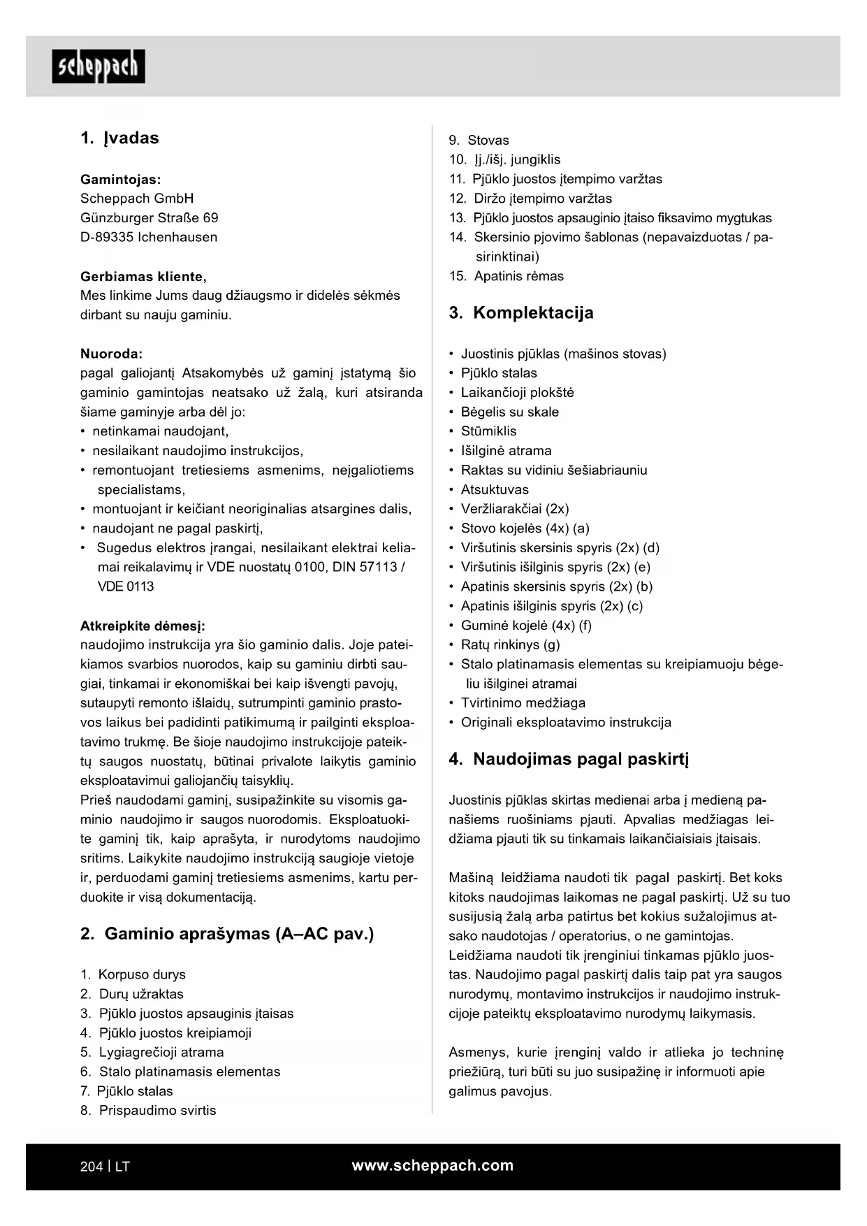 Gamintojas: Scheppach GmbH Günzburger Straße 69 D-89335 Ichenhausen Gerbiamas kliente, Mes linkime Jums daug džiaugsmo ir didelės sėkmės dirbant su nauju gaminiu. Nuoroda: pagal galiojantį Atsakomybės už gaminį įstatymą šio gaminio gamintojas neatsako už žalą, kuri atsiranda šiame gaminyje arba dėl jo: