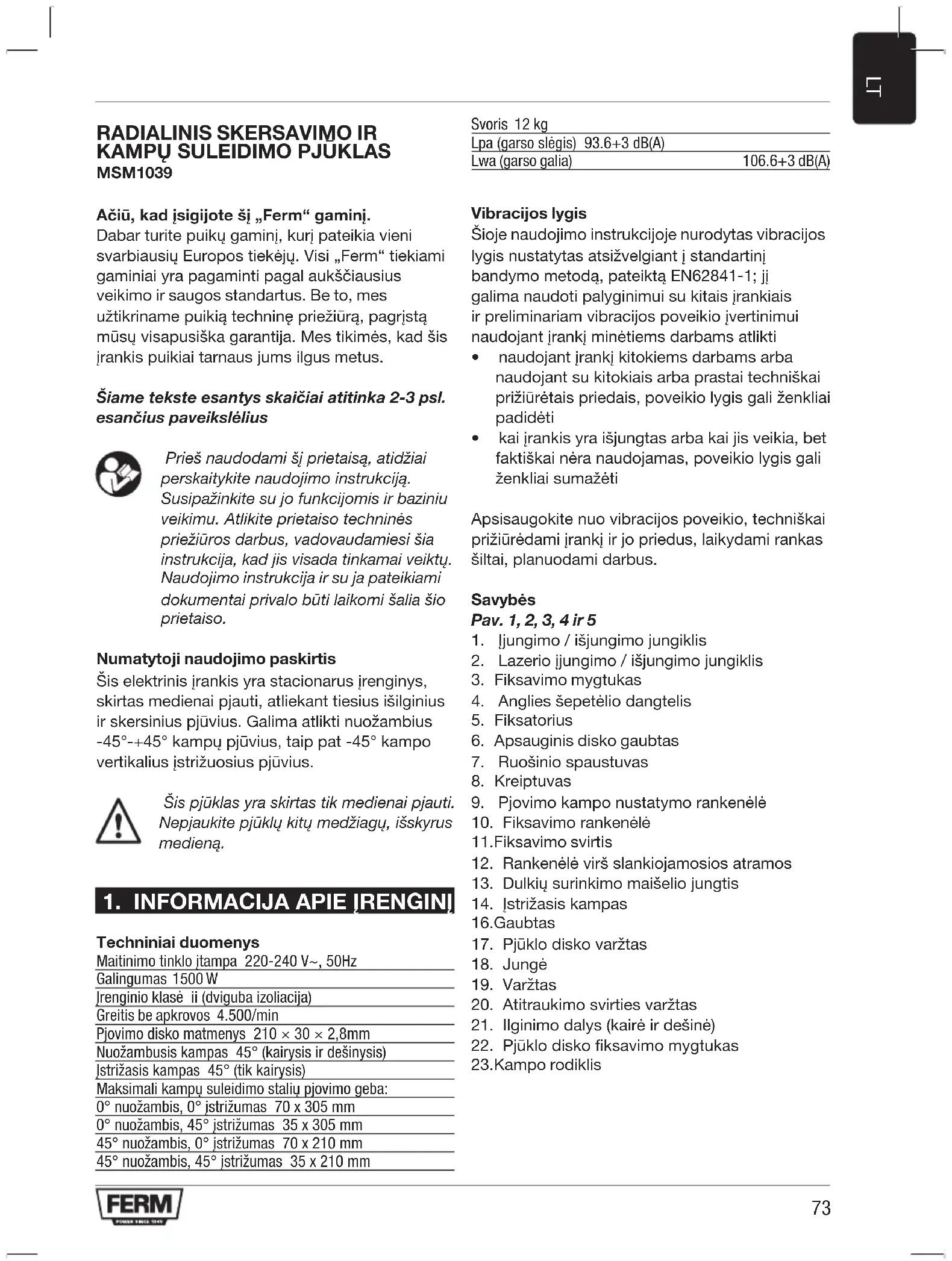 MSM1039 Ačiū, kad įsigijote šį „Ferm“ gaminį. Dabar turite puikų gaminį, kurį pateikia vieni svarbiausių Europos tiekėjų. Visi „Ferm“ tiekiami gaminiai yra pagaminti pagal aukščiausius veikimo ir saugos standartus. Be to, mes užtikriname puikią techninę priežiūrą, pagrįstą mūsų visapusiška garantija. Mes tikimės, kad šis įrankis puikiai tarnaus jums ilgus metus. Šiame tekste esantys skaičiai atitinka 2-3 psl. esančius paveikslėlius Priešnaudodamišįprietaisą,atidžiai perskaitykitenaudojimoinstrukciją. Susipažinkitesujofunkcijomisirbaziniu veikimu.Atlikiteprietaisotechninės priežiūrosdarbus,vadovaudamiesišia instrukcija,kadjisvisadatinkamaiveiktų. Naudojimo instrukcija ir su ja pateikiami dokumentaiprivalobūtilaikomišaliašio prietaiso. Numatytoji naudojimo paskirtis Šis elektrinis įrankis yra stacionarus įrenginys, skirtas medienai pjauti, atliekant tiesius išilginius ir skersinius pjūvius. Galima atlikti nuožambius -45°-+45° kampų pjūvius, taip pat -45° kampo vertikalius įstrižuosius pjūvius. Šispjūklasyraskirtastikmedienaipjauti. Nepjaukitepjūklųkitųmedžiagų,išskyrus medieną.