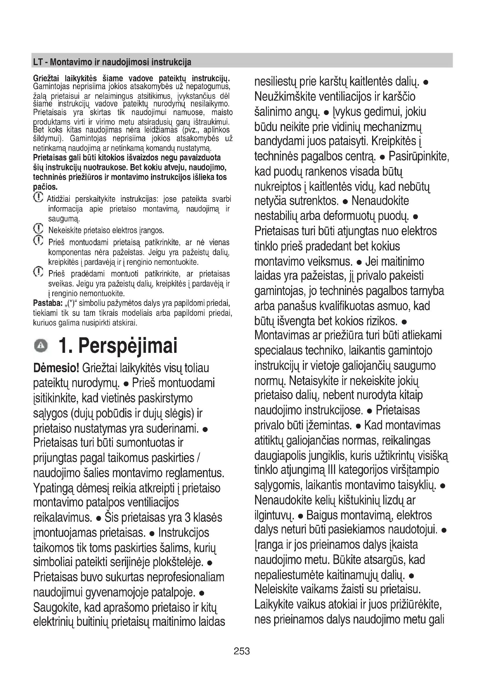 - seerianumber (S/N) Need andmed leiate seadmele ja/või pakendile kinnitatud andmesildilt. ! Ärge kasutage volitamata tehnikute teenuseid ning lubage seadmele paigaldada ainult originaalvaruosi253 LT - Montavimo ir naudojimosi instrukcija Griežtai laikykitės šiame vadove pateiktų instrukcijų. Gamintojas neprisiima jokios atsakomybės už nepatogumus, žalą prietaisui ar nelaimingus atsitikimus, įvykstančius dėl šiame instrukcijų vadove pateiktų nurodymų nesilaikymo. Prietaisais yra skirtas tik naudojimui namuose, maisto produktams virti ir virimo metu atsiradusių garų ištraukimui. Bet koks kitas naudojimas nėra leidžiamas (pvz., aplinkos šildymui). Gamintojas neprisiima jokios atsakomybės už netinkamą naudojimą ar netinkamą komandų nustatymą. Prietaisas gali būti kitokios išvaizdos negu pavaizduota šių instrukcijų nuotraukose. Bet kokiu atveju, naudojimo, techninės priežiūros ir montavimo instrukcijos išlieka tos pačios. Atidžiai perskaitykite instrukcijas: jose pateikta svarbi informacija apie prietaiso montavimą, naudojimą ir saugumą. Nekeiskite prietaiso elektros įrangos. Prieš montuodami prietaisą patikrinkite, ar nė vienas komponentas nėra pažeistas. Jeigu yra pažeistų dalių, kreipkitės į pardavėją ir į renginio nemontuokite. Prieš pradėdami montuoti patikrinkite, ar prietaisas sveikas. Jeigu yra pažeistų dalių, kreipkitės į pardavėją ir į renginio nemontuokite. Pastaba: „(*)“ simboliu pažymėtos dalys yra papildomi priedai, tiekiami tik su tam tikrais modeliais arba papildomi priedai, kuriuos galima nusipirkti atskirai.