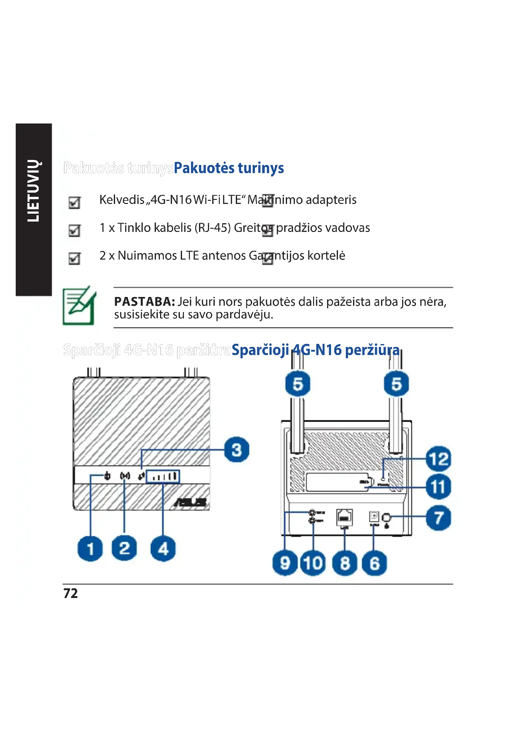 Umidità di esercizio ≤ 90% Archiviazione ≤ 95%72 LIETUVIŲ PASTABA: Jei kuri nors pakuotės dalis pažeista arba jos nėra, susisiekite su savo pardavėju. Pakuotės turinysPakuotės turinys Kelvedis „4G-N16 Wi-Fi LTE“ Maitinimo adapteris 1 x Tinklo kabelis (RJ-45) Greitos pradžios vadovas 2 x Nuimamos LTE antenos Garantijos kortelė Sparčioji 4G-N16 peržiūraSparčioji 4G-N16 peržiūra Lietuvių73 LIETUVIŲ