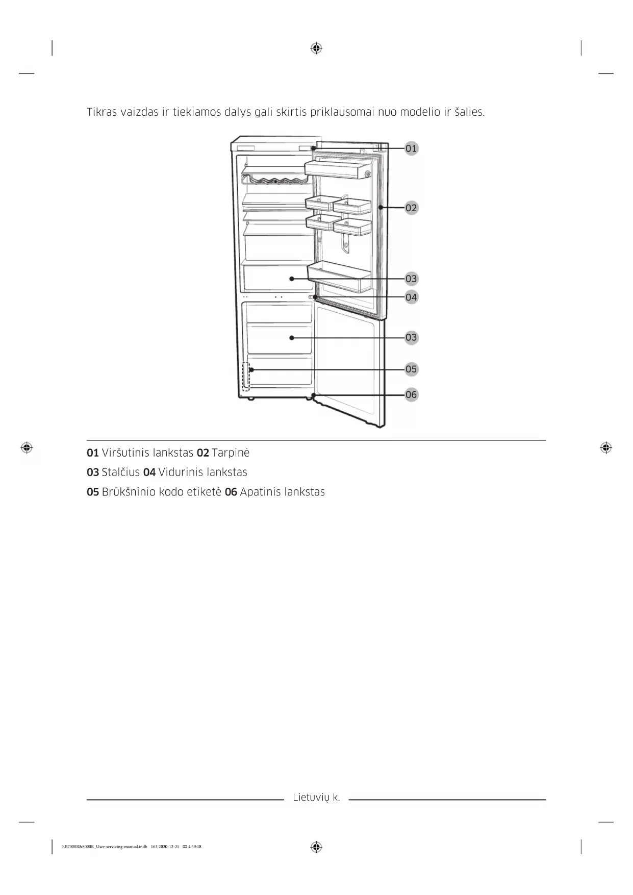 Atidarykite dureles ir nuimkite nuo jų tarpinę. Kaip uždėti tarpinę Pritvirtinkite naują tarpinę prie šaldytuvo durelių. Įsitikinkite, kad tarp naujo tarpiklio ir durelių neliko tarpo. RB7000R&8000R_User-servicing-manual.indb 164 2020-12-21 4:59:19Lietuvių k. Stalčiaus pakeitimas DĖMESIO Įstatydami patikrinkite ar stalčius gerai įkištas į bėgelį. Kaip išimti stalčių Ištraukite stalčius iki galo ir švelniai kilstelėkite, kad juos išimtumėte.