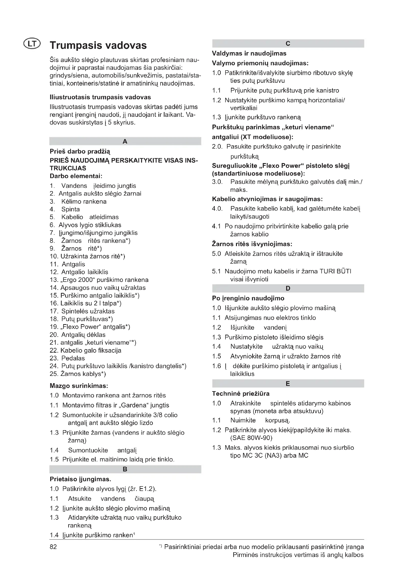 Trumpasis vadovas Šis aukšto slėgio plautuvas skirtas profesiniam nau- dojimui ir paprastai naudojamas šia paskirčiai: grindys/siena, automobilis/sunkvežimis, pastatai/sta- tiniai, konteineris/statinė ir amatininkų naudojimas. Iliustruotasis trumpasis vadovas Iliustruotasis trumpasis vadovas skirtas padėti jums rengiant įrenginį naudoti, jį naudojant ir laikant. Va- dovas suskirstytas į 5 skyrius.