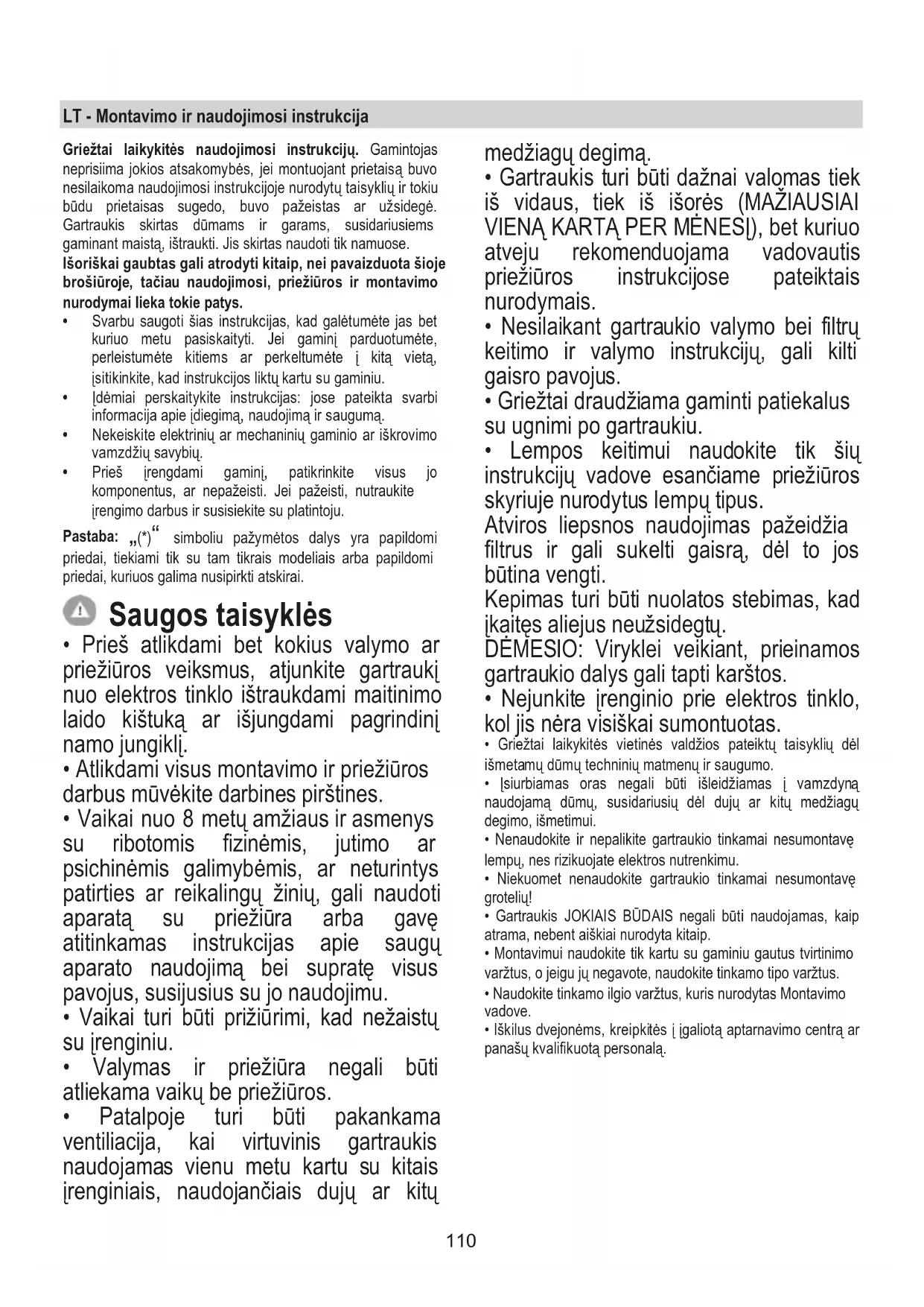 - Nesilaikant gartraukio valymo bei filtrǐ keitimo ir valymo instrukcijǐ, gali kilti gaisro pavojus.