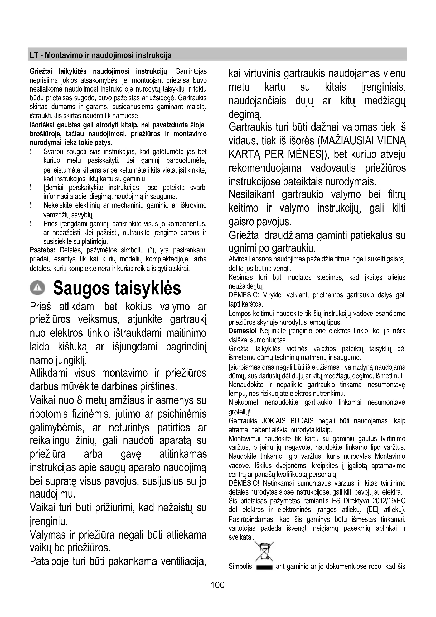 Kui valgustus ei hakka tööle, kontrollige enne tehnoabi kutsumist, kas pirn on korralikult pesas. - LED lampidega mudel Õhupuhasti on varustatud LED- valgustitega. LED-lambid tagavad optimaalse valguse kuni kümme korda pikema kestvusega võrreldes tavalampidega ning nende elektrienergia kokkuhoid on 90%. Pirnide väljavahetamiseks pöörduge teeninduskeskuse poole.100 LT - Montavimo ir naudojimosi instrukcija Griežtai laikykitės naudojimosi instrukcijų. Gamintojas neprisiima jokios atsakomybės, jei montuojant prietaisą buvo nesilaikoma naudojimosi instrukcijoje nurodytų taisyklių ir tokiu būdu prietaisas sugedo, buvo pažeistas ar užsidegė. Gartraukis skirtas dūmams ir garams, susidariusiems gaminant maistą, ištraukti. Jis skirtas naudoti tik namuose. Išoriškai gaubtas gali atrodyti kitaip, nei pavaizduota šioje brošiūroje, tačiau naudojimosi, priežiūros ir montavimo nurodymai lieka tokie patys. ! Svarbu saugoti šias instrukcijas, kad galėtumėte jas bet kuriuo metu pasiskaityti. Jei gaminį parduotumėte, perleistumėte kitiems ar perkeltumėte į kitą vietą, įsitikinkite, kad instrukcijos liktų kartu su gaminiu. ! Įdėmiai perskaitykite instrukcijas: jose pateikta svarbi informacija apie įdiegimą, naudojimą ir saugumą. ! Nekeiskite elektrinių ar mechaninių gaminio ar iškrovimo vamzdžių savybių. ! Prieš įrengdami gaminį, patikrinkite visus jo komponentus, ar nepažeisti. Jei pažeisti, nutraukite įrengimo darbus ir susisiekite su platintoju. Pastaba: Detalės, pažymėtos simboliu (*), yra pasirenkami priedai, esantys tik kai kurių modelių komplektacijoje, arba detalės, kurių komplekte nėra ir kurias reikia įsigyti atskirai. Saugos taisyklės Prieš atlikdami bet kokius valymo ar priežiūros veiksmus, atjunkite gartraukį nuo elektros tinklo ištraukdami maitinimo laido kištuką ar išjungdami pagrindinį namo jungiklį. Atlikdami visus montavimo ir priežiūros darbus mūvėkite darbines pirštines. Vaikai nuo 8 metų amžiaus ir asmenys su ribotomis fizinėmis, jutimo ar psichinėmis galimybėmis, ar neturintys patirties ar reikalingų žinių, gali naudoti aparatą su priežiūra arba gavę atitinkamas instrukcijas apie saugų aparato naudojimą bei supratę visus pavojus, susijusius su jo naudojimu. Vaikai turi būti prižiūrimi, kad nežaistų su įrenginiu. Valymas ir priežiūra negali būti atliekama vaikų be priežiūros. Patalpoje turi būti pakankama ventiliacija, kai virtuvinis gartraukis naudojamas vienu metu kartu su kitais įrenginiais, naudojančiais dujų ar kitų medžiagų degimą. Gartraukis turi būti dažnai valomas tiek iš vidaus, tiek iš išorės (MAŽIAUSIAI VIENĄ KARTĄ PER MĖNESĮ), bet kuriuo atveju rekomenduojama vadovautis priežiūros instrukcijose pateiktais nurodymais. Nesilaikant gartraukio valymo bei filtrų keitimo ir valymo instrukcijų, gali kilti gaisro pavojus. Griežtai draudžiama gaminti patiekalus su ugnimi po gartraukiu. Atviros liepsnos naudojimas pažeidžia filtrus ir gali sukelti gaisrą, dėl to jos būtina vengti. Kepimas turi būti nuolatos stebimas, kad įkaitęs aliejus neužsidegtų. DĖMESIO: Viryklei veikiant, prieinamos gartraukio dalys gali tapti karštos. Lempos keitimui naudokite tik šių instrukcijų vadove esančiame priežiūros skyriuje nurodytus lempų tipus. Dėmesio! Nejunkite įrenginio prie elektros tinklo, kol jis nėra visiškai sumontuotas. Griežtai laikykitės vietinės valdžios pateiktų taisyklių dėl išmetamų dūmų techninių matmenų ir saugumo. Įsiurbiamas oras negali būti išleidžiamas į vamzdyną naudojamą dūmų, susidariusių dėl dujų ar kitų medžiagų degimo, išmetimui. Nenaudokite ir nepalikite gartraukio tinkamai nesumontavę lempų, nes rizikuojate elektros nutrenkimu. Niekuomet nenaudokite gartraukio tinkamai nesumontavę grotelių! Gartraukis JOKIAIS BŪDAIS negali būti naudojamas, kaip atrama, nebent aiškiai nurodyta kitaip. Montavimui naudokite tik kartu su gaminiu gautus tvirtinimo varžtus, o jeigu jų negavote, naudokite tinkamo tipo varžtus. Naudokite tinkamo ilgio varžtus, kuris nurodytas Montavimo vadove. Iškilus dvejonėms, kreipkitės į įgaliotą aptarnavimo centrą ar panašų kvalifikuotą personalą. DĖMESIO! Netinkamai sumontavus varžtus ir kitas tvirtinimo detales nurodytas šiose instrukcijose, gali kilti pavojų su elektra. Šis prietaisas pažymėtas remiantis ES Direktyva 2012/19/EC dėl elektros ir elektroninės įrangos atliekų, (EEĮ atliekų). Pasirūpindamas, kad šis gaminys būtų išmestas tinkamai, vartotojas padeda išvengti neigiamų pasekmių aplinkai ir sveikatai. Simbolis ant gaminio ar jo dokumentuose rodo, kad šis101 gaminys neturi būti priskiriamas buitinėms atliekoms, o turi būti pristatytas į tam tikrą atliekų surinkimo punktą elektrinių ir elektroninių aparatų pakartotiniam panaudojimui. Gaminį išmeskite laikydamiesi vietinių atliekų šalinimo normų. Norėdami gauti daugiau informacijos apie šio gaminio apdorojimą, rinkimą ir pakartotinį panaudojimą, kreipkitės į specialią vietinę įstaigą, buitinių atliekų rinkimo centrą ar parduotuvę, kurioje gaminys buvo pirktas. Prietaisas suprojektuotas, išbandytas ir pagamintas pagal: