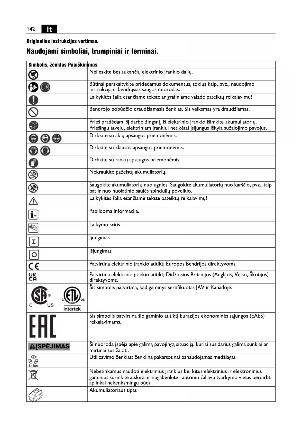 Originalios instrukcijos vertimas. Naudojami simboliai, trumpiniai ir terminai. Simbolis, ženklas Paaiškinimas Nelieskite besisukančių elektrinio įrankio dalių. Būtinai perskaitykite pridedamus dokumentus, tokius kaip, pvz., naudojimo instrukciją ir bendrąsias saugos nuorodas. Laikykitės šalia esančiame tekste ar grafiniame vaizde pateiktų reikalavimų! Bendrojo pobūdžio draudžiamasis ženklas. Šis veiksmas yra draudžiamas. Prieš pradėdami šį darbo žingsnį, iš elektrinio įrankio išimkite akumuliatorių. Priešingu atveju, elektriniam įrankiui netikėtai įsijungus iškyla sužalojimo pavojus. Dirbkite su akių apsaugos priemonėmis. Dirbkite su klausos apsaugos priemonėmis. Dirbkite su rankų apsaugos priemonėmis. Nekraukite pažeistų akumuliatorių. Saugokite akumuliatorių nuo ugnies. Saugokite akumuliatorių nuo karščio, pvz., taip pat ir nuo nuolatinio saulės spindulių poveikio. Laikykitės šalia esančiame tekste pateiktų reikalavimų! Papildoma informacija. Laikymo sritis Įjungimas Išjungimas Patvirtina elektrinio įrankio atitiktį Europos Bendrijos direktyvoms. Patvirtina elektrinio įrankio atitiktį Didžiosios Britanijos (Anglijos, Velso, Škotijos) direktyvoms. Šis simbolis patvirtina, kad gaminys sertifikuotas JAV ir Kanadoje. Šis simbolis patvirtina šio gaminio atitiktį Eurazijos ekonominės sąjungos (EAES) reikalavimams. Ši nuoroda į spėja apie galimą pavojingą situaciją, kuriai susidarius galima sunkiai ar mirtinai susižaloti. Utilizavimo ženklas: ženklina pakartotinai panaudojamas medžiagas Nebetinkamus naudoti elektrinius įrankius bei kitus elektrinius ir elektroninius gaminius surinkite atskirai ir nugabenkite į antrinių žaliavų tvarkymo vietas perdirbti aplinkai nekenksmingu būdu. Akumuliatoriaus tipas143