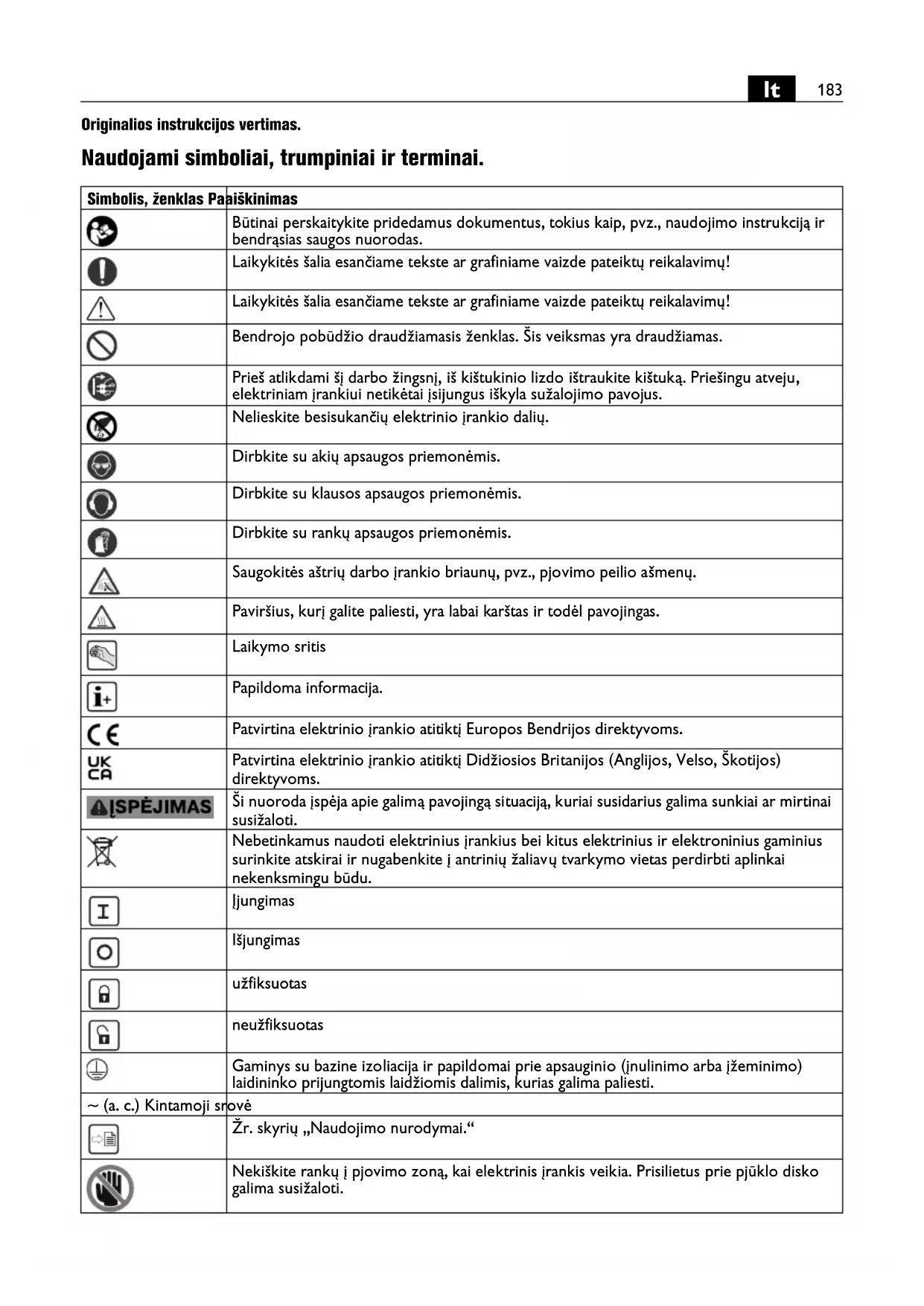 Originalios instrukcijos vertimas. Naudojami simboliai, trumpiniai ir terminai. Simbolis, ženklas Paaiškinimas Būtinai perskaitykite pridedamus dokumentus, tokius kaip, pvz., naudojimo instrukciją ir bendrąsias saugos nuorodas. Laikykitės šalia esančiame tekste ar grafiniame vaizde pateiktų reikalavimų! Laikykitės šalia esančiame tekste ar grafiniame vaizde pateiktų reikalavimų! Bendrojo pobūdžio draudžiamasis ženklas. Šis veiksmas yra draudžiamas. Prieš atlikdami šį darbo žingsnį, iš kištukinio lizdo ištraukite kištuką. Priešingu atveju, elektriniam įrankiui netikėtai įsijungus iškyla sužalojimo pavojus. Nelieskite besisukančių elektrinio įrankio dalių. Dirbkite su akių apsaugos priemonėmis. Dirbkite su klausos apsaugos priemonėmis. Dirbkite su rankų apsaugos priemonėmis. Saugokitės aštrių darbo įrankio briaunų, pvz., pjovimo peilio ašmenų. Paviršius, kurį galite paliesti, yra labai karštas ir todėl pavojingas. Laikymo sritis Papildoma informacija. Patvirtina elektrinio įrankio atitiktį Europos Bendrijos direktyvoms. Patvirtina elektrinio įrankio atitiktį Didžiosios Britanijos (Anglijos, Velso, Škotijos) direktyvoms. Ši nuoroda įspėja apie galimą pavojingą situaciją, kuriai susidarius galima sunkiai ar mirtinai susižaloti. Nebetinkamus naudoti elektrinius įrankius bei kitus elektrinius ir elektroninius gaminius surinkite atskirai ir nugabenkite į antrinių žaliav ų tvarkymo vietas perdirbti aplinkai nekenksmingu būdu. Įjungimas Išjungimas užfiksuotas neužfiksuotas Gaminys su bazine izoliacija ir papildomai prie apsauginio (įnulinimo arba įžeminimo) laidininko prijungtomis laidžiomis dalimis, kurias galima paliesti. ~ (a. c.) Kintamoji srovė Žr. skyrių „Naudojimo nurodymai.“ Nekiškite rankų į pjovimo zoną, kai elektrinis įrankis veikia. Prisilietus prie pjūklo disko galima susižaloti.184