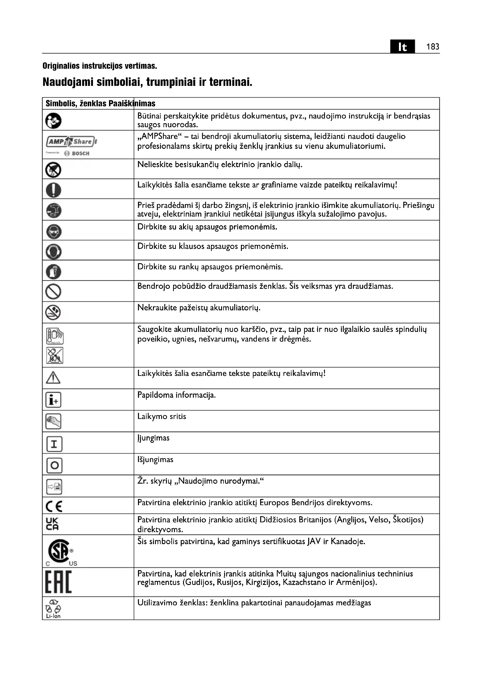 Originalios instrukcijos vertimas. Naudojami simboliai, trumpiniai ir terminai. Simbolis, ženklas Paaiškinimas Būtinai perskaitykite pridėtus dokumentus, pvz., naudojimo instrukciją ir bendrąsias saugos nuorodas. „AMPShare“ – tai bendroji akumuliatorių sistema, leidžianti naudoti daugelio profesionalams skirtų prekių ženklų įrankius su vienu akumuliatoriumi. Nelieskite besisukančių elektrinio įrankio dalių. Laikykitės šalia esančiame tekste ar grafiniame vaizde pateiktų reikalavimų! Prieš pradėdami šį darbo žingsnį, iš elektrinio įrankio išimkite akumuliatorių. Priešingu atveju, elektriniam įrankiui netikėtai įsijungus iškyla sužalojimo pavojus. Dirbkite su akių apsaugos priemonėmis. Dirbkite su klausos apsaugos priemonėmis. Dirbkite su rankų apsaugos priemonėmis. Bendrojo pobūdžio draudžiamasis ženklas. Šis veiksmas yra draudžiamas. Nekraukite pažeistų akumuliatorių. Saugokite akumuliatorių nuo karščio, pvz., taip pat ir nuo ilgalaikio saulės spindulių poveikio, ugnies, nešvarumų, vandens ir drėgmės. Laikykitės šalia esančiame tekste pateiktų reikalavimų! Papildoma informacija. Laikymo sritis Įjungimas Išjungimas Žr. skyrių „Naudojimo nurodymai.“ Patvirtina elektrinio įrankio atitiktį Europos Bendrijos direktyvoms. Patvirtina elektrinio įrankio atitiktį Didžiosios Britanijos (Anglijos, Velso, Škotijos) direktyvoms. Šis simbolis patvirtina, kad gaminys sertifikuotas JAV ir Kanadoje. Patvirtina, kad elektrinis įrankis atitinka Muitų sąjungos nacionalinius techninius reglamentus (Gudijos, Rusijos, Kirgizijos, Kazachstano ir Armėnijos). Utilizavimo ženklas: ženklina pakartotinai panaudojamas medžiagas max.50°C184