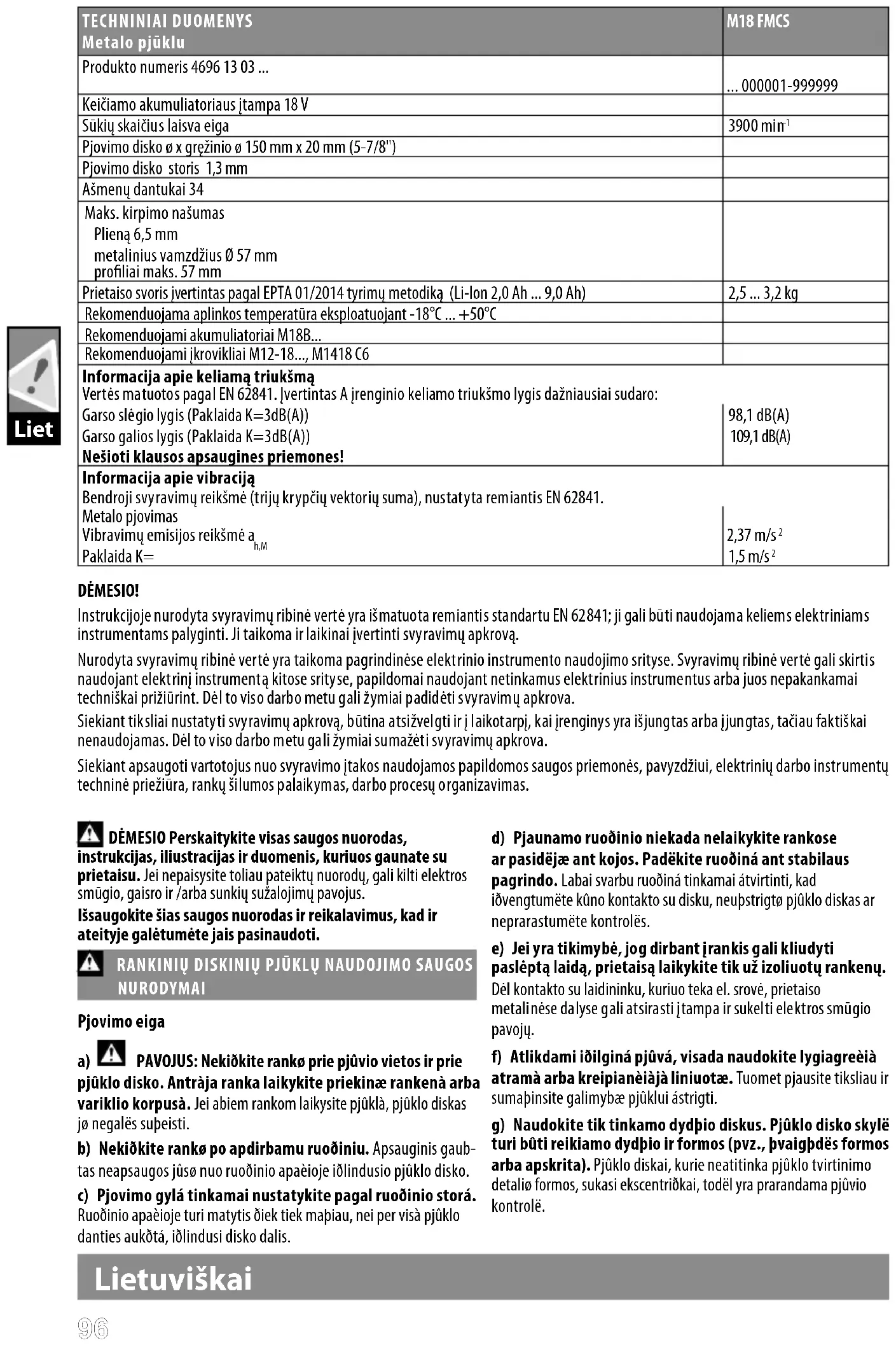 Pjovimo disko ø x gręžinio ø 150 mm x 20 mm (5-7/8") Pjovimo disko storis 1,3 mm Ašmenų dantukai 34 Maks. kirpimo našumas Plieną 6,5 mm metalinius vamzdžius Ø 57 mm proliai maks. 57 mm Prietaiso svoris įvertintas pagal EPTA 01/2014 tyrimų metodiką (Li-Ion 2,0 Ah ... 9,0 Ah) 2,5 ... 3,2 kg Rekomenduojama aplinkos temperatūra eksploatuojant -18°C ... +50°C Rekomenduojami akumuliatoriai M18B... Rekomenduojami įkrovikliai M12-18..., M1418 C6 Informacija apie keliamą triukšmą Vertės matuotos pagal EN 62841. Įvertintas A įrenginio keliamo triukšmo lygis dažniausiai sudaro: Garso slėgio lygis (Paklaida K=3dB(A)) 98,1 dB(A) Garso galios lygis (Paklaida K=3dB(A)) 109,1 dB(A) Nešioti klausos apsaugines priemones! Informacija apie vibraciją Bendroji svyravimų reikšmė (trijų krypčių vektorių suma), nustatyta remiantis EN 62841. Metalo pjovimas Vibravimų emisijos reikšmė a h,M 2,37 m/s