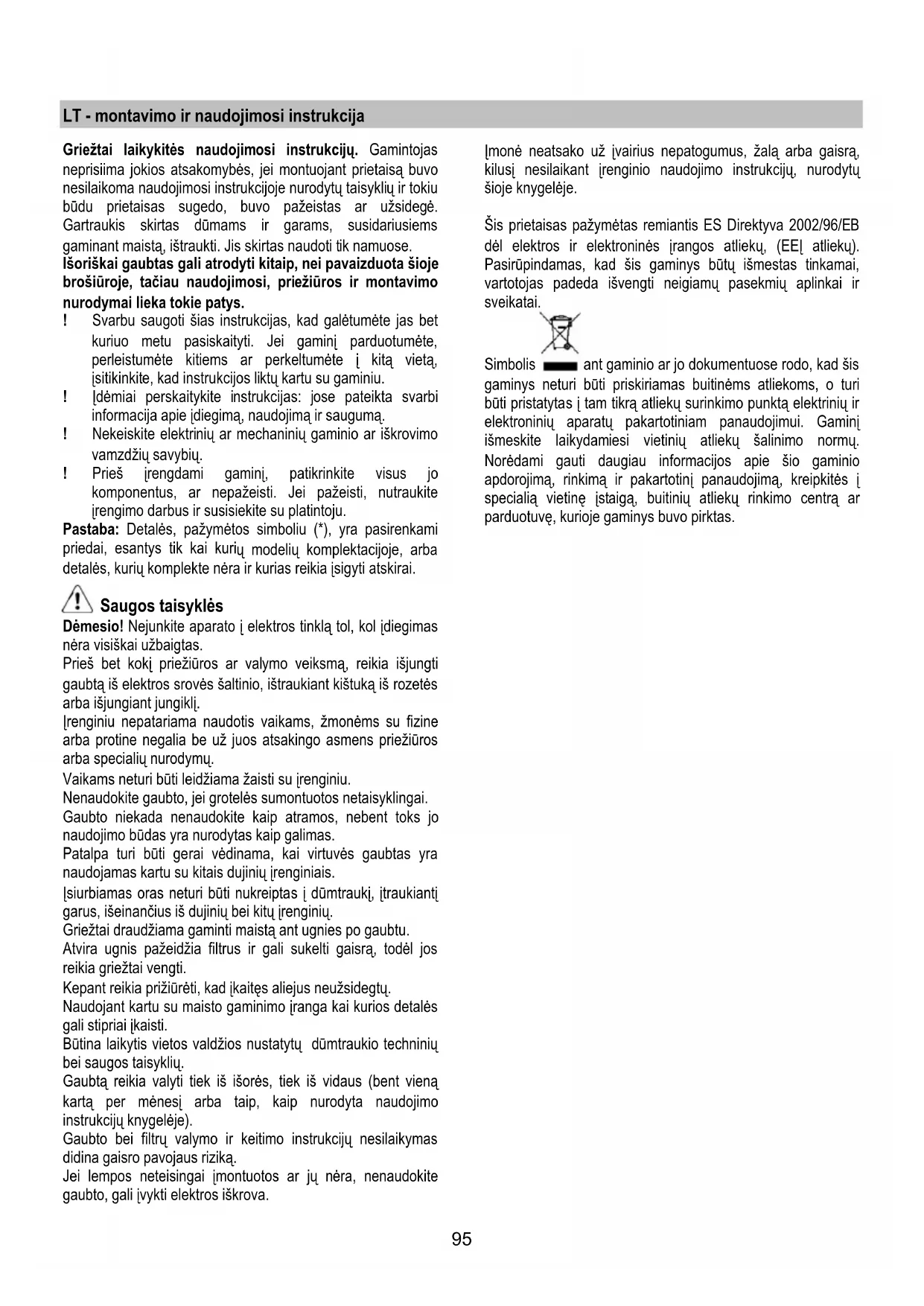 Kui valgustus ei hakka tööle, kontrollige enne tehnoabi kutsumist, kas pirn on korralikult pesas. - LED lampidega mudel Õhupuhasti on varustatud LED- valgustitega. LED-lambid tagavad optimaalse valguse kuni kümme korda pikema kestvusega võrreldes tavalampidega ning nende elektrienergia kokkuhoid on 90%. Pirnide väljavahetamiseks pöörduge teeninduskeskuse poole.95 LT - montavimo ir naudojimosi instrukcija Griežtai laikykitės naudojimosi instrukcijų. Gamintojas neprisiima jokios atsakomybės, jei montuojant prietaisą buvo nesilaikoma naudojimosi instrukcijoje nurodytų taisyklių ir tokiu būdu prietaisas sugedo, buvo pažeistas ar užsidegė. Gartraukis skirtas dūmams ir garams, susidariusiems gaminant maistą, ištraukti. Jis skirtas naudoti tik namuose. Išoriškai gaubtas gali atrodyti kitaip, nei pavaizduota šioje brošiūroje, tačiau naudojimosi, priežiūros ir montavimo nurodymai lieka tokie patys. ! Svarbu saugoti šias instrukcijas, kad galėtumėte jas bet kuriuo metu pasiskaityti. Jei gaminį parduotumėte, perleistumėte kitiems ar perkeltumėte į kitą vietą, įsitikinkite, kad instrukcijos liktų kartu su gaminiu. ! Įdėmiai perskaitykite instrukcijas: jose pateikta svarbi informacija apie įdiegimą, naudojimą ir saugumą. ! Nekeiskite elektrinių ar mechaninių gaminio ar iškrovimo vamzdžių savybių. ! Prieš įrengdami gaminį, patikrinkite visus jo komponentus, ar nepažeisti. Jei pažeisti, nutraukite įrengimo darbus ir susisiekite su platintoju. Pastaba: Detalės, pažymėtos simboliu (*), yra pasirenkami priedai, esantys tik kai kuri ų modelių komplektacijoje, arba detalės, kurių komplekte nėra ir kurias reikia įsigyti atskirai. Saugos taisyklės Dėmesio! Nejunkite aparato į elektros tinklą tol, kol įdiegimas nėra visiškai užbaigtas. Prieš bet kokį priežiūros ar valymo veiksmą, reikia išjungti gaubtą iš elektros srovės šaltinio, ištraukiant kištuką iš rozetės arba išjungiant jungiklį. Įrenginiu nepatariama naudotis vaikams, žmonėms su fizine arba protine negalia be už juos atsakingo asmens priežiūros arba specialių nurodymų. Vaikams neturi būti leidžiama žaisti su įrenginiu. Nenaudokite gaubto, jei grotelės sumontuotos netaisyklingai. Gaubto niekada nenaudokite kaip atramos, nebent toks jo naudojimo būdas yra nurodytas kaip galimas. Patalpa turi būti gerai vėdinama, kai virtuvės gaubtas yra naudojamas kartu su kitais dujinių įrenginiais. Įsiurbiamas oras neturi būti nukreiptas į dūmtraukį, įtraukiantį garus, išeinančius iš dujinių bei kitų įrenginių. Griežtai draudžiama gaminti maistą ant ugnies po gaubtu. Atvira ugnis pažeidžia filtrus ir gali sukelti gaisrą, todėl jos reikia griežtai vengti. Kepant reikia prižiūrėti, kad įkaitęs aliejus neužsidegtų. Naudojant kartu su maisto gaminimo įranga kai kurios detalės gali stipriai įkaisti. Būtina laikytis vietos valdžios nustatytų dūmtraukio techninių bei saugos taisyklių. Gaubtą reikia valyti tiek iš išorės, tiek iš vidaus (bent vieną kartą per mėnesį arba taip, kaip nurodyta naudojimo instrukcijų knygelėje). Gaubto bei filtrų valymo ir keitimo instrukcijų nesilaikymas didina gaisro pavojaus riziką. Jei lempos neteisingai įmontuotos ar jų nėra, nenaudokite gaubto, gali įvykti elektros iškrova. Įmonė neatsako už įvairius nepatogumus, žalą arba gaisrą, kilusį nesilaikant įrenginio naudojimo instrukcijų, nurodytų šioje knygelėje. Šis prietaisas pažymėtas remiantis ES Direktyva 2002/96/EB dėl elektros ir elektroninės į rangos atliekų, (EEĮ atliekų). Pasirūpindamas, kad šis gaminys būtų išmestas tinkamai, vartotojas padeda išvengti neigiamų pasekmių aplinkai ir sveikatai. Simbolis ant gaminio ar jo dokumentuose rodo, kad šis gaminys neturi būti priskiriamas buitinėms atliekoms, o turi būti pristatytas į tam tikrą atliekų surinkimo punktą elektrinių ir elektroninių aparatų pakartotiniam panaudojimui. Gaminį išmeskite laikydamiesi vietinių atliekų šalinimo normų. Norėdami gauti daugiau informacijos apie šio gaminio apdorojimą, rinkimą ir pakartotinį panaudojimą, kreipkitės į specialią vietinę įstaigą, buitinių atliekų rinkimo centrą ar parduotuvę, kurioje gaminys buvo pirktas.96 Naudojimas Gaubtas gali būti naudojamas oro ištraukimo į išorę režimu arba vidinės recirkuliacijos filtravimo režimu. Oro ištraukimo režimas Garai išstumiami į išorę per iškrovos vamzdį, pritvirtintą prie jungės. Vamzdžio skersmuo privalo atitikti sujungimo žiedo skersmenį. Dėmesio! Iškrovimo vamzdis nepridedamas, jį reikia pirkti atskirai. Horizontalioje dalyje vamzdis turi būti nukreiptas į viršų (apie 10° kampu), kad lengviau išstumtų orą į išorę. Jei gaubte yra anglies filtrų, juos reikia išimti. Prijungti gaubtą prie išvedamųjų vamzdžių ir išvedamųjų angų sienoje, kurių skersmuo atitiktų sandarinimo flanšą. Jei nutekėjimo žarnos ir angos sienoje yra mažesnio skersmens, sumažėja traukiamoji geba ir stipriai padidėja triukšmingumas. Gamintojas neprisiima su tuo susijusios atsakomybės. ! Naudokite pakankamo ilgio vamzdį. ! Naudokite kuo tiesesnį vamzdį (didžiausias vamzdžio nuokrypio kampas – 90°). ! Stenkitės iš esmės nekeisti vamzdžių sekcijų. ! Naudokite tuos vamzžius, kurių vidinės sienelės lygios. ! Vamzdžių medžiagos privalo atitikti nustatytas normas. Filtravimo režimas Prieš patekdamas į kambarį, įtraukiamas oras nuriebalinamas ir dezodoruojamas. Norėdami naudotis šios versijos filtru, privalote įdiegti papildomą filtravimo aktyviąja anglimi sistemą. Įrengimas Jei viryklė elektrinė, mažiausias atstumas tarp viryklės kaitlentės paviršiaus ir žemiausios virtuvinio gaubto dalies turi būti 50cm, o jei viryklė dujinė ar kombinuota – 50cmo jei viryklė dujinė ar kombinuota. Jei dujinės viryklės įrengimo instrukcijoje nurodomas didesnis atstumas, būtina į 