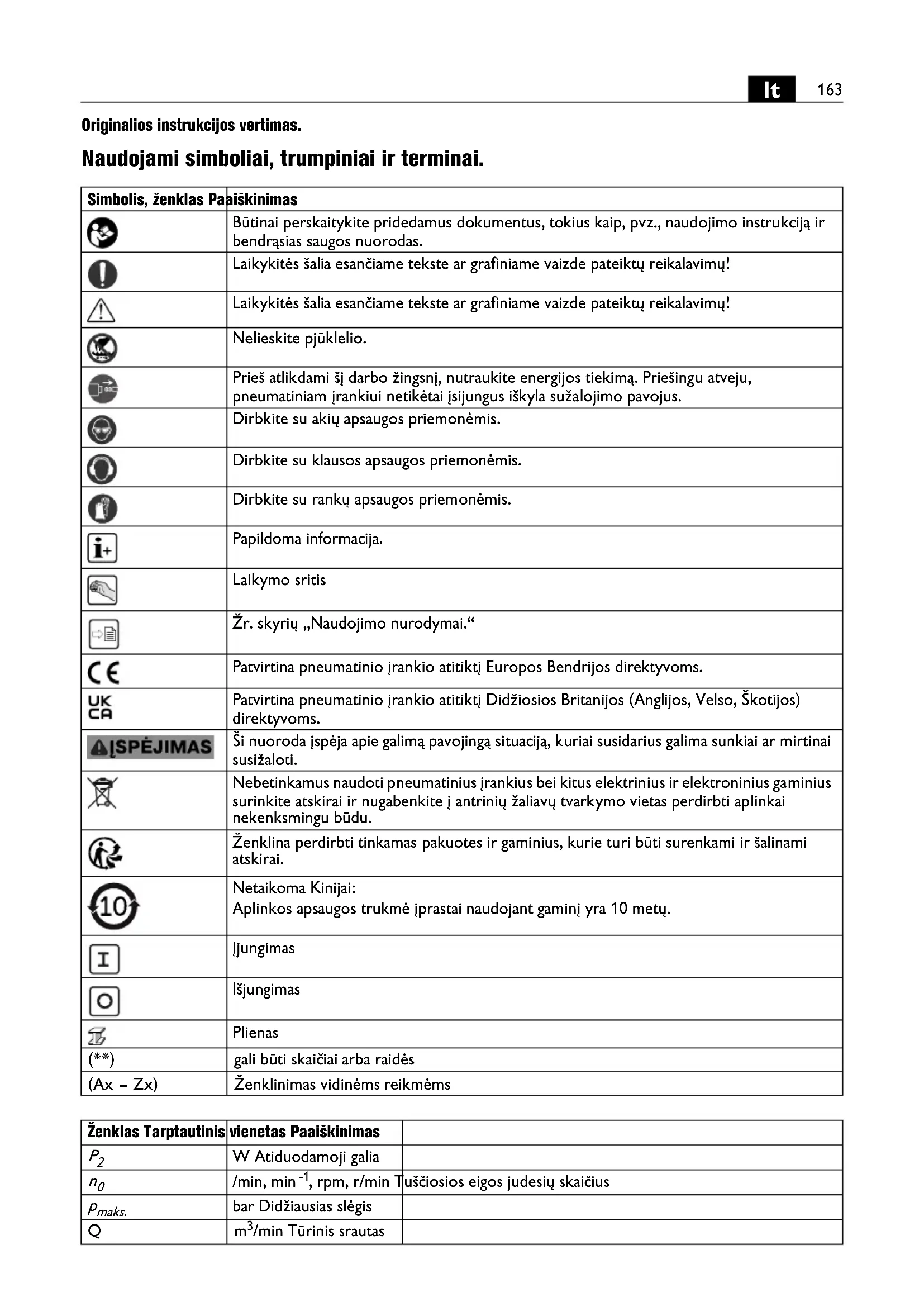 Originalios instrukcijos vertimas. Naudojami simboliai, trumpiniai ir terminai. Simbolis, ženklas Paaiškinimas Būtinai perskaitykite pridedamus dokumentus, tokius kaip, pvz., naudojimo instrukciją ir bendrąsias saugos nuorodas. Laikykitės šalia esančiame tekste ar grafiniame vaizde pateiktų reikalavimų! Laikykitės šalia esančiame tekste ar grafiniame vaizde pateiktų reikalavimų! Nelieskite pjūklelio. Prieš atlikdami šį darbo žingsnį, nutraukite energijos tiekimą. Priešingu atveju, pneumatiniam įrankiui netikėtai įsijungus iškyla sužalojimo pavojus. Dirbkite su akių apsaugos priemonėmis. Dirbkite su klausos apsaugos priemonėmis. Dirbkite su rankų apsaugos priemonėmis. Papildoma informacija. Laikymo sritis Žr. skyrių „Naudojimo nurodymai.“ Patvirtina pneumatinio įrankio atitiktį Europos Bendrijos direktyvoms. Patvirtina pneumatinio įrankio atitiktį Didžiosios Britanijos (Anglijos, Velso, Škotijos) direktyvoms. Ši nuoroda įspėja apie galimą pavojingą situaciją, kuriai susidarius galima sunkiai ar mirtinai susižaloti. Nebetinkamus naudoti pneumatinius įrankius bei kitus elektrinius ir elektroninius gaminius surinkite atskirai ir nugabenkite į antrinių žaliavų tvarkymo vietas perdirbti aplinkai nekenksmingu būdu. Ženklina perdirbti tinkamas pakuotes ir gaminius, kurie turi būti surenkami ir šalinami atskirai. Netaikoma Kinijai: Aplinkos apsaugos trukmė įprastai naudojant gaminį yra 10 metų.