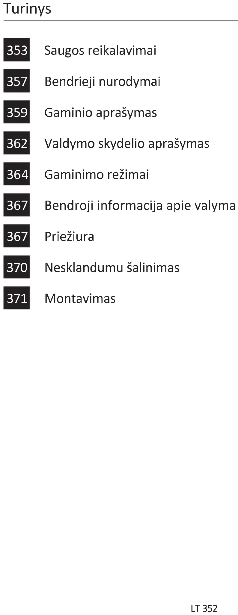 - Prieš išimdami nuimamas dalis, išjunkite orkaitę. Po valymo dalis surinkite pagal instrukcijas. Saugos reikalavimaiLT 354