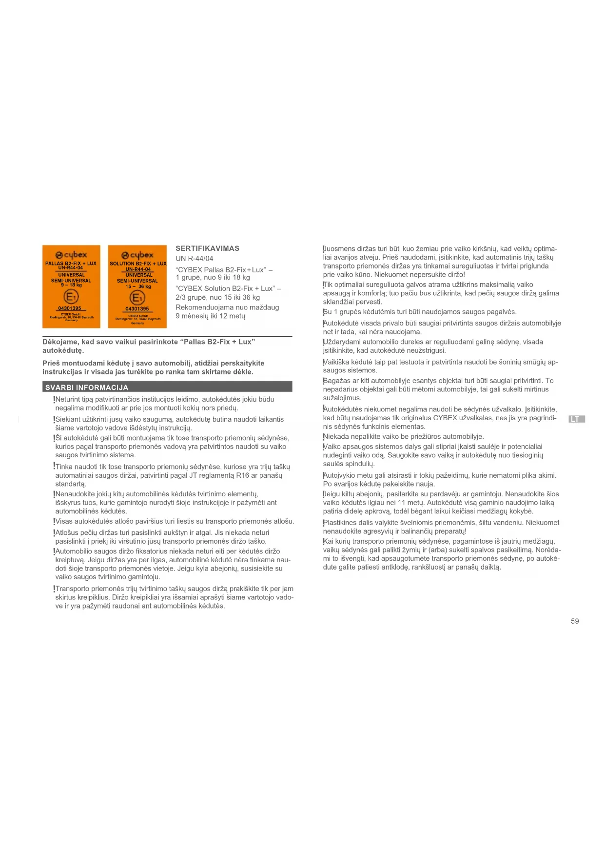 SERTIFIKAVIMAS UN R-44/04 “CYBEX Pallas B2-Fix + Lux” – 1 grupė, nuo 9 iki 18 kg “CYBEX Solution B2-Fix + Lux” – 2/3 grupė, nuo 15 iki 36 kg Rekomenduojama nuo maždaug 9 mėnesių iki 12 metų Dėkojame, kad savo vaikui pasirinkote “Pallas B2-Fix + Lux” autokėdutę. Prieš montuodami kėdutę į savo automobilį, atidžiai perskaitykite instrukcijas ir visada jas turėkite po ranka tam skirtame dėkle. SVARBI INFORMACIJA