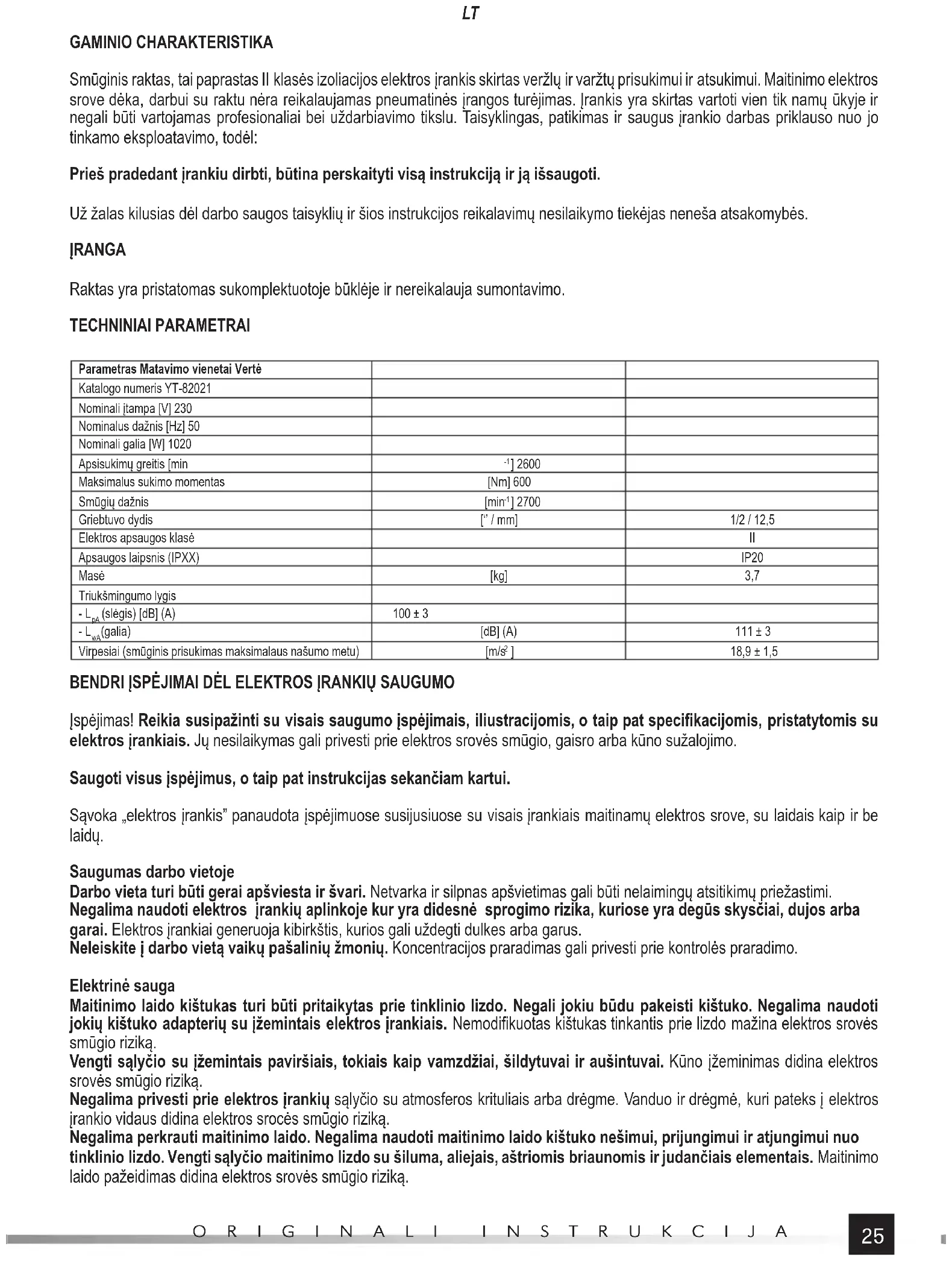 GAMINIO CHARAKTERISTIKA Smūginis raktas, tai paprastas II klasės izoliacijos elektros įrankis skirtas veržlų ir varžtų prisukimui ir atsukimui. Maitinimo elektros srove dėka, darbui su raktu nėra reikalaujamas pneumatinės įrangos turėjimas. Įrankis yra skirtas vartoti vien tik namų ūkyje ir negali būti vartojamas profesionaliai bei uždarbiavimo tikslu. Taisyklingas, patikimas ir saugus įrankio darbas priklauso nuo jo tinkamo eksploatavimo, todėl: Prieš pradedant įrankiu dirbti, būtina perskaityti visą instrukciją ir ją išsaugoti. Už žalas kilusias dėl darbo saugos taisyklių ir šios instrukcijos reikalavimų nesilaikymo tiekėjas neneša atsakomybės. ĮRANGA Raktas yra pristatomas sukomplektuotoje būklėje ir nereikalauja sumontavimo. TECHNINIAI PARAMETRAI Parametras Matavimo vienetai Vertė Katalogo numeris YT-82021 Nominali įtampa [V] 230 Nominalus dažnis [Hz] 50 Nominali galia [W] 1020 Apsisukimų greitis [min