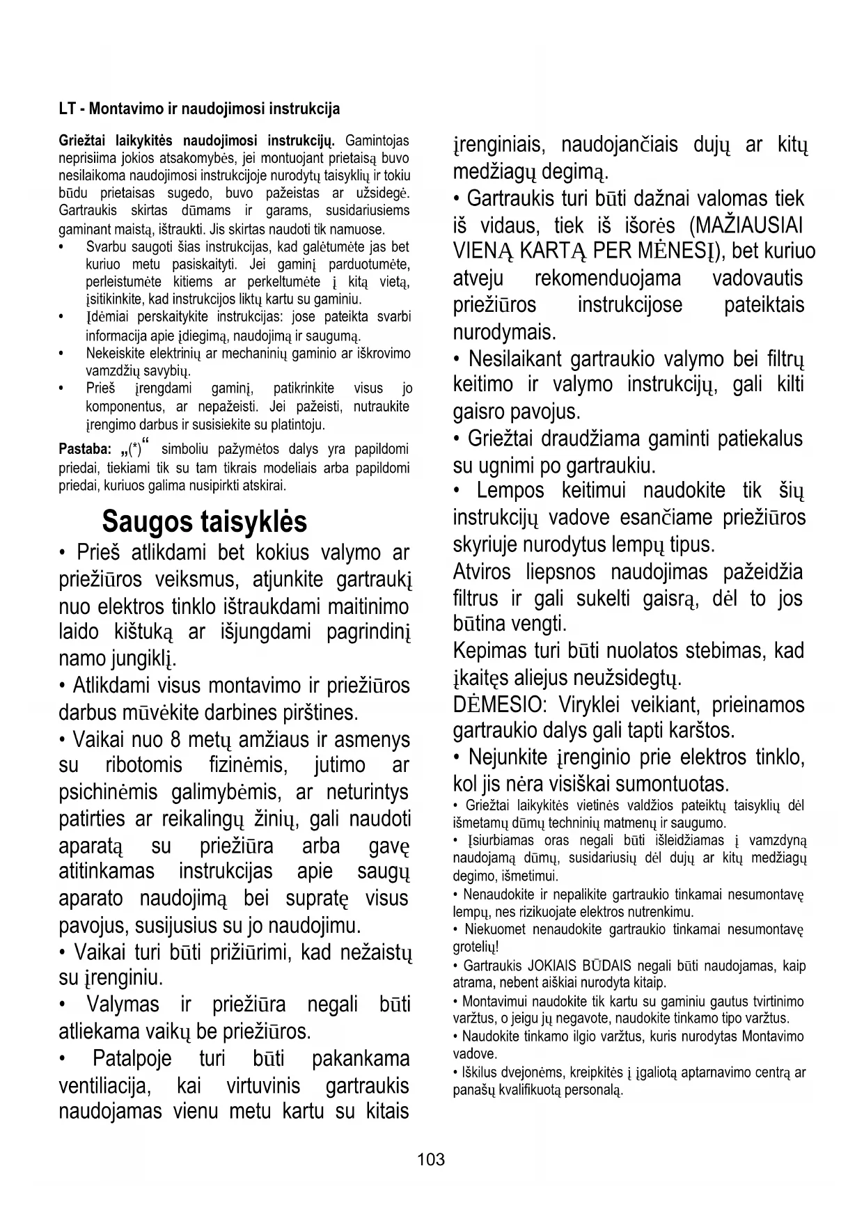 Paigaldage võre uuesti. Kui valgustus ei hakka tööle, kontrollige enne tehnoabi kutsumist, kas pirn on korralikult pesas.103 LT - Montavimo ir naudojimosi instrukcija Griežtai laikykitės naudojimosi instrukcijų. Gamintojas neprisiima jokios atsakomybės, jei montuojant prietaisą buvo nesilaikoma naudojimosi instrukcijoje nurodytų taisyklių ir tokiu būdu prietaisas sugedo, buvo pažeistas ar užsidegė. Gartraukis skirtas dūmams ir garams, susidariusiems gaminant maistą, ištraukti. Jis skirtas naudoti tik namuose.