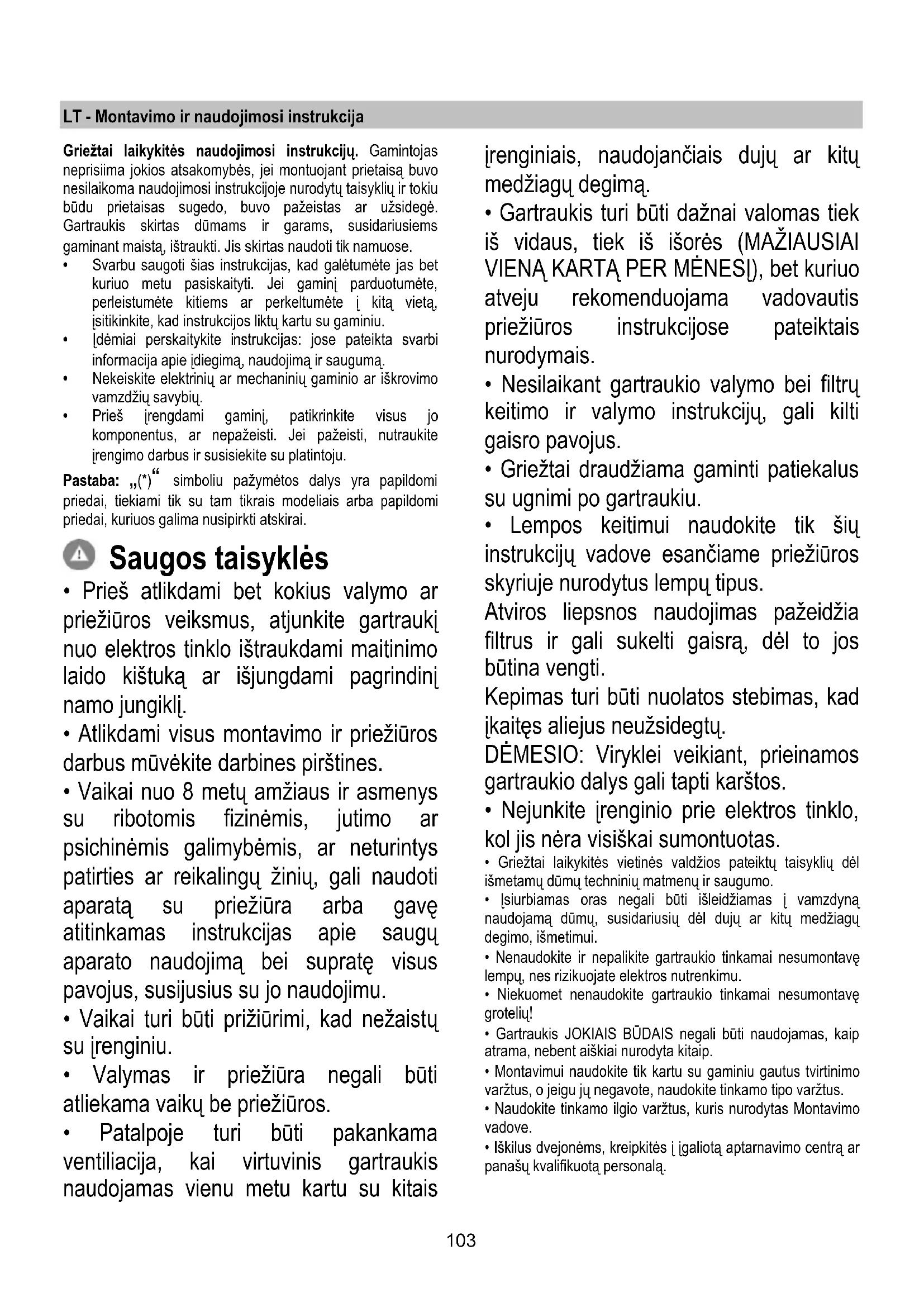 Paigaldage võre uuesti. Kui valgustus ei hakka tööle, kontrollige enne tehnoabi kutsumist, kas pirn on korralikult pesas.103 LT - Montavimo ir naudojimosi instrukcija Griežtai laikykitės naudojimosi instrukcijų. Gamintojas neprisiima jokios atsakomybės, jei montuojant prietaisą buvo nesilaikoma naudojimosi instrukcijoje nurodytų taisyklių ir tokiu būdu prietaisas sugedo, buvo pažeistas ar užsidegė. Gartraukis skirtas dūmams ir garams, susidariusiems gaminant maistą, ištraukti. Jis skirtas naudoti tik namuose.