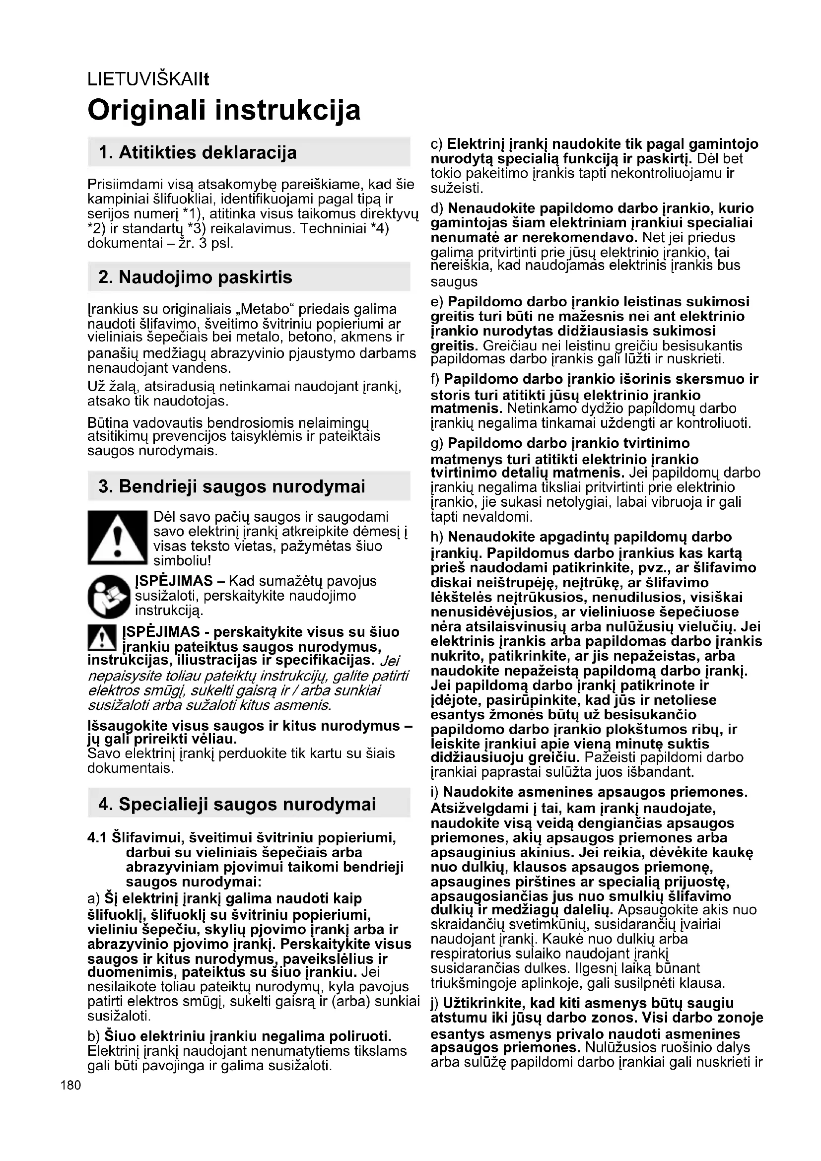 Originali instrukcija Prisiimdami visą atsakomybę pareiškiame, kad šie kampiniai šlifuokliai, identifikuojami pagal tipą ir serijos numerį *1), atitinka visus taikomus direktyvų *2) ir standartų *3) reikalavimus. Techniniai *4) dokumentai – žr. 3 psl. Įrankius su originaliais „Metabo“ priedais galima naudoti šlifavimo, šveitimo švitriniu popieriumi ar vieliniais šepečiais bei metalo, betono, akmens ir panašių medžiagų abrazyvinio pjaustymo darbams nenaudojant vandens. Už žalą, atsiradusią netinkamai naudojant įrankį, atsako tik naudotojas. Būtina vadovautis bendrosiomis nelaimingų atsitikimų prevencijos taisyklėmis ir pateiktais saugos nurodymais. Dėl savo pačių saugos ir saugodami savo elektrinį įrankį atkreipkite dėmesį į visas teksto vietas, pažymėtas šiuo simboliu! ĮSPĖJIMAS – Kad sumažėtų pavojus susižaloti, perskaitykite naudojimo instrukciją. ĮSPĖJIMAS - perskaitykite visus su šiuo įrankiu pateiktus saugos nurodymus, instrukcijas, iliustracijas ir specifikacijas. Jei nepaisysite toliau pateiktų instrukcijų, galite patirti elektros smūgį, sukelti gaisrą ir / arba sunkiai susižaloti arba sužaloti kitus asmenis. Išsaugokite visus saugos ir kitus nurodymus – jų gali prireikti vėliau. Savo elektrinį įrankį perduokite tik kartu su šiais dokumentais.