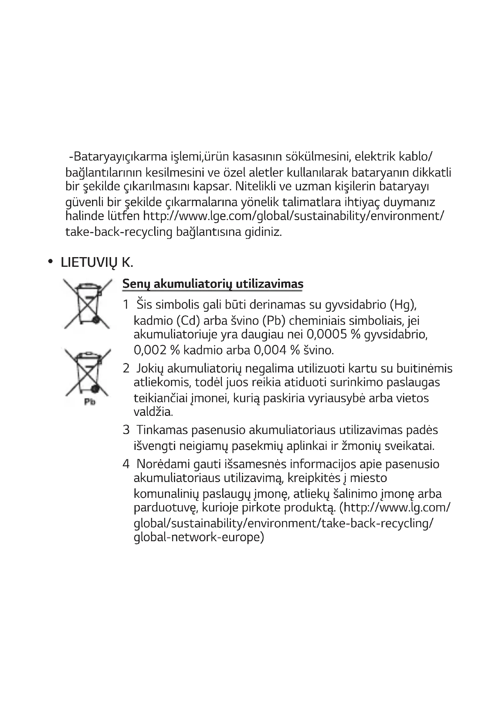 LIETUVIŲ K. Senų akumuliatorių utilizavimas 1 Šis simbolis gali būti derinamas su gyvsidabrio (Hg), kadmio (Cd) arba švino (Pb) cheminiais simboliais, jei akumuliatoriuje yra daugiau nei 0,0005 % gyvsidabrio, 0,002 % kadmio arba 0,004 % švino. 2 Jokių akumuliatorių negalima utilizuoti kartu su buitinėmis atliekomis, todėl juos reikia atiduoti surinkimo paslaugas teikiančiai įmonei, kurią paskiria vyriausybė arba vietos valdžia. 3 Tinkamas pasenusio akumuliatoriaus utilizavimas padės išvengti neigiamų pasekmių aplinkai ir žmonių sveikatai. 4 Norėdami gauti išsamesnės informacijos apie pasenusio akumuliatoriaus utilizavimą, kreipkitės į miesto komunalinių paslaugų įmonę, atliekų šalinimo įmonę arba parduotuvę, kurioje pirkote produktą. (http://www.lg.com/ global/sustainability/environment/take-back-recycling/ global-network-europe)Baterijų ir akumuliatorių atliekų pašalinimas (TIK produktams su integruotu akumuliatoriumi) -Jei šiame produkte įmontuotas akumuliatorius, kurio tiesioginis naudotojas lengvai pašalinti negali, „LG“ rekomenduoja kad akumuliatorių, jo keitimo atveju arba perdirbimo produkto tarnavimo laiko pabaigoje, pašalintų tik kvalikuoti specialistai. Siekiant apsaugoti įrenginį nuo apgadinimo ir jūsų pačių saugumui, naudotojai neturėtų bandyti patys pašalinti akumuliatoriaus ir norėdami gauti patarimų turėtų susisiekti su „LG“ Paslaugų pagalbos linija ar kitais nepriklausomais paslaugų tiekėjais. -Akumuliatoriaus pašalinimas apima produkto korpuso išardymą, elektrinių kabelių/kontaktų atjungimą ir atsargų akumuliatoriaus elemento išėmimą naudojant specialius įrankius. Jei jums reikia kvalikuotiems specialistams skirtų instrukcijų kaip saugiai pašalinti akumuliatorių, prašome apsilankyti http://www.lge.com/global/ sustainability/environment/take-back-recycling.
