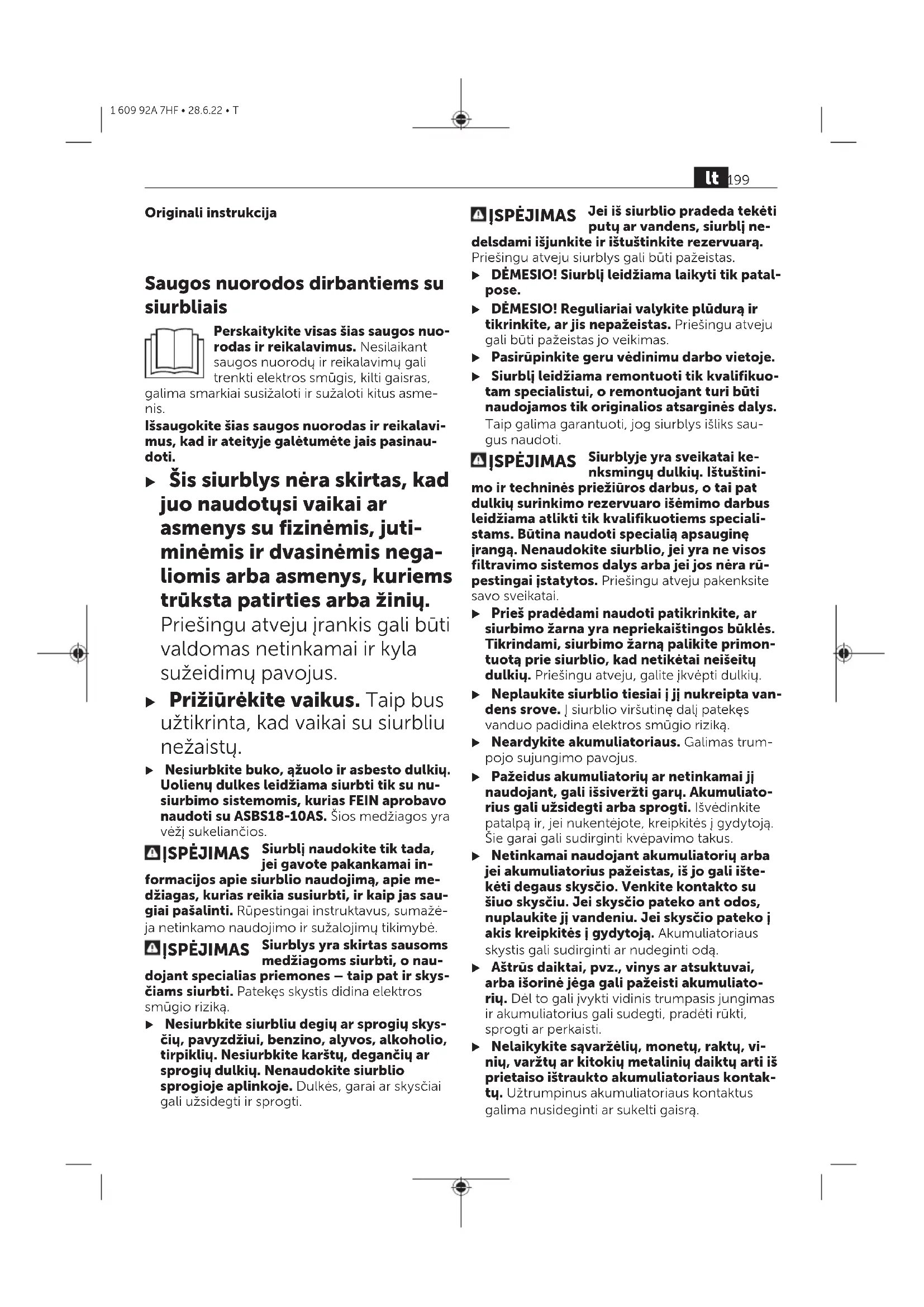 MontavimasLietuvių k. u Prieš pradėdami siurblio techninės priežiū- ros, valymo ar reguliavimo darbus, keisda- mi papildomą įrangą arba norėdami siurblį sandėliuoti, išimkite akumuliatorių. Ši atsar- gumo priemonė apsaugos jus nuo netikėto siurblio įsijungimo. Akumuliatoriaus įkrovimasLietuvių k. u Naudokite tik techninių duomenų skyriuje nurodytus kroviklius. Tik šie krovikliai yra pri- derinti prie Jūsų siurblyje naudojamo ličio jonų akumuliatoriaus. Nuoroda: laikantis tarptautinių transportavimo teisės aktų, ličio jonų akumuliatoriai tiekiami dali- nai įkrauti. Kad akumuliatorius veiktų visa galia, prieš pirmąjį naudojimą akumuliatorių visiškai įkraukite. lt 201 1 609 92A 7HF • 28.6.22 • Tu Siurbliui automatiškai išsijungus, nebe- spauskite įjungimo-išjungimo jungiklio. Taip galite sugadinti ličio jonų akumuliatorių. Pastebimas įkrauto akumuliatoriaus veikimo laiko sutrumpėjimas rodo, kad akumuliatorius susidė- vėjo ir jį reikia pakeisti. Laikykitės pateiktų šalinimo nurodymų. Akumuliatoriaus įkrovos būklės indikatoriusLietuvių k. Kai akumuliatorius įstatytas, akumuliatoriaus įkrovos būklę rodo akumuliatoriaus įkrovos būk- lės indikatorius(4), o kai akumuliatorius išimtas – įkrovos būklę rodo pats akumuliatorius. Akumuliatoriaus įkrovos būklės indikatorius ant siurblioLietuvių k. Įjungus siurblį, po vieną aukštyn užsidega ir po vieną žemyn užgęsta 5žali akumuliatoriaus įkrovos indikatoriai(4). Po to indikatoriai rodo akumuliatoriaus(19) įkrovą. Akumuliatoriaus įkrovos būklės rodmuo ant akumuliatoriausLietuvių k. Jei akumuliatorius išimamas iš siurblio, įkrovos būklę gali rodyti ant akumuliatoriaus esantys žali šviesadiodžiai įkrovos būklės indikatoriai. Jei norite, kad būtų parodyta įkrovos būklė, pa- spauskite įkrovos būklės mygtuką arba . Jei paspaudus mygtuką nešviečia nei vienas šviesadiodis indikatorius, vadinasi akumuliatorius yra pažeistas ir jį reikia pakeisti. Akumuliatoriaus tipas GBA 18V...Lietuvių k. LEDs Talpa Šviečia nuolat 3× žalias 60−100% Šviečia nuolat 2× žalias 30−60% Šviečia nuolat 1× žalias 5−30% Mirksi 1× žalias 0−5% Akumuliatoriaus tipas ProCORE18V...Lietuvių k. LEDs Talpa Šviečia nuolat 5× žalias 80−100% Šviečia nuolat 4× žalias 60−80% Šviečia nuolat 3× žalias 40−60 % Šviečia nuolat 2× žalias 20−40 % Šviečia nuolat 1× žalias 5−20 % Mirksi 1× žalias 0−5 % Akumuliatoriaus įdėjimas ir išėmimas (žr.A1−A2pav.)Lietuvių k. u Įdėdami akumuliatorių nenaudokite jėgos. Akumuliatorius sukonstruotas taip, kad į gaminį jį būtų galima įdėti tik tinkama padėtimi. u Kad dirbtumėte gerai ir saugiai, akumuliato- riaus skyrių ir dėklą visada laikykite švarų. – Paspauskite atblokavimo mygtuką(10), norė- dami atidaryti akumuliatoriaus skyriaus dangtelį(11). – Stumkite akumuliatorių(19) į akumuliatoriaus skyrių(18), kol išgirsite, kad jis užsifiksavo. – Norėdami išimti akumuliatorių(19), paspaus- kite ant akumuliatoriaus esantį atblokavimo mygtuką(20) ir ištraukite akumuliatorių iš aku- muliatoriaus skyriaus(18). – Uždarykite akumuliatoriaus skyriaus dangtelįā(11). Laikiklių siurbimo priedams montavimas (žr.Bpav.)Lietuvių k. – Laikiklį siurbimo vamzdžiui ir antgaliui tarpams siurbti(21) iš viršaus tvirtai stumkite į specialiai tam skirtą įtvarą(9), kol išgirsite, kad užsifiksa- vo. – Laikiklį siurbimo žarnai ir antgaliui grindims siurbti(23) iš viršaus tvirtai stumkite į specialiai tam skirtą įtvarą(7) ir tvirtai užveržkite fiksuoja- mąjį varžtą(22). Siurbiamosios žarnos montavimas (žr.C pav.)Lietuvių k. – Siurbimo žarną (12) stumkite į žarnos įtvarą (8), kol užsifiksuos abu nusiurbimo žarnos mygtu- kai (24). Nuoroda: Dėl dulkių trinties siurbimo žarnoje ir papildomoje įrangoje siurbiant susidaro elekt- rostatinė įkrova, kurią naudotojas gali pajausti kaip statinę iškrovą (priklausomai nuo aplinkos įtakos ir kūno jautrumo). Siurbimo priedų montavimasLietuvių k. Siurbimo žarna(12) yra su sąvaržų sistema, kuria galima prijungti siurbimo papildomą įrangą (nu- siurbimo adapterį(13), lenktą antgalį(14)). Nusiurbimo adapterio arba lenkto antgalio montavimas (žr.Dpav.)Lietuvių k. – Nusiurbimo adapterį(13) arba lenktą antgalį(14) įstatykite ant siurbimo žarnos(12) – turite išgirsti, kaip užsifiksavo abu siurbimo žarnos mygtukai(24). – Norėdami išmontuoti, į vidų spauskite mygtukus(24) ir atskirkite konstrukcines dalis. Antgalių ir vamzdžių montavimasLietuvių k. – Jei reikia, siurbimo vamzdžius (17) tvirtai įstatykite vieną į kitą, o tada – tvirtai į lenktą antgalį (14). 202 lt 1 609 92A 7HF • 28.6.22 • T– Antgalį grindims siurbti (16) arba antgalį tar- pams siurbti (15) tvirtai įstatykite į siurbimo vamzdį (17) arba lenktą antgalį (14). Ratukų montavimas (žr.Epav.)Lietuvių k. 4 ratukų(25) tvirtinamuosius kaiščius įstatykite į ratukų įtvarus(26) – turite girdėti, kaip jie užsifik- savo. Taip pat galima naudoti ir kitus, EN12529 (tvir- tinamojo kaiščio skersmuo 11mm) standartą ati- tinkančius, ratukus. u Prieš pradėdami dirbti su siurbliu, patikrin- kite, ar veikia ratukų stabdžiai. NaudojimasLietuvių k. u Prieš pradėdami siurblio techninės priežiū- ros, valymo ar reguliavimo darbus, keisda- mi papildomą įrangą arba norėdami siurblį sandėliuoti, išimkite akumuliatorių. Ši atsar- gumo priemonė apsaugos jus nuo netikėto siurblio įsijungimo. u Darbo vietą laikykite švarią ir sutvarkytą, nes iškyla užkliuvimo pavojus. Paruošimas naudotiLietuvių k. u Siurblį be filtro naudoti draudžiama. u Naudokite tik nepažeistus filtrus (be įtrū- kių, skylių ir pan.). Pažeistą filtrą nedelsda- mi pakeiskite. u Prieš pradėdami siurbti įsitikinkite, kad tvirtai sumontuotas filtravimo mazgas. u Prieš pradėd