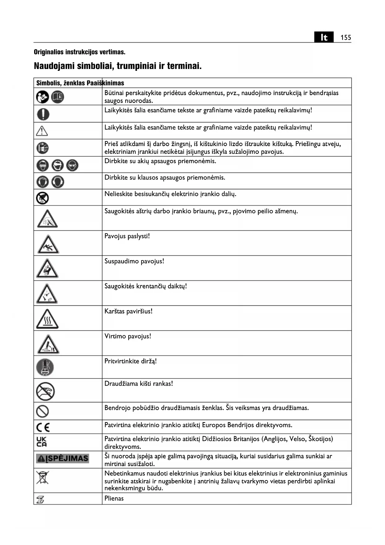 Originalios instrukcijos vertimas. Naudojami simboliai, trumpiniai ir terminai. Simbolis, ženklas Paaiškinimas Būtinai perskaitykite pridėtus dokumentus, pvz., naudojimo instrukciją ir bendrąsias saugos nuorodas. Laikykitės šalia esančiame tekste ar grafiniame vaizde pateiktų reikalavimų! Laikykitės šalia esančiame tekste ar grafiniame vaizde pateiktų reikalavimų! Prieš atlikdami šį darbo žingsnį, iš kištukinio lizdo ištraukite kištuką. Priešingu atveju, elektriniam įrankiui netikėtai įsijungus iškyla sužalojimo pavojus. Dirbkite su akių apsaugos priemonėmis. Dirbkite su klausos apsaugos priemonėmis. Nelieskite besisukančių elektrinio įrankio dalių. Saugokitės aštrių darbo įrankio briaunų, pvz., pjovimo peilio ašmenų. Pavojus paslysti! Suspaudimo pavojus! Saugokitės krentančių daiktų! Karštas paviršius! Virtimo pavojus! Pritvirtinkite diržą! Draudžiama kišti rankas! Bendrojo pobūdžio draudžiamasis ženklas. Šis veiksmas yra draudžiamas. Patvirtina elektrinio įrankio atitiktį Europos Bendrijos direktyvoms. Patvirtina elektrinio įrankio atitiktį Didžiosios Britanijos (Anglijos, Velso, Škotijos) direktyvoms. Ši nuoroda įspėja apie galimą pavojingą situaciją, kuriai susidarius galima sunkiai ar mirtinai susižaloti. Nebetinkamus naudoti elektrinius įrankius bei kitus elektrinius ir elektroninius gaminius surinkite atskirai ir nugabenkite į antrinių žaliavų tvarkymo vietas perdirbti aplinkai nekenksmingu būdu. Plienas156