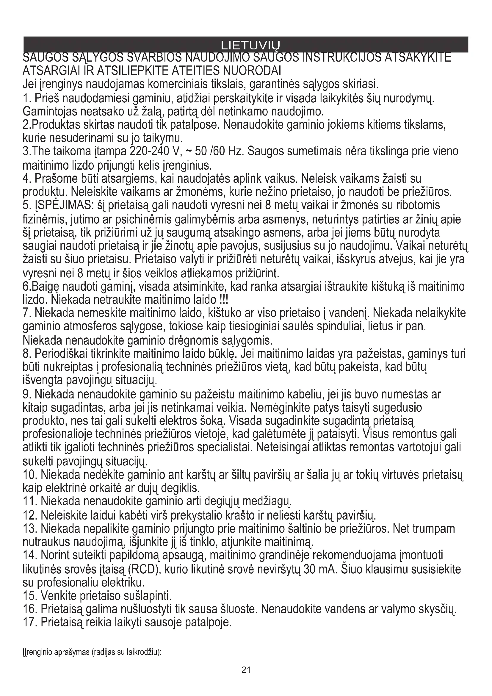 fizinėmis, jutimo ar psichinėmis galimybėmis arba asmenys, neturintys patirties ar žinių apie šį prietaisą, tik prižiūrimi už jų saugumą atsakingo asmens, arba jei jiems būtų nurodyta saugiai naudoti prietaisą ir jie žinotų apie pavojus, susijusius su jo naudojimu. Vaikai neturėtų žaisti su šiuo prietaisu. Prietaiso valyti ir prižiūrėti neturėtų vaikai, išskyrus atvejus, kai jie yra vyresni nei 8 metų ir šios veiklos atliekamos prižiūrint. 6.Baigę naudoti gaminį, visada atsiminkite, kad ranka atsargiai ištraukite kištuką iš maitinimo lizdo. Niekada netraukite maitinimo laido !!!