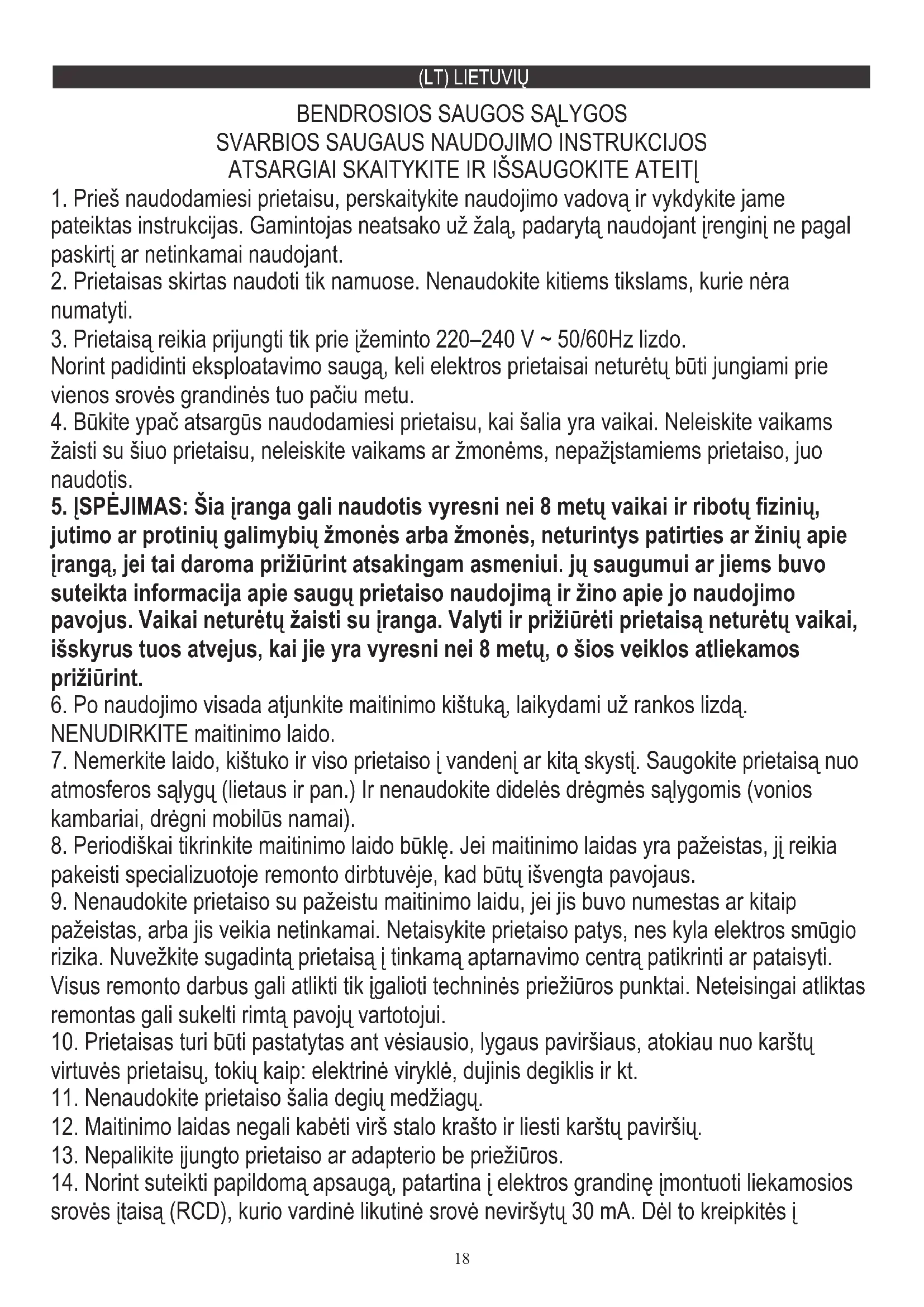 jutimo ar protinių galimybių žmonės arba žmonės, neturintys patirties ar žinių apie įrangą, jei tai daroma prižiūrint atsakingam asmeniui. jų saugumui ar jiems buvo suteikta informacija apie saugų prietaiso naudojimą ir žino apie jo naudojimo pavojus. Vaikai neturėtų žaisti su įranga. Valyti ir prižiūrėti prietaisą neturėtų vaikai, išskyrus tuos atvejus, kai jie yra vyresni nei 8 metų, o šios veiklos atliekamos prižiūrint.