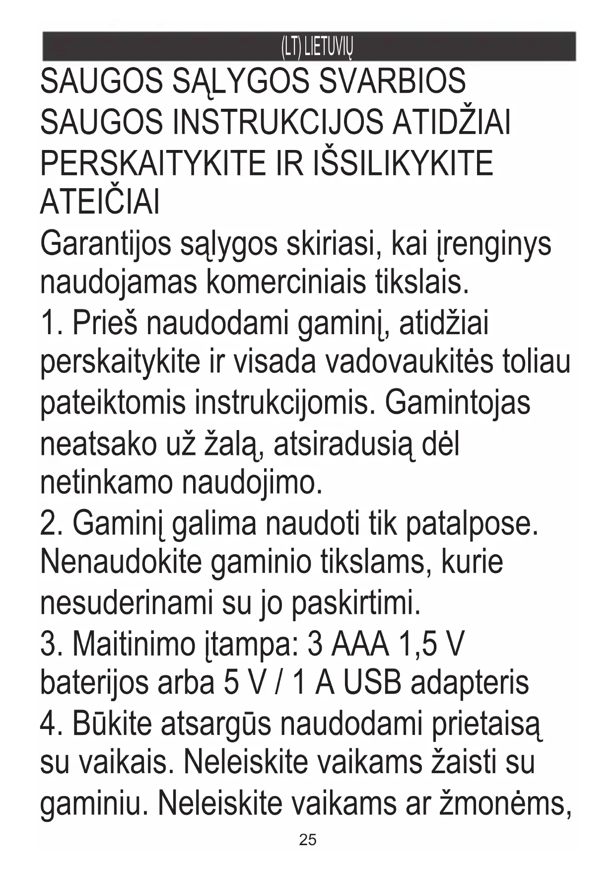 perskaitykite ir visada vadovaukitės toliau pateiktomis instrukcijomis. Gamintojas neatsako už žalą, atsiradusią dėl netinkamo naudojimo. Garantijos sąlygos skiriasi, kai įrenginys naudojamas komerciniais tikslais.