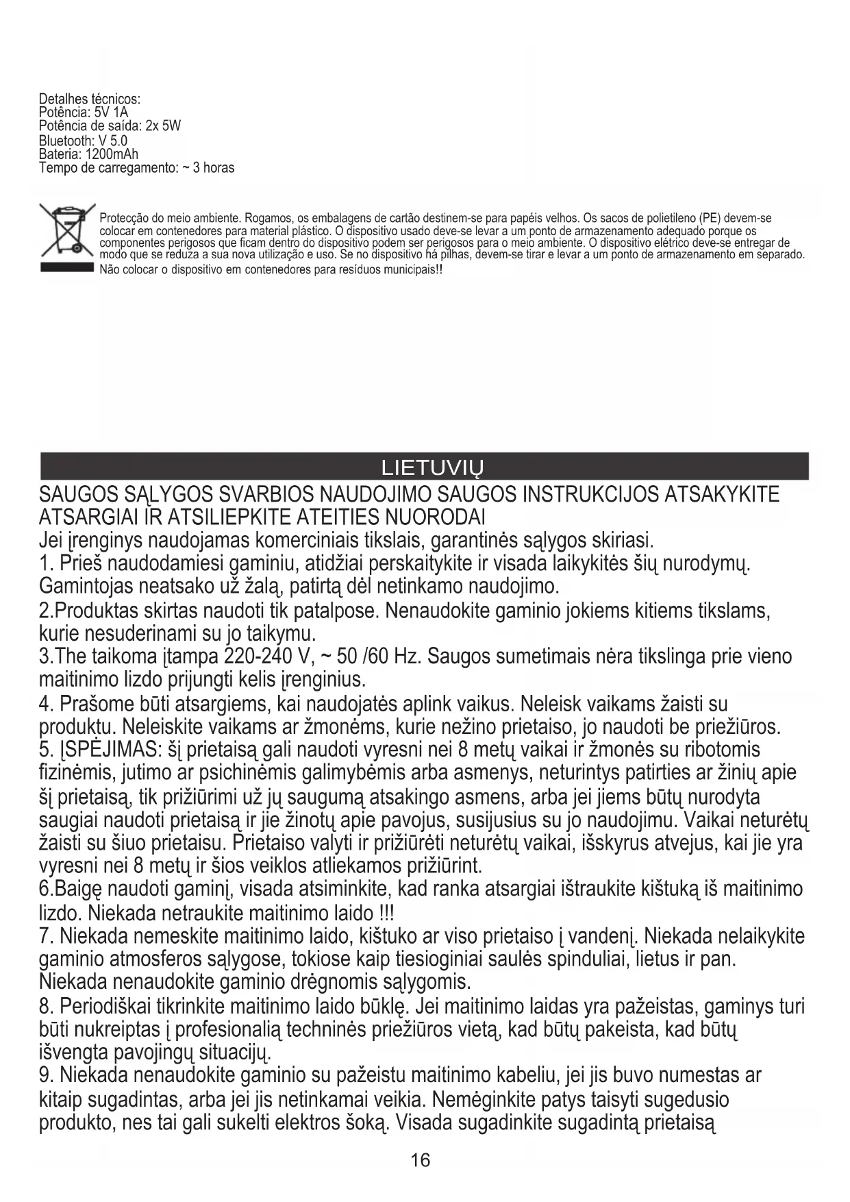 Bluetooth: V 5.0 Maitinimas: 5V 1A Techninės detalės: Neaptinkamas „Bluetooth“ susiejimo metu: įrenginys susietas su kitu telefonu. Garsiakalbis neveikia „Bluetooth“ režimu. Mažas garsumas arba jo nėra: padidinkite įrenginio garsumą ir (arba) prijunkite įrenginį. Prasta garso kokybė: įsitikinkite, kad įrenginys yra „Bluetooth“ diapazone.