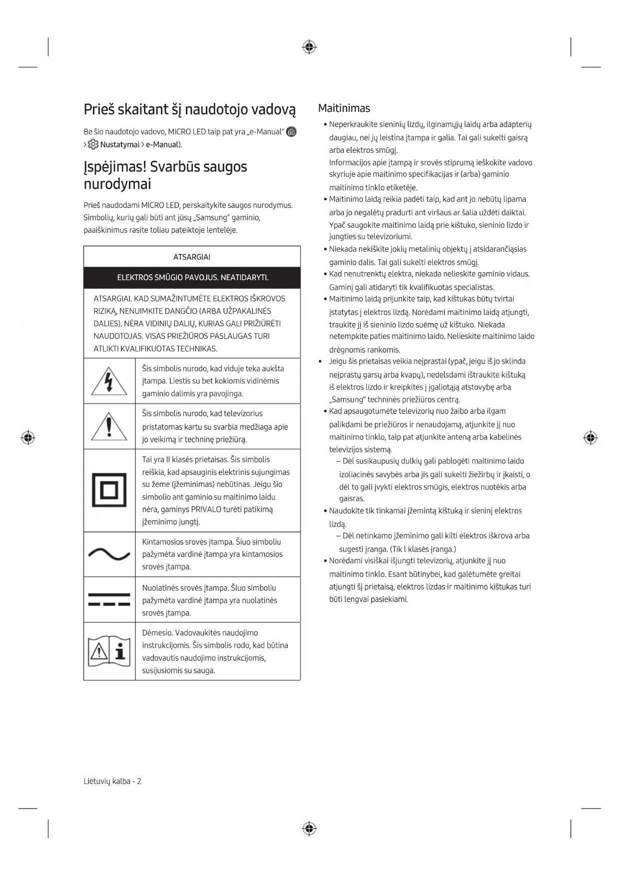 - Jūsu drošībai nemēģiniet izņemt akumulatoru pats. Ja akumulators netiek pareizi izņemts, tas var izraisīt akumulatora un ierīces bojājumus, ievainojumus un/vai padarīt ierīci nedrošu lietošanai. Latviešu - 11 LatviešuPrieš skaitant šį naudotojo vadovą Be šio naudotojo vadovo, MICRO LED taip pat yra „e-Manual“ ( > Nustatymai > e-Manual). Įspėjimas! Svarbūs saugos nurodymai Prieš naudodami MICRO LED, perskaitykite saugos nurodymus. Simbolių, kurių gali būti ant jūsų „Samsung“ gaminio, paaiškinimus rasite toliau pateiktoje lentelėje. ATSARGIAI ELEKTROS SMŪGIO PAVOJUS. NEATIDARYTI. ATSARGIAI. KAD SUMAŽINTUMĖTE ELEKTROS IŠKROVOS RIZIKĄ, NENUIMKITE DANGČIO (ARBA UŽPAKALINĖS DALIES). NĖRA VIDINIŲ DALIŲ, KURIAS GALI PRIŽIŪRĖTI NAUDOTOJAS. VISAS PRIEŽIŪROS PASLAUGAS TURI ATLIKTI KVALIFIKUOTAS TECHNIKAS. Šis simbolis nurodo, kad viduje teka aukšta įtampa. Liestis su bet kokiomis vidinėmis gaminio dalimis yra pavojinga. Šis simbolis nurodo, kad televizorius pristatomas kartu su svarbia medžiaga apie jo veikimą ir techninę priežiūrą. Tai yra II klasės prietaisas. Šis simbolis reiškia, kad apsauginis elektrinis sujungimas su žeme (įžeminimas) nebūtinas. Jeigu šio simbolio ant gaminio su maitinimo laidu nėra, gaminys PRIVALO turėti patikimą įžeminimo jungtį. Kintamosios srovės įtampa. Šiuo simboliu pažymėta vardinė įtampa yra kintamosios srovės įtampa. Nuolatinės srovės įtampa. Šiuo simboliu pažymėta vardinė įtampa yra nuolatinės srovės įtampa. Dėmesio. Vadovaukitės naudojimo instrukcijomis. Šis simbolis rodo, kad būtina vadovautis naudojimo instrukcijomis, susijusiomis su sauga. Maitinimas