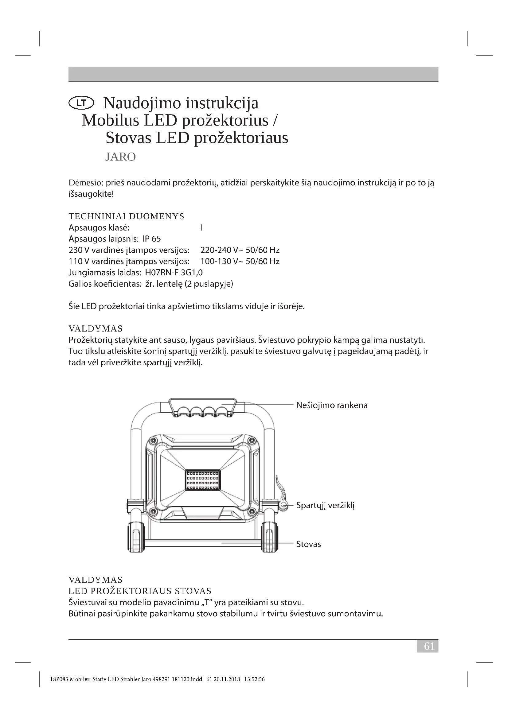 Atbilstības deklarācija glabājas pie ražotāja. Adreses Hugo Brennenstuhl GmbH & Co. KG Seestraße 1 – 3 · D-72074 Tübingen H. Brennenstuhl S.A.S. 4 rue de Bruxelles ∙ F-67170 Bernolsheim lectra-t ag Blegistrasse 13 · CH-6340 Baar www.brennenstuhl.com 18P083 Mobiler_Stativ LED Strahler Jaro 498291 181120.indd 60 20.11.2018 13:52:5661 K Naudojimo instrukcija Mobilus LED prožektorius / Stovas LED prožektoriaus JARO Dėmesio: prieš naudodami prožektorių, atidžiai perskaitykite šią naudojimo instrukciją ir po to ją išsaugokite! TECHNINIAI DUOMENYS Apsaugos klasė: I Apsaugos laipsnis: IP 65 230 V vardinės įtampos versijos: 220-240 V~ 50/60 Hz 110 V vardinės įtampos versijos: 100-130 V~ 50/60 Hz Jungiamasis laidas: H07RN-F 3G1,0 Galios koecientas: žr. lentelę (2 puslapyje) Šie LED prožektoriai tinka apšvietimo tikslams viduje ir išorėje. VALDYMAS Prožektorių statykite ant sauso, lygaus paviršiaus. Šviestuvo pokrypio kampą galima nustatyti. Tuo tikslu atleiskite šoninį spartųjį veržiklį, pasukite šviestuvo galvutę į pageidaujamą padėtį, ir tada vėl priveržkite spartųjį veržiklį. Spartųjį veržiklį Stovas Nešiojimo rankena VALDYMAS