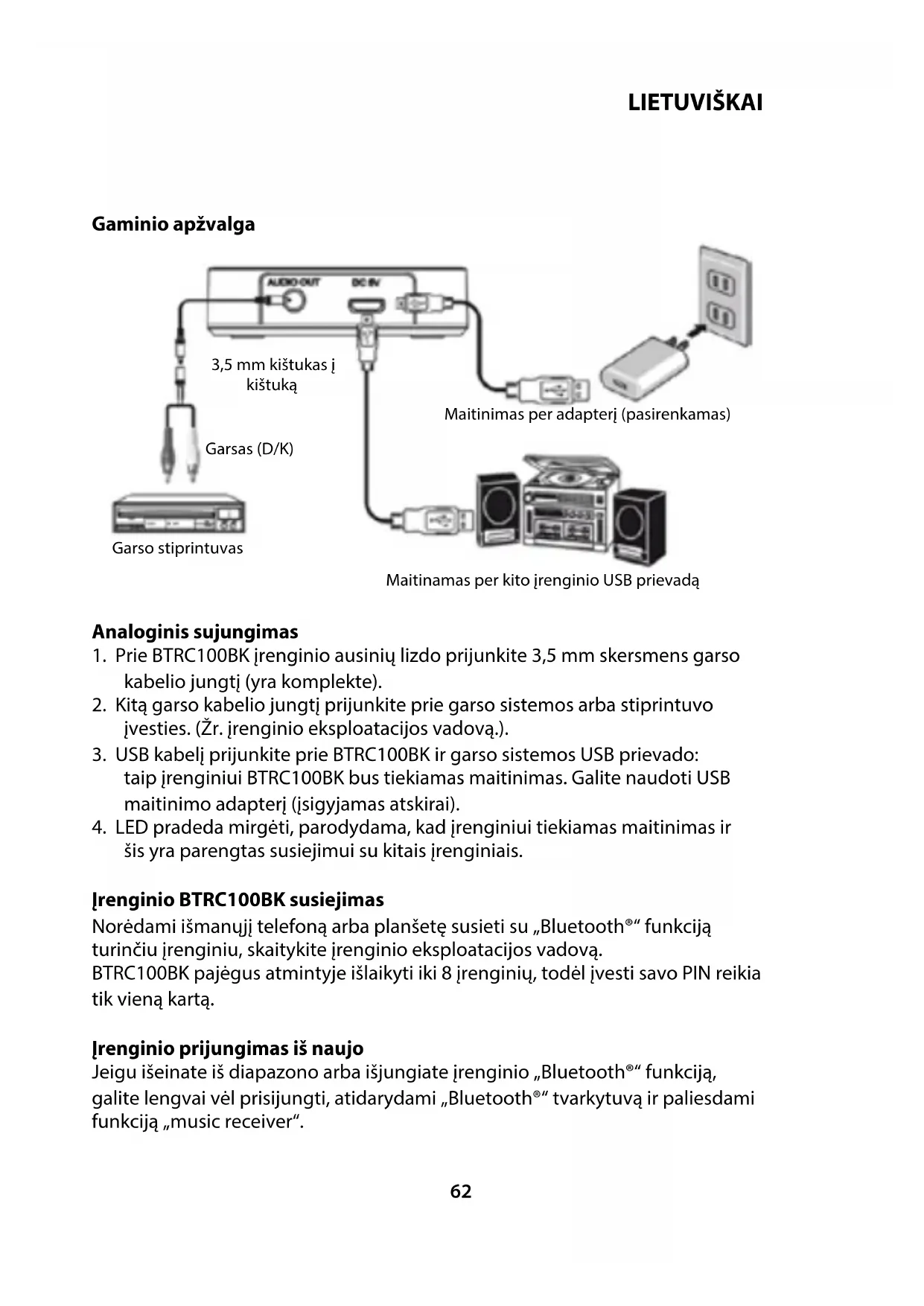 taip įrenginiui BTRC100BK bus tiekiamas maitinimas. Galite naudoti USB maitinimo adapterį (įsigyjamas atskirai).