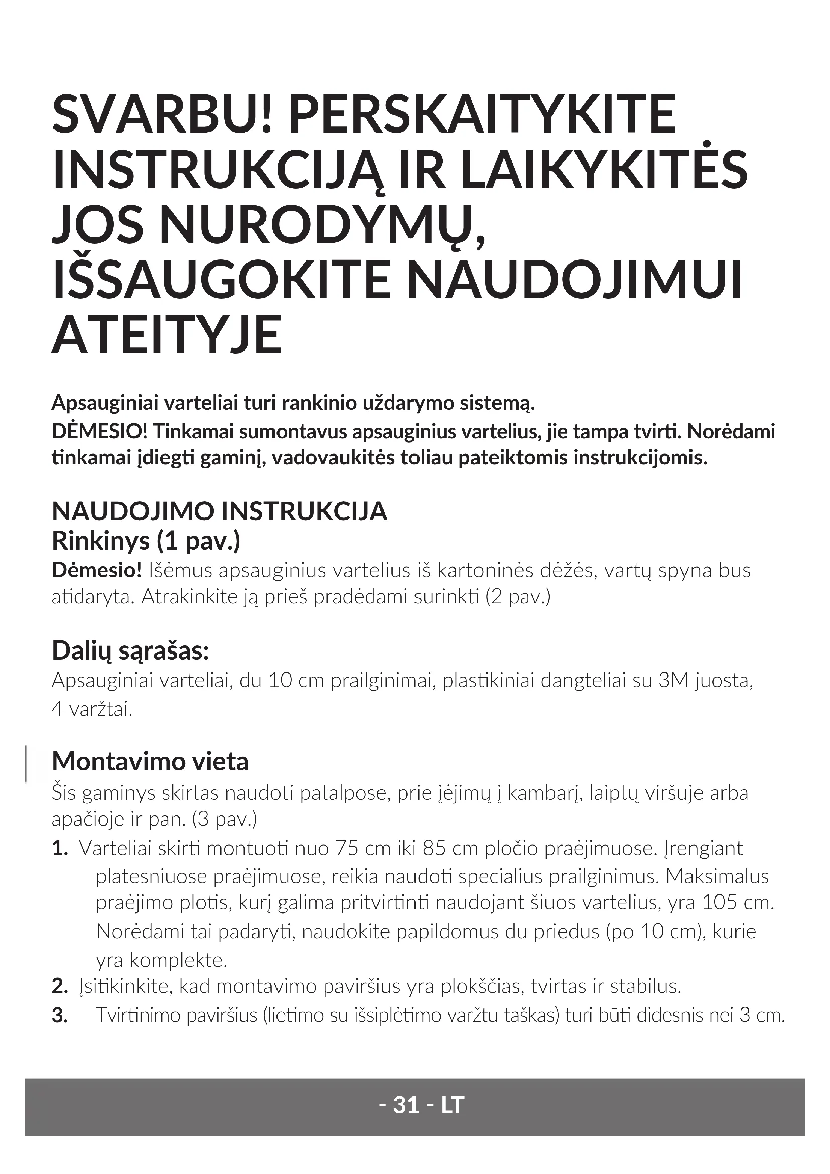 ATEITYJE Apsauginiai varteliai turi rankinio uždarymo sistemą. DĖMESIO! Tinkamai sumontavus apsauginius vartelius, jie tampa tvir. Norėdami nkamai įdieg gaminį, vadovaukitės toliau pateiktomis instrukcijomis. NAUDOJIMO INSTRUKCIJA Rinkinys (1 pav.) Dėmesio! Išėmus apsauginius vartelius iš kartoninės dėžės, vartų spyna bus adaryta. Atrakinkite ją prieš pradėdami surink (2 pav.) Dalių sąrašas: Apsauginiai varteliai, du 10 cm prailginimai, plaskiniai dangteliai su 3M juosta, 4 varžtai. Montavimo vieta Šis gaminys skirtas naudo patalpose, prie įėjimų į kambarį, laiptų viršuje arba apačioje ir pan. (3 pav.)