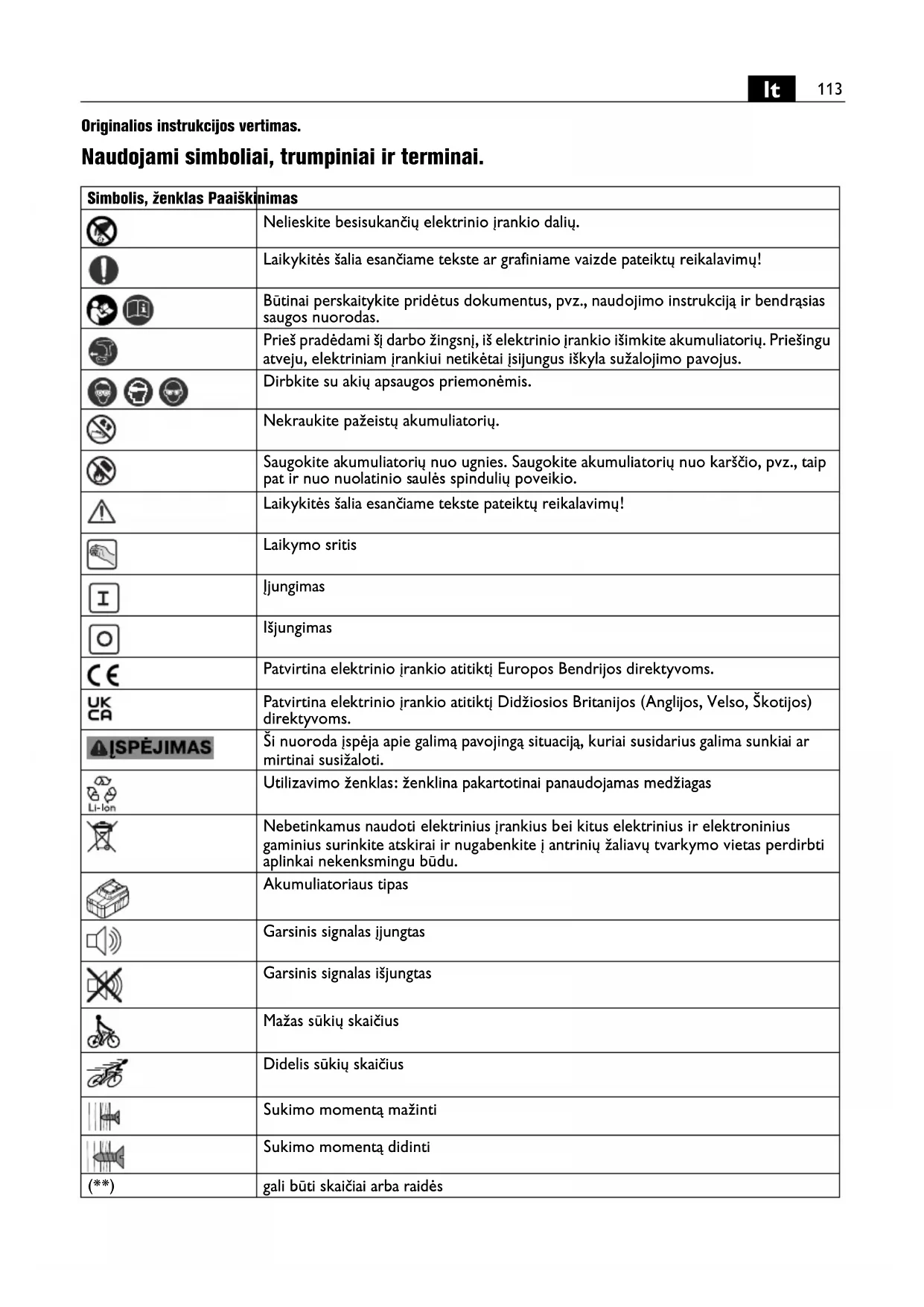 Originalios instrukcijos vertimas. Naudojami simboliai, trumpiniai ir terminai. Simbolis, ženklas Paaiškinimas Nelieskite besisukančių elektrinio įrankio dalių. Laikykitės šalia esančiame tekste ar grafiniame vaizde pateiktų reikalavimų! Būtinai perskaitykite pridėtus dokumentus, pvz., naudojimo instrukciją ir bendrąsias saugos nuorodas. Prieš pradėdami šį darbo žingsnį, iš elektrinio įrankio išimkite akumuliatorių. Priešingu atveju, elektriniam įrankiui netikėtai įsijungus iškyla sužalojimo pavojus. Dirbkite su akių apsaugos priemonėmis. Nekraukite pažeistų akumuliatorių. Saugokite akumuliatorių nuo ugnies. Saugokite akumuliatorių nuo karščio, pvz., taip pat ir nuo nuolatinio saulės spindulių poveikio. Laikykitės šalia esančiame tekste pateiktų reikalavimų! Laikymo sritis Įjungimas Išjungimas Patvirtina elektrinio įrankio atitiktį Europos Bendrijos direktyvoms. Patvirtina elektrinio įrankio atitiktį Didžiosios Britanijos (Anglijos, Velso, Škotijos) direktyvoms. Ši nuoroda įspėja apie galimą pavojingą situaciją, kuriai susidarius galima sunkiai ar mirtinai susižaloti. Utilizavimo ženklas: ženklina pakartotinai panaudojamas medžiagas Nebetinkamus naudoti elektrinius įrankius bei kitus elektrinius ir elektroninius gaminius surinkite atskirai ir nugabenkite į antrinių žaliavų tvarkymo vietas perdirbti aplinkai nekenksmingu bū du. Akumuliatoriaus tipas Garsinis signalas įjungtas Garsinis signalas išjungtas Mažas sūkių skaičius Didelis sūkių skaičius Sukimo momentą mažinti Sukimo momentą didinti (**) gali būti skaičiai arba raidės114