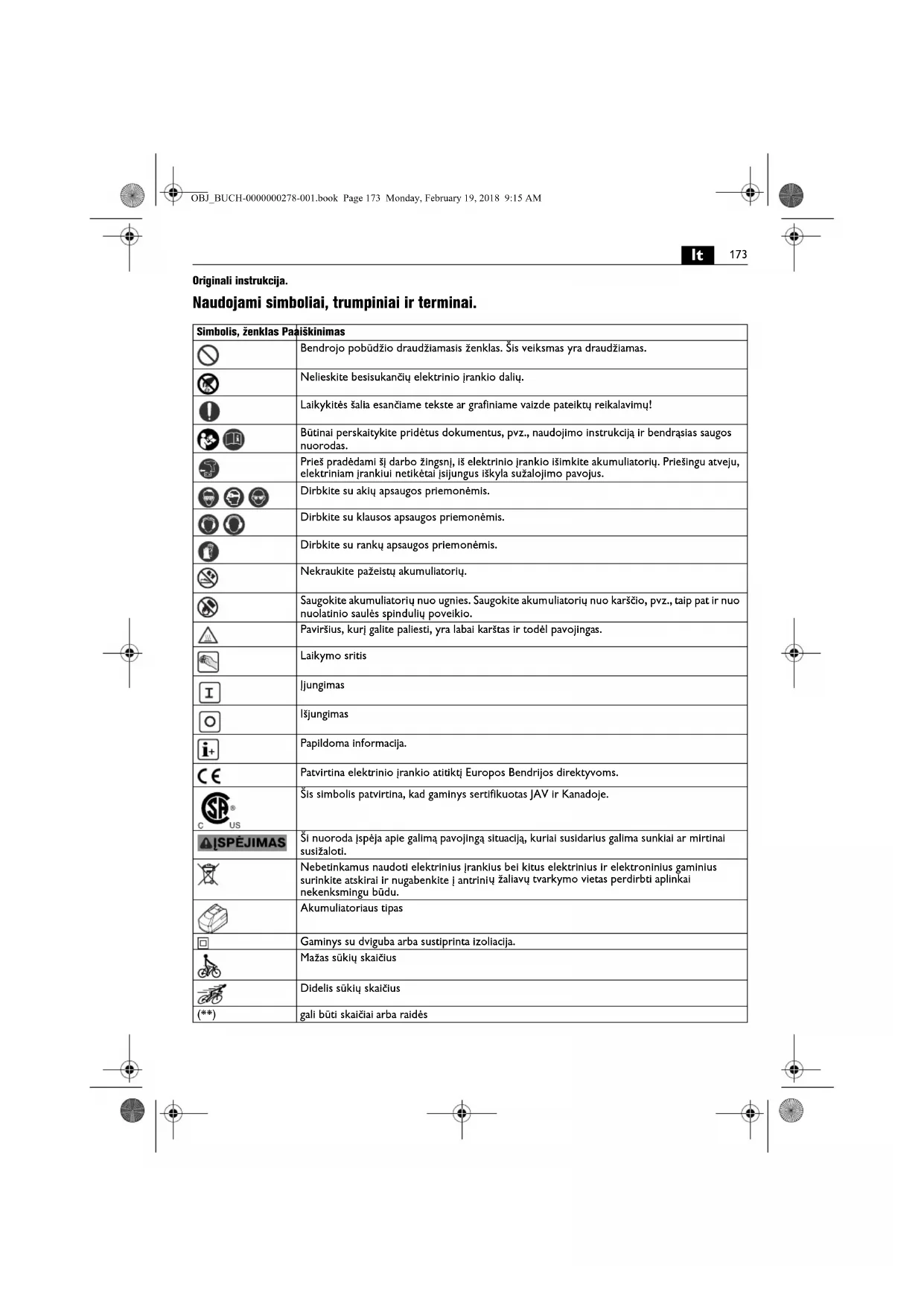 Originali instrukcija. Naudojami simboliai, trumpiniai ir terminai. Simbolis, ženklas Paaiškinimas Bendrojo pobūdžio draudžiamasis ženklas. Šis veiksmas yra draudžiamas. Nelieskite besisukančių elektrinio įrankio dalių. Laikykitės šalia esančiame tekste ar grafiniame vaizde pateiktų reikalavimų! Būtinai perskaitykite pridėtus dokumentus, pvz., naudojimo instrukciją ir bendrąsias saugos nuorodas. Prieš pradėdami šį darbo žingsnį, iš elektrinio įrankio išimkite akumuliatorių. Priešingu atveju, elektriniam įrankiui netikėtai įsijungus iškyla sužalojimo pavojus. Dirbkite su akių apsaugos priemonėmis. Dirbkite su klausos apsaugos priemonėmis. Dirbkite su rankų apsaugos priemonėmis. Nekraukite pažeistų akumuliatorių. Saugokite akumuliatorių nuo ugnies. Saugokite akumuliatorių nuo karščio, pvz., taip pat ir nuo nuolatinio saulės spindulių poveikio. Paviršius, kurį galite paliesti, yra labai karštas ir todėl pavojingas. Laikymo sritis Įjungimas Išjungimas Papildoma informacija. Patvirtina elektrinio įrankio atitiktį Europos Bendrijos direktyvoms. Šis simbolis patvirtina, kad gaminys sertifikuotas JAV ir Kanadoje. Ši nuoroda įspėja apie galimą pavojingą situaciją, kuriai susidarius galima sunkiai ar mirtinai susižaloti. Nebetinkamus naudoti elektrinius įrankius bei kitus elektrinius ir elektroninius gaminius surinkite atskirai ir nugabenkite į antrini ų žaliavų tvarkymo vietas perdirbti aplinkai nekenksmingu būdu. Akumuliatoriaus tipas Gaminys su dviguba arba sustiprinta izoliacija. Mažas sūkių skaičius Didelis sūkių skaičius (**) gali būti skaičiai arba raidės OBJ_BUCH-0000000278-001.book Page 173 Monday, February 19, 2018 9:15 AM174