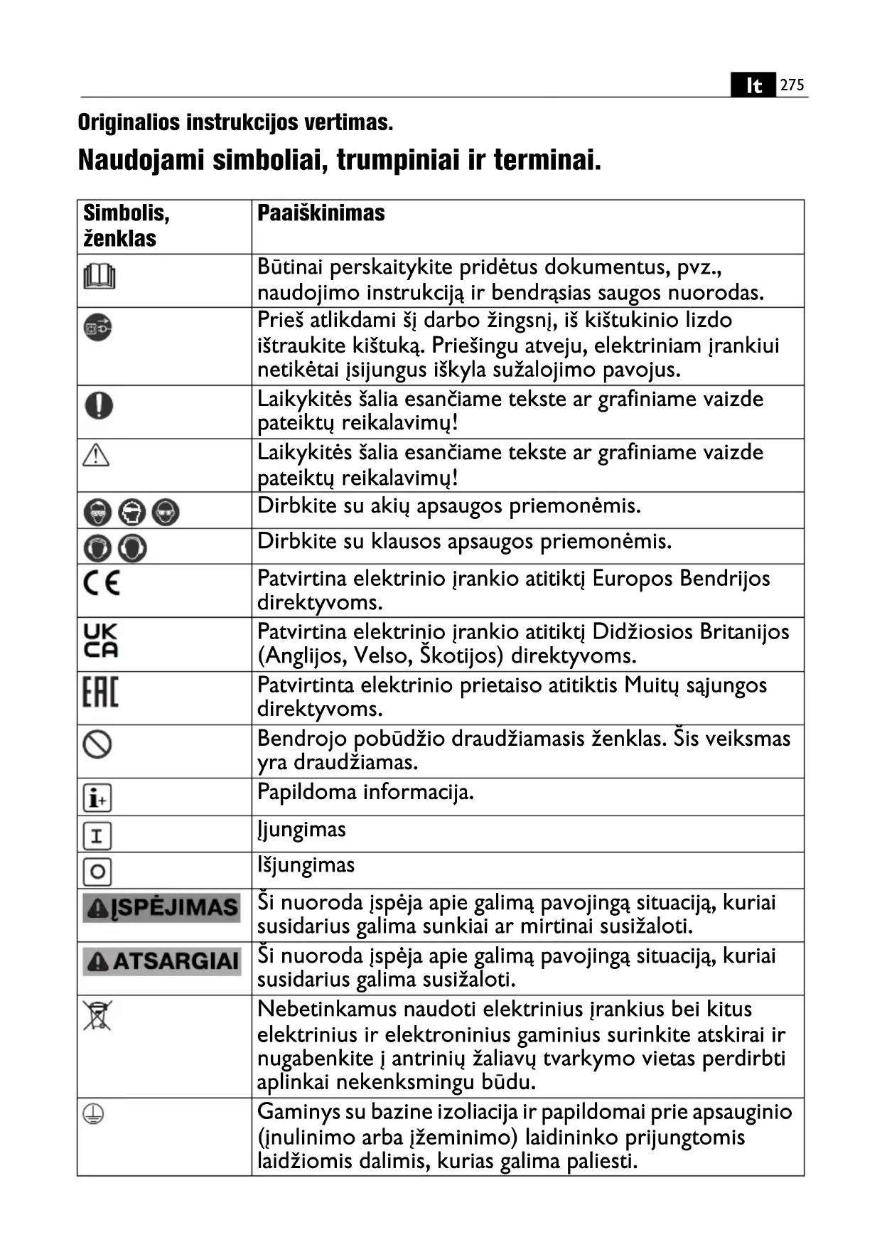 Originalios instrukcijos vertimas. Naudojami simboliai, trumpiniai ir terminai. Simbolis, ženklas Paaiškinimas Būtinai perskaitykite pridėtus dokumentus, pvz., naudojimo instrukciją ir bendrąsias saugos nuorodas. Prieš atlikdami šį darbo žingsnį, iš kištukinio lizdo ištraukite kištuką. Priešingu atveju, elektriniam įrankiui netikėtai įsijungus iškyla sužalojimo pavojus. Laikykitės šalia esančiame tekste ar grafiniame vaizde pateiktų reikalavimų! Laikykitės šalia esančiame tekste ar grafiniame vaizde pateiktų reikalavimų! Dirbkite su akių apsaugos priemonėmis. Dirbkite su klausos apsaugos priemonėmis. Patvirtina elektrinio įrankio atitiktį Europos Bendrijos direktyvoms. Patvirtina elektrinio įrankio atitiktį Didžiosios Britanijos (Anglijos, Velso, Škotijos) direktyvoms. Patvirtinta elektrinio prietaiso atitiktis Muitų sąjungos direktyvoms. Bendrojo pobūdžio draudžiamasis ženklas. Šis veiksmas yra draudžiamas. Papildoma informacija. Įjungimas Išjungimas Ši nuoroda įspėja apie galimą pavojingą situaciją, kuriai susidarius galima sunkiai ar mirtinai susižaloti. Ši nuoroda įspėja apie galimą pavojingą situaciją, kuriai susidarius galima susižaloti. Nebetinkamus naudoti elektrinius įrankius bei kitus elektrinius ir elektroninius gaminius surinkite atskirai ir nugabenkite į antrinių žaliavų tvarkymo vietas perdirbti aplinkai nekenksmingu būdu. Gaminys su bazine izoliacija ir papildomai prie apsauginio (įnulinimo arba įžeminimo) laidininko prijungtomis laidžiomis dalimis, kurias galima paliesti.276