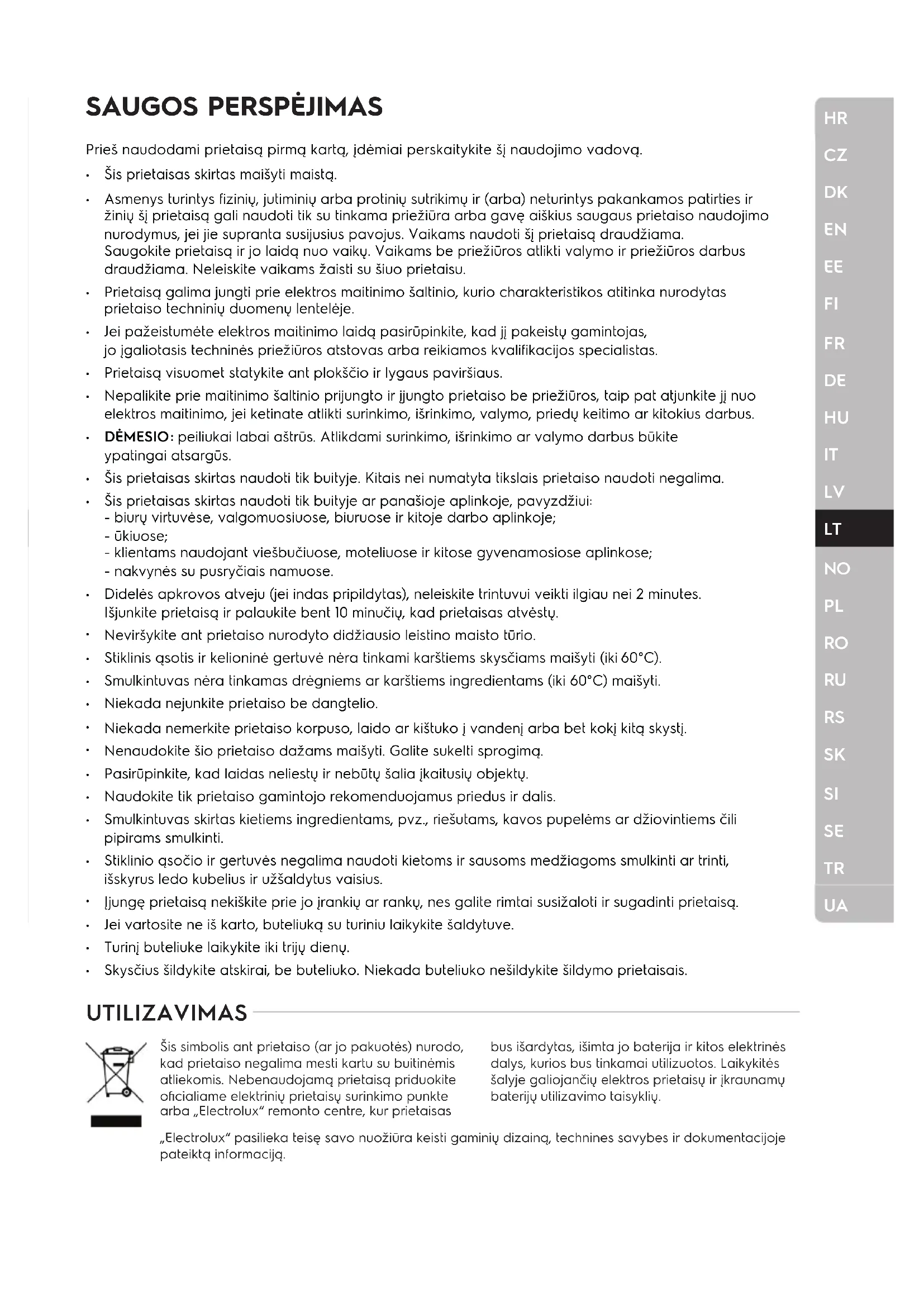 Šis prietaisas skirtas maišyti maistą. Asmenys turintys f izinių, jutiminių arba protinių sutrikimų ir (arba) neturintys pakankamos patirties ir žinių šį prietaisą gali naudoti tik su tinkama priežiūra arba gavę aiškius saugaus prietaiso naudojimo nurodymus, jei jie supranta susijusius pavojus. Vaikams naudoti šį prietaisą draudžiama. Saugokite prietaisą ir jo laidą nuo vaikų. Vaikams be priežiūros atlikti valymo ir priežiūros darbus draudžiama. Neleiskite vaikams žaisti su šiuo prietaisu. Prietaisą galima jungti prie elektros maitinimo šaltinio, kurio charakteristikos atitinka nurodytas prietaiso techninių duomenų lentelėje. Jei pažeistumėte elektros maitinimo laidą pasirūpinkite, kad jį pakeistų gamintojas, jo įgaliotasis techninės priežiūros atstovas arba reikiamos kvalif ikacijos specialistas. Prietaisą visuomet statykite ant plokščio ir lygaus paviršiaus. Nepalikite prie maitinimo šaltinio prijungto ir įjungto prietaiso be priežiūros, taip pat atjunkite jį nuo elektros maitinimo, jei ketinate atlikti surinkimo, išrinkimo, valymo, priedų keitimo ar kitokius darbus. DĖMESIO: peiliukai labai aštrūs. Atlikdami surinkimo, išrinkimo ar valymo darbus būkite ypatingai atsargūs. Šis prietaisas skirtas naudoti tik buityje. Kitais nei numatyta tikslais prietaiso naudoti negalima. Šis prietaisas skirtas naudoti tik buityje ar panašioje aplinkoje, pavyzdžiui: - biurų virtuvėse, valgomuosiuose, biuruose ir kitoje darbo aplinkoje; - ūkiuose; - klientams naudojant viešbučiuose, moteliuose ir kitose gyvenamosiose aplinkose; - nakvynės su pusryčiais namuose. Didelės apkrovos atveju (jei indas pripildytas), neleiskite trintuvui veikti ilgiau nei 2 minutes. Išjunkite prietaisą ir palaukite bent 10 minučių, kad prietaisas atvėstų. Neviršykite ant prietaiso nurodyto didžiausio leistino maisto tūrio. Stiklinis ąsotis ir kelioninė gertuvė nėra tinkami karštiems skysčiams maišyti (iki 60°C). Smulkintuvas nėra tinkamas drėgniems ar karštiems ingredientams (iki 60°C) maišyti. Niekada nejunkite prietaiso be dangtelio. Niekada nemerkite prietaiso korpuso, laido ar kištuko į vandenį arba bet kokį kitą skystį. Nenaudokite šio prietaiso dažams maišyti. Galite sukelti sprogimą. Pasirūpinkite, kad laidas neliestų ir nebūtų šalia įkaitusių objektų. Naudokite tik prietaiso gamintojo rekomenduojamus priedus ir dalis. Smulkintuvas skirtas kietiems ingredientams, pvz., riešutams, kavos pupelėms ar džiovintiems čili pipirams smulkinti. Stiklinio ąsočio ir gertuvės negalima naudoti kietoms ir sausoms medžiagoms smulkinti ar trinti, išskyrus ledo kubelius ir užšaldytus vaisius. Įjungę prietaisą nekiškite prie jo įrankių ar rankų, nes galite rimtai susižaloti ir sugadinti prietaisą. Jei vartosite ne iš karto, buteliuką su turiniu laikykite šaldytuve. Turinį buteliuke laikykite iki trijų dienų. Skysčius šildykite atskirai, be buteliuko. Niekada buteliuko nešildykite šildymo prietaisais. UTILIZAVIMAS „Electrolux“ pasilieka teisę savo nuožiūra keisti gaminių dizainą, technines savybes ir dokumentacijoje pateiktą informaciją. Šis simbolis ant prietaiso (ar jo pakuotės) nurodo, kad prietaiso negalima mesti kartu su buitinėmis atliekomis. Nebenaudojamą prietaisą priduokite oficialiame elektrinių prietaisų surinkimo punkte arba „Electrolux“ remonto centre, kur prietaisas bus išardytas, išimta jo baterija ir kitos elektrinės dalys, kurios bus tinkamai utilizuotos. Laikykitės šalyje galiojančių elektros prietaisų ir įkraunamų baterijų utilizavimo taisyklių.HR