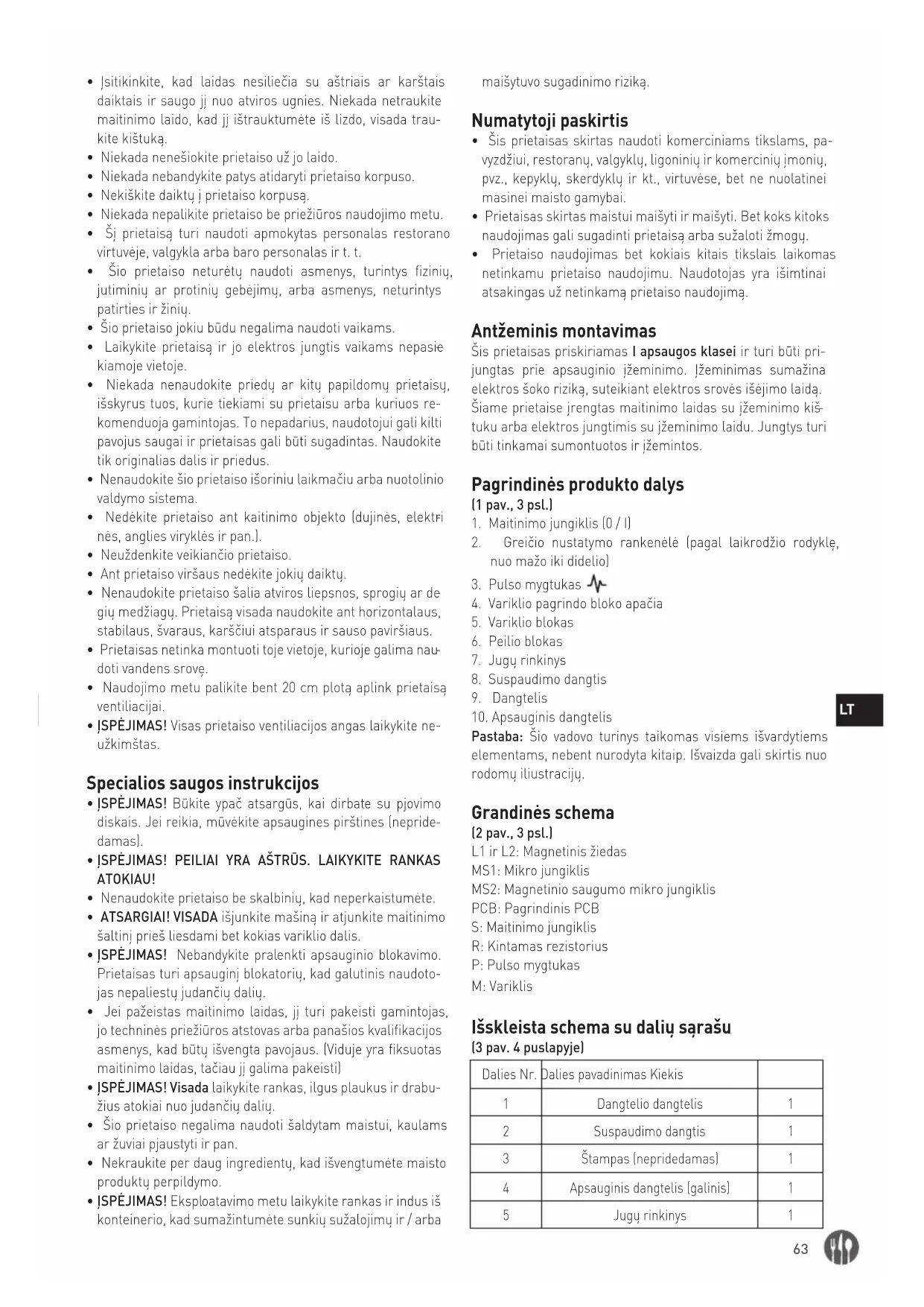 tuku arba elektros jungtimis su įžeminimo laidu. Jungtys turi būti tinkamai sumontuotos ir įžemintos. Pagrindinės produkto dalys (1 pav., 3 psl.)