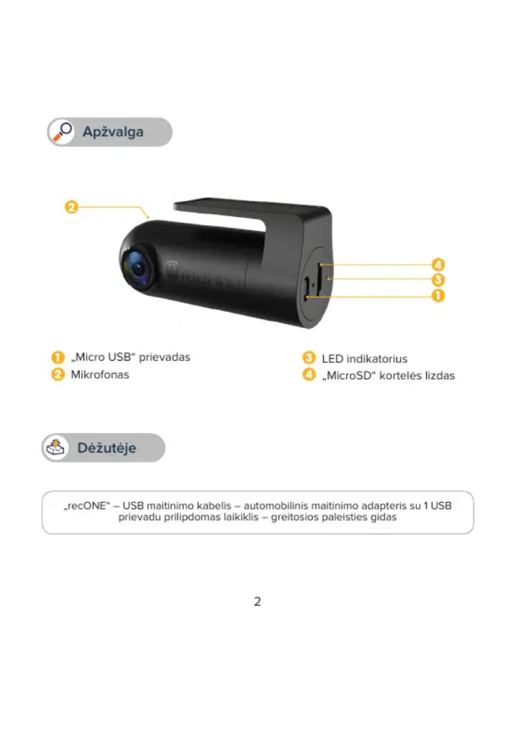 - Įrenginys „recONE“ veikia su 10 klasės „microSD“ kortelėmis iki 128 GB