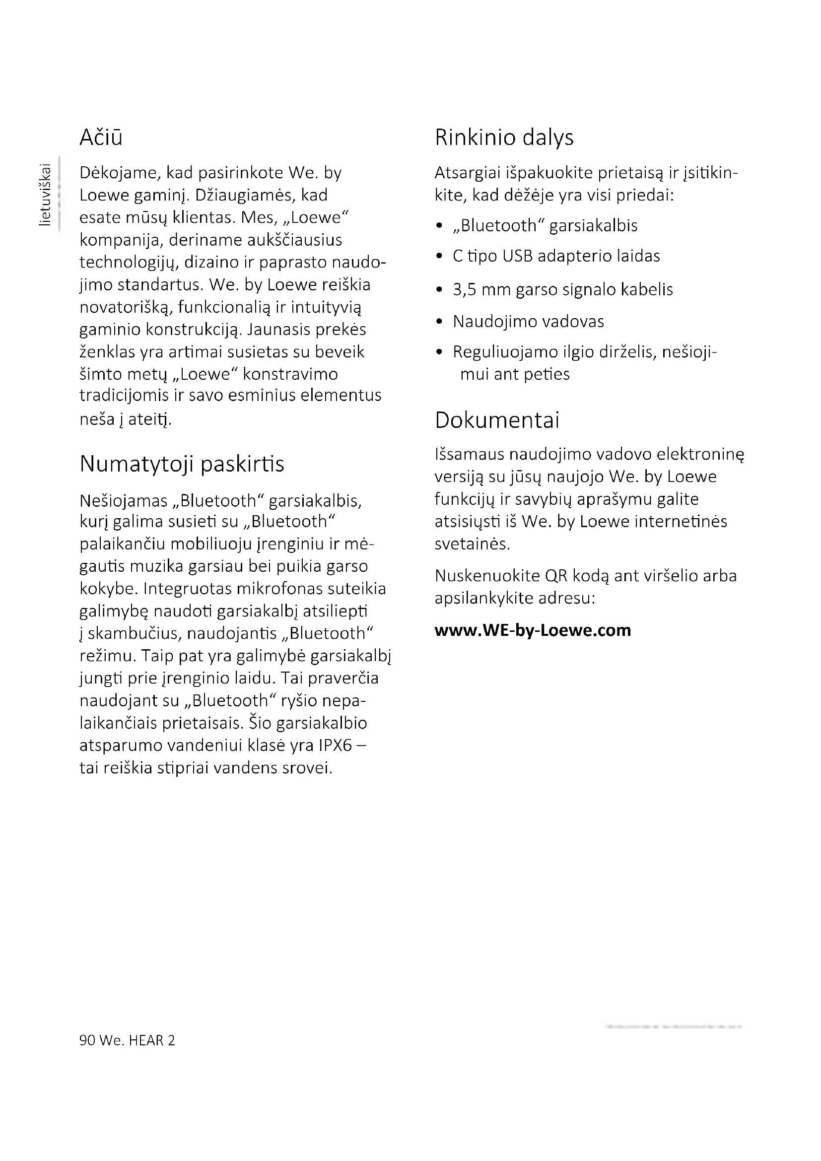 užgesta. 9 IPX6 klasės atsparumas vandeniui Šis įrenginys yra IPX6 atsparumo vandeniui klasės. Tai reiškia, kad sprios vandens srovės jam nepakenks. Kad apsauga veiktų, prie garsiakalbio negali bū prijungta jokių išorinių prietaisų laidais (pvz., telefonas garso signalo perdavimo laidu arba USB įkroviklis), o jungčių skyrelis privalo bū sandariai uždarytas.96 We. HEAR 2 lietuviškai Trikčių nustatymas ir šalinimas Pasitaikius nesklandumų, prieš skambinant pagalbos linija, rekomenduojame peržiū- rė šį sąrašą. Problema Galima priežass: Šalinimo būdas / pastabos Garsiakalbis neįsijungia. Gali bū labai žemas akumulia- toriaus įkrovimo lygis. Įkraukite garsiakalbio akumu- liatorių. Akumuliatorių įkrau reikia labai daug laiko. Jūsų naudojamas USB įkroviklis ekia labai silpną srovę. Naudokite 5 V / 2 A srovės įkroviklį. Nėra garso iš garsiakalbio. a. Per žemas garsumo lygis arba jis užldytas. b. Su garsiakalbiu nėra susie- tas joks prietaisas. a. Kelis kartus paspauskite (+) mygtuką arba padidinkite garsumą savo prietaise. b. Susiekite ir įjunkite „Blueto- oth“ prietaisą. Garsas iškraipomas a. Jūsų „Bluetooth“ prietaisas yra per toli nuo garsia- kalbio. b. Belaidžio ryšio trukdžiai. a. Padėkite prietaisą arčiau garsiakalbio. b. Patraukite garsiakalbį toliau nuo kitų belaidį ryšį naudojančių prietaisų. Techniniai duomenys We. by Loewe prietaiso tipas: We. HEAR 2 Dalies numeris: 60702x10 Akumuliatoriaus tipas: Įmontuotas ličio jonų 7,4 V / 4000 mAh Įkrovimo srovė: 5 V / 2 A Veikimo trukmė: 15 – 17 h Įkrovimo trukmė: 4 – 5 h Garsiakalbis 2x 15 W RMS Atsparumas vandeniui IPX6 „Bluetooth“ versija V5.0 „Bluetooth“ maitinimo / dažnio diapazonas: Didžiausia srovė < 10 mW esant 2402 - 2480 MHz „Bluetooth“ protokolai: A2DP, AVRCP Prietaiso matmenys (plotis x aukštis x gylis): 118 x 290 x 112 mm Prietaiso svoris: 2 kg Aplinkos temperatūra: 0 °C – 40 °C Santykinė drėgmė (kondensacija nevyksta): 20 – 70%We. HEAR 2 97 lietuviškai98 We. HEAR 2 eesti Suur tänu We. by Loewe toote valimise eest Meil on hea meel, et olete meie klient. Loewe ühendab endas tehnoloo- gia, disaini ja kasutajasõbralikkuse kõrgeimad standardid. We. by Loewe tähendab innovaalist, funktsionaalset ja intuiivset tootedisaini. Noor kauba- märk on hedalt seotud Loewe ligi saja aastase disainipärandiga ja kannab selle tuumelemente tulevikku. Kasutuseesmärk Portaivne Bluetooth-kõlar, mida võite siduda Bluetooth-mobiiliseadmega ning nauda suure helitugevuse ja laitmatu helikvaliteediga muusikat. Sisseehitatud mikrofoni abil saate kõlarit kasutada Bluetooth-režiimis telefonikõnedele vastamiseks. Samu on võimalik kõlarit ja seadet ühendada helijuhtmega, mis on hea lahendus Bluetooth-toeta seadmete ühendamisel. Kõlar on kait- seklassiga IPX6, mis muudab ta tugevate veejugade suhtes vastupidavaks. Komplek sisu Pakkige seade eevaatlikult lah ja veenduge, et kõik tarvikud oleksid olemas: