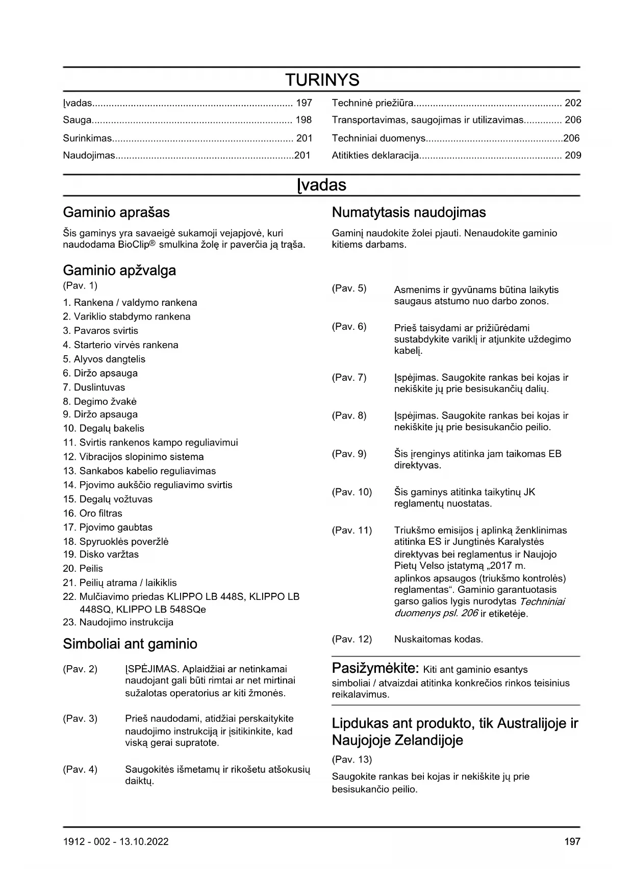 Simboliai ant gaminio (Pav. 2) ĮSPĖJIMAS. Aplaidžiai ar netinkamai naudojant gali būti rimtai ar net mirtinai sužalotas operatorius ar kiti žmonės. (Pav. 3) Prieš naudodami, atidžiai perskaitykite naudojimo instrukciją ir įsitikinkite, kad viską gerai supratote. (Pav. 4) Saugokitės išmetamų ir rikošetu atšokusių daiktų. (Pav. 5) Asmenims ir gyvūnams būtina laikytis saugaus atstumo nuo darbo zonos. (Pav. 6) Prieš taisydami ar prižiūrėdami sustabdykite variklį ir atjunkite uždegimo kabelį. (Pav. 7) Įspėjimas. Saugokite rankas bei kojas ir nekiškite jų prie besisukančių dalių. (Pav. 8) Įspėjimas. Saugokite rankas bei kojas ir nekiškite jų prie besisukančio peilio. (Pav. 9) Šis įrenginys atitinka jam taikomas EB direktyvas. (Pav. 10) Šis gaminys atitinka taikytinų JK reglamentų nuostatas. (Pav. 11) Triukšmo emisijos į aplinką ženklinimas atitinka ES ir Jungtinės Karalystės direktyvas bei reglamentus ir Naujojo Pietų Velso įstatymą „2017m. aplinkos apsaugos (triukšmo kontrolės) reglamentas“. Gaminio garantuotasis garso galios lygis nurodytas Techniniai duomenys psl. 206 ir etiketėje. (Pav. 12) Nuskaitomas kodas. Pasižymėkite: Kiti ant gaminio esantys simboliai / atvaizdai atitinka konkrečios rinkos teisinius reikalavimus. Lipdukas ant produkto, tik Australijoje ir Naujojoje Zelandijoje (Pav. 13) Saugokite rankas bei kojas ir nekiškite jų prie besisukančio peilio. 1912 - 002 - 13.10.2022 197„Euro V“ standartas PERSPĖJIMAS: Variklio modifikavimas panaikina šio produkto ES tipo patvirtinimą. Atsakomybė už gaminį Kaip nurodyta atsakomybės už gaminį įstatymuose, mes nesame atsakingi už mūsų gaminio sukeltą žalą, jei: