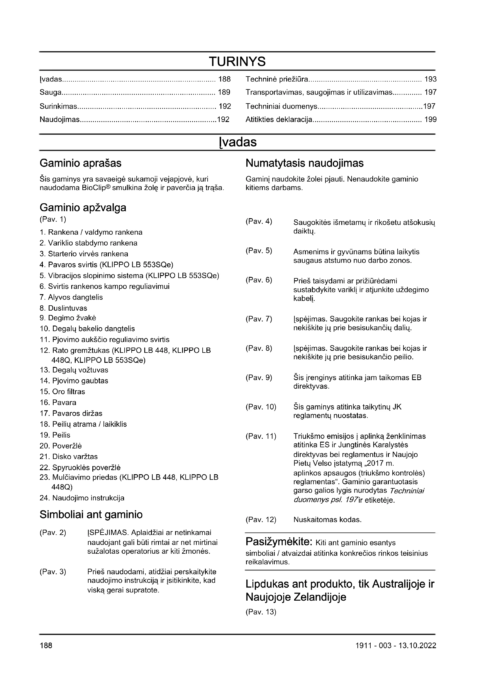 Simboliai ant gaminio (Pav. 2) ĮSPĖJIMAS. Aplaidžiai ar netinkamai naudojant gali būti rimtai ar net mirtinai sužalotas operatorius ar kiti žmonės. (Pav. 3) Prieš naudodami, atidžiai perskaitykite naudojimo instrukciją ir įsitikinkite, kad viską gerai supratote. (Pav. 4) Saugokitės išmetamų ir rikošetu atšokusių daiktų. (Pav. 5) Asmenims ir gyvūnams būtina laikytis saugaus atstumo nuo darbo zonos. (Pav. 6) Prieš taisydami ar prižiūrėdami sustabdykite variklį ir atjunkite uždegimo kabelį. (Pav. 7) Įspėjimas. Saugokite rankas bei kojas ir nekiškite jų prie besisukančių dalių. (Pav. 8) Įspėjimas. Saugokite rankas bei kojas ir nekiškite jų prie besisukančio peilio. (Pav. 9) Šis įrenginys atitinka jam taikomas EB direktyvas. (Pav. 10) Šis gaminys atitinka taikytinų JK reglamentų nuostatas. (Pav. 11) Triukšmo emisijos į aplinką ženklinimas atitinka ES ir Jungtinės Karalystės direktyvas bei reglamentus ir Naujojo Pietų Velso įstatymą „2017m. aplinkos apsaugos (triukšmo kontrolės) reglamentas“. Gaminio garantuotasis garso galios lygis nurodytas Techniniai duomenys psl. 197 ir etiketėje. (Pav. 12) Nuskaitomas kodas. Pasižymėkite: Kiti ant gaminio esantys simboliai / atvaizdai atitinka konkrečios rinkos teisinius reikalavimus. Lipdukas ant produkto, tik Australijoje ir Naujojoje Zelandijoje (Pav. 13)