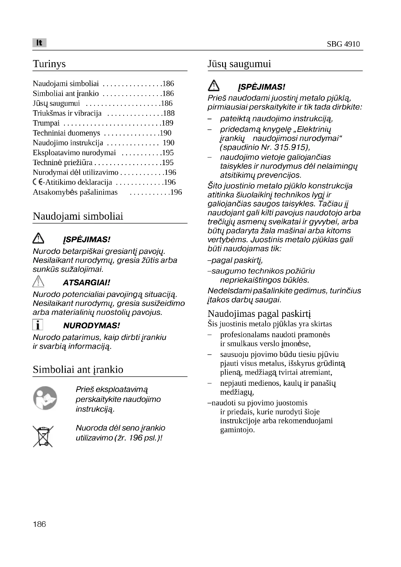 Naudojami simboliai ĮSPĖJIMAS! Nurodo betarpiškai gresiantį pavojų. Nesilaikant nurodymų, gresia žūtis arba sunkūs sužalojimai. ATSARGIAI! Nurodo potencialiai pavojingą situaciją. Nesilaikant nurodymų, gresia susižeidimo arba materialinių nuostolių pavojus. NURODYMAS! Nurodo patarimus, kaip dirbti įrankiu ir svarbią informaciją. Simboliai ant įrankio Prieš eksploatavimą perskaitykite naudojimo instrukciją. Nuoroda dėl seno įrankio utilizavimo (žr. 196 psl.)! Jūsų saugumui ĮSPĖJIMAS! Prieš naudodami juostinį metalo pjūklą, pirmiausiai perskaitykite ir tik tada dirbkite: – pateiktą naudojimo instrukciją, – pridedamą knygelę „Elektrinių įrankių naudojimosi nurodymai“ (spaudinio Nr. 315.915), – naudojimo vietoje galiojančias taisykles ir nurodymus dėl nelaimingų atsitikimų prevencijos. Šito juostinio metalo pjūklo konstrukcija atitinka šiuolaikinį technikos lygį ir galiojančias saugos taisykles. Tačiau jį naudojant gali kilti pavojus naudotojo arba trečiųjų asmenų sveikatai ir gyvybei, arba būtų padaryta žala mašinai arba kitoms vertybėms. Juostinis metalo pjūklas gali būti naudojamas tik: – pagal paskirtį, – saugumo technikos požiūriu nepriekaištingos būklės. Nedelsdami pašalinkite gedimus, turinčius įtakos darbų saugai. Naudojimas pagal paskirtį Šis juostinis metalo pjūklas yra skirtas – profesionalams naudoti pramonės ir smulkaus verslo įmonėse, – sausuoju pjovimo būdu tiesiu pjūviu pjauti visus metalus, išskyrus grūdintą plieną, medžiagą tvirtai atremiant, – nepjauti medienos, kaulų ir panašių medžiagų, – naudoti su pjovimo juostomis ir priedais, kurie nurodyti šioje instrukcijoje arba rekomenduojami gamintojo.SBG 4910