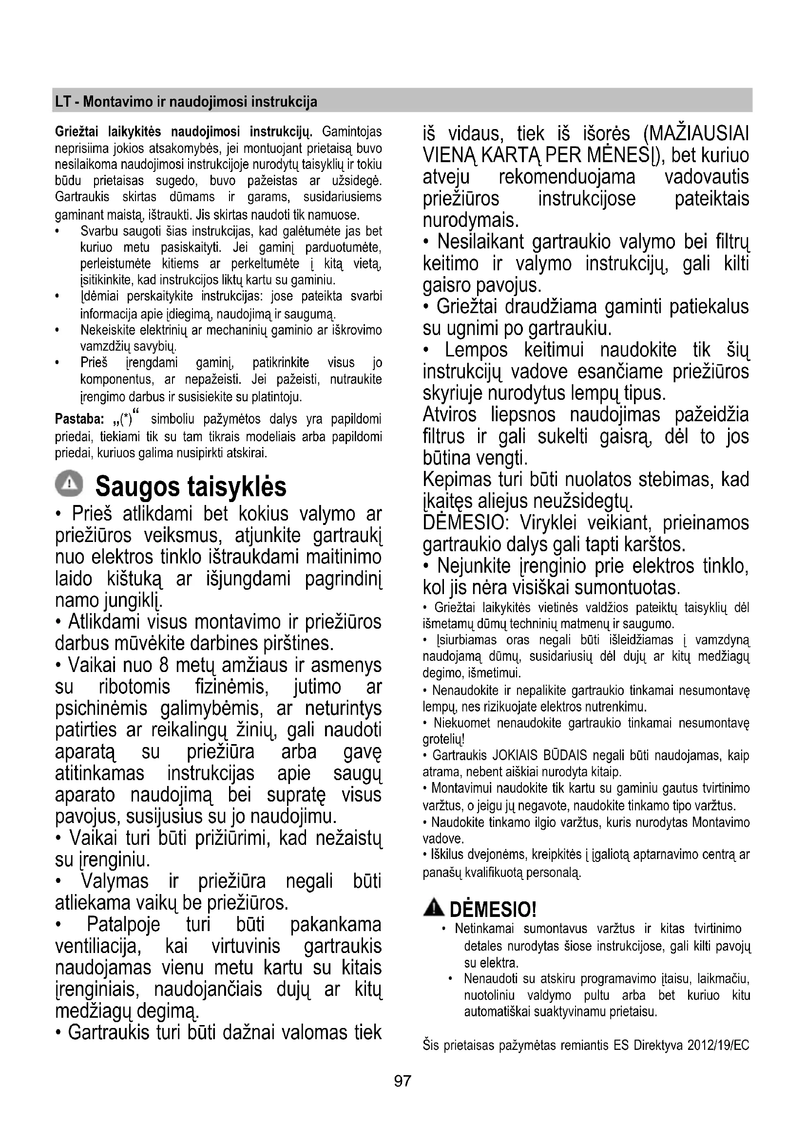 - Patalpoje turi būti pakankama ventiliacija, kai virtuvinis gartraukis naudojamas vienu metu kartu su kitais įrenginiais, naudojančiais dujų ar kitų medžiagų degimą.