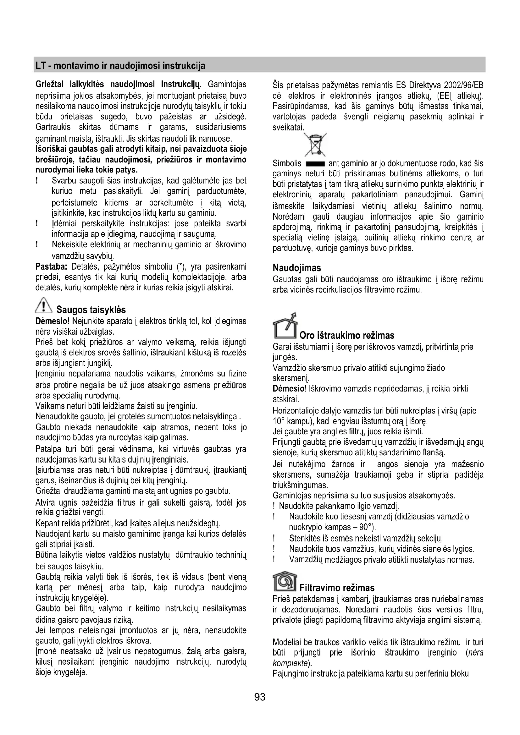 Kui valgustus ei hakka tööle, kontrollige enne tehnoabi kutsumist, kas pirn on korralikult pesas.93 LT - montavimo ir naudojimosi instrukcija Griežtai laikykitės naudojimosi instrukcijų. Gamintojas neprisiima jokios atsakomybės, jei montuojant prietaisą buvo nesilaikoma naudojimosi instrukcijoje nurodytų taisyklių ir tokiu būdu prietaisas sugedo, buvo pažeistas ar užsidegė. Gartraukis skirtas dūmams ir garams, susidariusiems gaminant maistą, ištraukti. Jis skirtas naudoti tik namuose. Išoriškai gaubtas gali atrodyti kitaip, nei pavaizduota šioje brošiūroje, tačiau naudojimosi, priežiūros ir montavimo nurodymai lieka tokie patys. ! Svarbu saugoti šias instrukcijas, kad galėtumėte jas bet kuriuo metu pasiskaityti. Jei gaminį parduotumėte, perleistumėte kitiems ar perkeltumėte į kitą vietą, įsitikinkite, kad instrukcijos liktų kartu su gaminiu. ! Įdėmiai perskaitykite instrukcijas: jose pateikta svarbi informacija apie įdiegimą, naudojimą ir saugumą. ! Nekeiskite elektrinių ar mechaninių gaminio ar iškrovimo vamzdžių savybių. Pastaba: Detalės, pažymėtos simboliu (*), yra pasirenkami priedai, esantys tik kai kurių modelių komplektacijoje, arba detalės, kurių komplekte n ėra ir kurias reikia įsigyti atskirai. Saugos taisyklės Dėmesio! Nejunkite aparato į elektros tinklą tol, kol įdiegimas nėra visiškai užbaigtas. Prieš bet kokį priežiūros ar valymo veiksmą, reikia išjungti gaubtą iš elektros srovės šaltinio, ištraukiant kištuką iš rozetės arba išjungiant jungiklį. Įrenginiu nepatariama naudotis vaikams, žmonėms su fizine arba protine negalia be už juos atsakingo asmens priežiūros arba specialių nurodymų. Vaikams neturi būti leidžiama žaisti su įrenginiu. Nenaudokite gaubto, jei grotelės sumontuotos netaisyklingai. Gaubto niekada nenaudokite kaip atramos, nebent toks jo naudojimo būdas yra nurodytas kaip galimas. Patalpa turi būti gerai vėdinama, kai virtuvės gaubtas yra naudojamas kartu su kitais dujinių įrenginiais. Įsiurbiamas oras neturi būti nukreiptas į dūmtraukį, įtraukiantį garus, išeinančius iš dujinių bei kitų įrenginių. Griežtai draudžiama gaminti maistą ant ugnies po gaubtu. Atvira ugnis pažeidžia filtrus ir gali sukelti gaisrą, todėl jos reikia griežtai vengti. Kepant reikia prižiūrėti, kad įkaitęs aliejus neužsidegtų. Naudojant kartu su maisto gaminimo įranga kai kurios detalės gali stipriai įkaisti. Būtina laikytis vietos valdžios nustatytų dūmtraukio techninių bei saugos taisyklių. Gaubtą reikia valyti tiek iš išorės, tiek iš vidaus (bent vieną kartą per mėnesį arba taip, kaip nurodyta naudojimo instrukcijų knygelėje). Gaubto bei filtrų valymo ir keitimo instrukcijų nesilaikymas didina gaisro pavojaus riziką. Jei lempos neteisingai įmontuotos ar jų nėra, nenaudokite gaubto, gali įvykti elektros iškrova. Įmonė neatsako už įvairius nepatogumus, žalą arba gaisrą, kilusį nesilaikant įrenginio naudojimo instrukcijų, nurodytų šioje knygelėje. Šis prietaisas pažymėtas remiantis ES Direktyva 2002/96/EB dėl elektros ir elektroninės į rangos atliekų, (EEĮ atliekų). Pasirūpindamas, kad šis gaminys būtų išmestas tinkamai, vartotojas padeda išvengti neigiamų pasekmių aplinkai ir sveikatai. Simbolis ant gaminio ar jo dokumentuose rodo, kad šis gaminys neturi būti priskiriamas buitinėms atliekoms, o turi būti pristatytas į tam tikrą atliekų surinkimo punktą elektrinių ir elektroninių aparatų pakartotiniam panaudojimui. Gaminį išmeskite laikydamiesi vietinių atliekų šalinimo normų. Norėdami gauti daugiau informacijos apie šio gaminio apdorojimą, rinkimą ir pakartotinį panaudojimą, kreipkitės į specialią vietinę įstaigą, buitinių atliekų rinkimo centrą ar parduotuvę, kurioje gaminys buvo pirktas. Naudojimas Gaubtas gali būti naudojamas oro ištraukimo į išorę režimu arba vidinės recirkuliacijos filtravimo režimu. Oro ištraukimo režimas Garai išstumiami į išorę per iškrovos vamzdį, pritvirtintą prie jungės. Vamzdžio skersmuo privalo atitikti sujungimo žiedo skersmenį. Dėmesio! Iškrovimo vamzdis nepridedamas, jį reikia pirkti atskirai. Horizontalioje dalyje vamzdis turi būti nukreiptas į viršų (apie 10° kampu), kad lengviau išstumtų orą į išorę. Jei gaubte yra anglies filtrų, juos reikia išimti. Prijungti gaubtą prie išvedamųjų vamzdžių ir išvedamųjų angų sienoje, kurių skersmuo atitiktų sandarinimo flanšą. Jei nutekėjimo žarnos ir angos sienoje yra mažesnio skersmens, sumažėja traukiamoji geba ir stipriai padidėja triukšmingumas. Gamintojas neprisiima su tuo susijusios atsakomybės. ! Naudokite pakankamo ilgio vamzdį. ! Naudokite kuo tiesesnį vamzdį (didžiausias vamzdžio nuokrypio kampas – 90°). ! Stenkitės iš esmės nekeisti vamzdžių sekcijų. ! Naudokite tuos vamzžius, kurių vidinės sienelės lygios. ! Vamzdžių medžiagos privalo atitikti nustatytas normas. Filtravimo režimas Prieš patekdamas į kambarį, įtraukiamas oras nuriebalinamas ir dezodoruojamas. Norėdami naudotis šios versijos filtru, privalote įdiegti papildomą filtravimo aktyviąja anglimi sistemą. Modeliai be traukos variklio veikia tik ištraukimo režimu ir turi būti prijungti prie išorinio ištraukimo įrenginio (nėra komplekte). Pajungimo instrukcija pateikiama kartu su periferiniu bloku.94 Įrengimas Jei viryklė elektrinė, mažiausias atstumas tarp viryklės kaitlentės paviršiaus ir žemiausios virtuvinio gaubto dalies turi būti 50cm, o jei viryklė dujinė ar kombinuota – 65cmo jei viryklė dujinė ar kombinuota. Jei dujinės viryklės įrengimo instrukcijoje nurodomas didesnis atstumas, būtina į tai atsižvelgti. Prijungimas prie elektros tinklo Įtampa elektros tinkle turi atitikti įtampą, nurodytą etiketėje, priklijuotoje gaubto viduje. Jei yra kištukas, reikia įjungti gaubtą į rozetę, atitinkančią gal