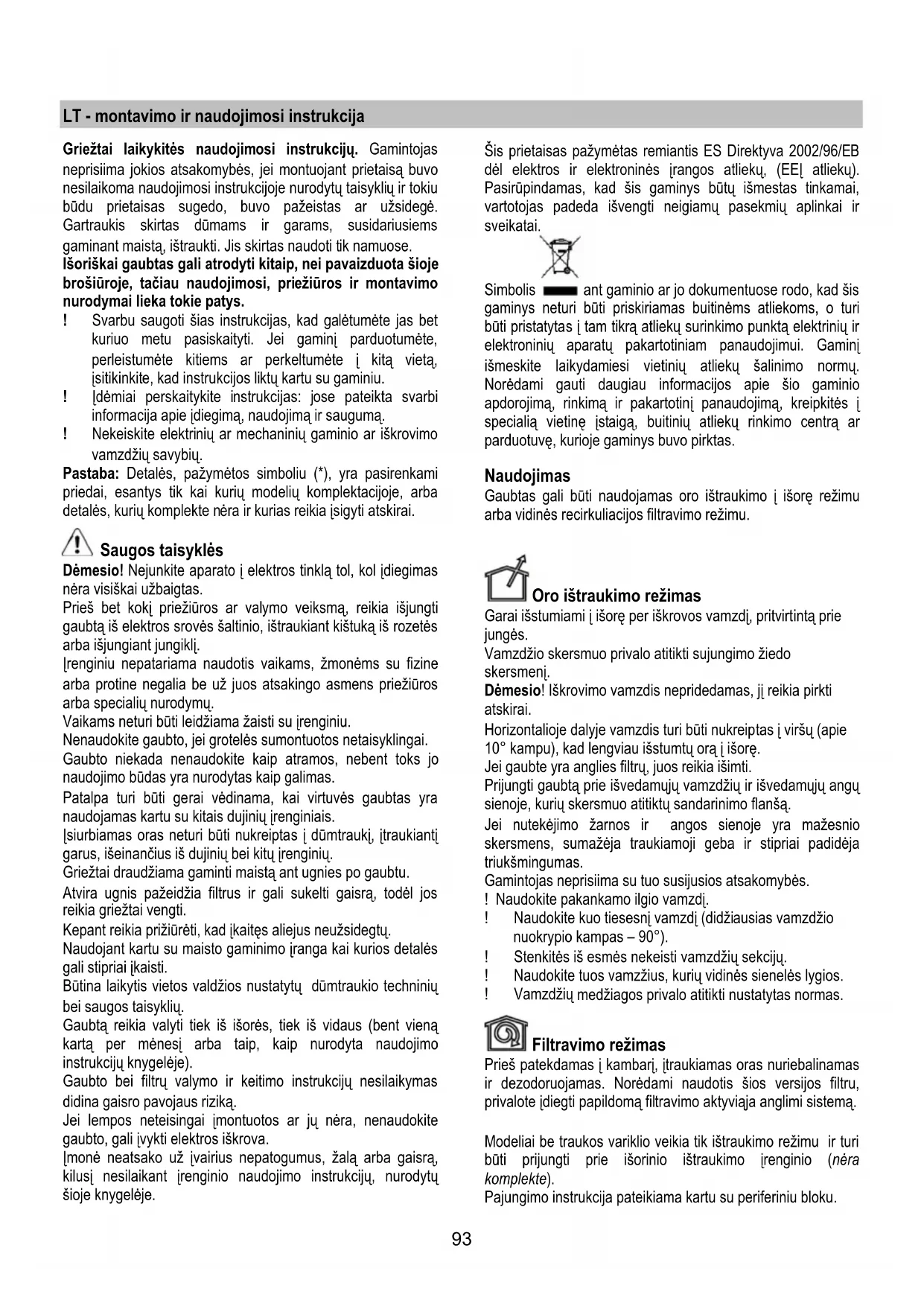 Kui valgustus ei hakka tööle, kontrollige enne tehnoabi kutsumist, kas pirn on korralikult pesas.93 LT - montavimo ir naudojimosi instrukcija Griežtai laikykitės naudojimosi instrukcijų. Gamintojas neprisiima jokios atsakomybės, jei montuojant prietaisą buvo nesilaikoma naudojimosi instrukcijoje nurodytų taisyklių ir tokiu būdu prietaisas sugedo, buvo pažeistas ar užsidegė. Gartraukis skirtas dūmams ir garams, susidariusiems gaminant maistą, ištraukti. Jis skirtas naudoti tik namuose. Išoriškai gaubtas gali atrodyti kitaip, nei pavaizduota šioje brošiūroje, tačiau naudojimosi, priežiūros ir montavimo nurodymai lieka tokie patys. ! Svarbu saugoti šias instrukcijas, kad galėtumėte jas bet kuriuo metu pasiskaityti. Jei gaminį parduotumėte, perleistumėte kitiems ar perkeltumėte į kitą vietą, įsitikinkite, kad instrukcijos liktų kartu su gaminiu. ! Įdėmiai perskaitykite instrukcijas: jose pateikta svarbi informacija apie įdiegimą, naudojimą ir saugumą. ! Nekeiskite elektrinių ar mechaninių gaminio ar iškrovimo vamzdžių savybių. Pastaba: Detalės, pažymėtos simboliu (*), yra pasirenkami priedai, esantys tik kai kurių modelių komplektacijoje, arba detalės, kurių komplekte n ėra ir kurias reikia įsigyti atskirai. Saugos taisyklės Dėmesio! Nejunkite aparato į elektros tinklą tol, kol įdiegimas nėra visiškai užbaigtas. Prieš bet kokį priežiūros ar valymo veiksmą, reikia išjungti gaubtą iš elektros srovės šaltinio, ištraukiant kištuką iš rozetės arba išjungiant jungiklį. Įrenginiu nepatariama naudotis vaikams, žmonėms su fizine arba protine negalia be už juos atsakingo asmens priežiūros arba specialių nurodymų. Vaikams neturi būti leidžiama žaisti su įrenginiu. Nenaudokite gaubto, jei grotelės sumontuotos netaisyklingai. Gaubto niekada nenaudokite kaip atramos, nebent toks jo naudojimo būdas yra nurodytas kaip galimas. Patalpa turi būti gerai vėdinama, kai virtuvės gaubtas yra naudojamas kartu su kitais dujinių įrenginiais. Įsiurbiamas oras neturi būti nukreiptas į dūmtraukį, įtraukiantį garus, išeinančius iš dujinių bei kitų įrenginių. Griežtai draudžiama gaminti maistą ant ugnies po gaubtu. Atvira ugnis pažeidžia filtrus ir gali sukelti gaisrą, todėl jos reikia griežtai vengti. Kepant reikia prižiūrėti, kad įkaitęs aliejus neužsidegtų. Naudojant kartu su maisto gaminimo įranga kai kurios detalės gali stipriai įkaisti. Būtina laikytis vietos valdžios nustatytų dūmtraukio techninių bei saugos taisyklių. Gaubtą reikia valyti tiek iš išorės, tiek iš vidaus (bent vieną kartą per mėnesį arba taip, kaip nurodyta naudojimo instrukcijų knygelėje). Gaubto bei filtrų valymo ir keitimo instrukcijų nesilaikymas didina gaisro pavojaus riziką. Jei lempos neteisingai įmontuotos ar jų nėra, nenaudokite gaubto, gali įvykti elektros iškrova. Įmonė neatsako už įvairius nepatogumus, žalą arba gaisrą, kilusį nesilaikant įrenginio naudojimo instrukcijų, nurodytų šioje knygelėje. Šis prietaisas pažymėtas remiantis ES Direktyva 2002/96/EB dėl elektros ir elektroninės į rangos atliekų, (EEĮ atliekų). Pasirūpindamas, kad šis gaminys būtų išmestas tinkamai, vartotojas padeda išvengti neigiamų pasekmių aplinkai ir sveikatai. Simbolis ant gaminio ar jo dokumentuose rodo, kad šis gaminys neturi būti priskiriamas buitinėms atliekoms, o turi būti pristatytas į tam tikrą atliekų surinkimo punktą elektrinių ir elektroninių aparatų pakartotiniam panaudojimui. Gaminį išmeskite laikydamiesi vietinių atliekų šalinimo normų. Norėdami gauti daugiau informacijos apie šio gaminio apdorojimą, rinkimą ir pakartotinį panaudojimą, kreipkitės į specialią vietinę įstaigą, buitinių atliekų rinkimo centrą ar parduotuvę, kurioje gaminys buvo pirktas. Naudojimas Gaubtas gali būti naudojamas oro ištraukimo į išorę režimu arba vidinės recirkuliacijos filtravimo režimu. Oro ištraukimo režimas Garai išstumiami į išorę per iškrovos vamzdį, pritvirtintą prie jungės. Vamzdžio skersmuo privalo atitikti sujungimo žiedo skersmenį. Dėmesio! Iškrovimo vamzdis nepridedamas, jį reikia pirkti atskirai. Horizontalioje dalyje vamzdis turi būti nukreiptas į viršų (apie 10° kampu), kad lengviau išstumtų orą į išorę. Jei gaubte yra anglies filtrų, juos reikia išimti. Prijungti gaubtą prie išvedamųjų vamzdžių ir išvedamųjų angų sienoje, kurių skersmuo atitiktų sandarinimo flanšą. Jei nutekėjimo žarnos ir angos sienoje yra mažesnio skersmens, sumažėja traukiamoji geba ir stipriai padidėja triukšmingumas. Gamintojas neprisiima su tuo susijusios atsakomybės. ! Naudokite pakankamo ilgio vamzdį. ! Naudokite kuo tiesesnį vamzdį (didžiausias vamzdžio nuokrypio kampas – 90°). ! Stenkitės iš esmės nekeisti vamzdžių sekcijų. ! Naudokite tuos vamzžius, kurių vidinės sienelės lygios. ! Vamzdžių medžiagos privalo atitikti nustatytas normas. Filtravimo režimas Prieš patekdamas į kambarį, įtraukiamas oras nuriebalinamas ir dezodoruojamas. Norėdami naudotis šios versijos filtru, privalote įdiegti papildomą filtravimo aktyviąja anglimi sistemą. Modeliai be traukos variklio veikia tik ištraukimo režimu ir turi būti prijungti prie išorinio ištraukimo įrenginio (nėra komplekte). Pajungimo instrukcija pateikiama kartu su periferiniu bloku.94 Įrengimas Jei viryklė elektrinė, mažiausias atstumas tarp viryklės kaitlentės paviršiaus ir žemiausios virtuvinio gaubto dalies turi būti 50cm, o jei viryklė dujinė ar kombinuota – 65cmo jei viryklė dujinė ar kombinuota. Jei dujinės viryklės įrengimo instrukcijoje nurodomas didesnis atstumas, būtina į tai atsižvelgti. Prijungimas prie elektros tinklo Įtampa elektros tinkle turi atitikti įtampą, nurodytą etiketėje, priklijuotoje gaubto viduje. Jei yra kištukas, reikia įjungti gaubtą į rozetę, atitinkančią gal