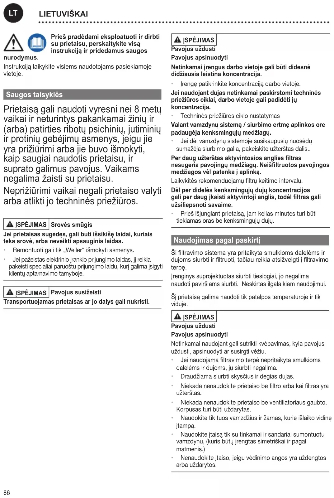 - Dujų molekulių virimo temperatūra > 0 °C. Siurbiantklijųgarusreikianaudotiplačiajuostįdujųltrą(be lakiųjųdaleliųltro). prastinė ir techninė priežiūra SPJIMAS Prieš atlikdami bet kokius darbus prietaise ištraukite iš lizdo kištuką. Įtaiso operatorius iš kiekvienos valdymo vietos, į kurią jis gali patekti, turi įsitikinti, jog kištukas yra ištrauktas. Draudžiama keisti prietaiso konstrukciją! Remontuoti gali tik „Weller“ išmokyti asmenys. Naudokite tik originalias WELLER atsargines dalis. Filtrų keitimas year MIN 1x Lakiųjų dalelių ltras ir plačiajuostis dujų ltras yra pritaikyti naudoti kartu, todėl juos galima kartu pakeisti kaip kompaktiškąjį ltrą. Smulkių dulkių ltras (ltravimo kilimėlis) naudojamas kaip kompaktiškojo ltro pirminis ltras, todėl jį reikia keisti dažniau. Primygtinai rekomenduojama 10 kartų pakeitus smulkių dulkių ltrą pakeisti ir kompaktiškąjį ltrą. Kadltravimosistemaveiktųtinkamai,reikiapakeisti kompaktiškąjįltrą,kaipnurodytatoliau.: